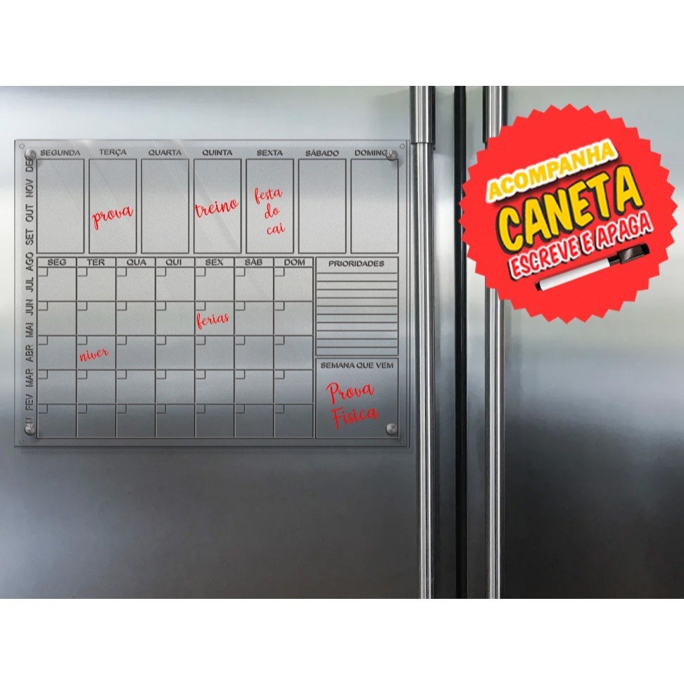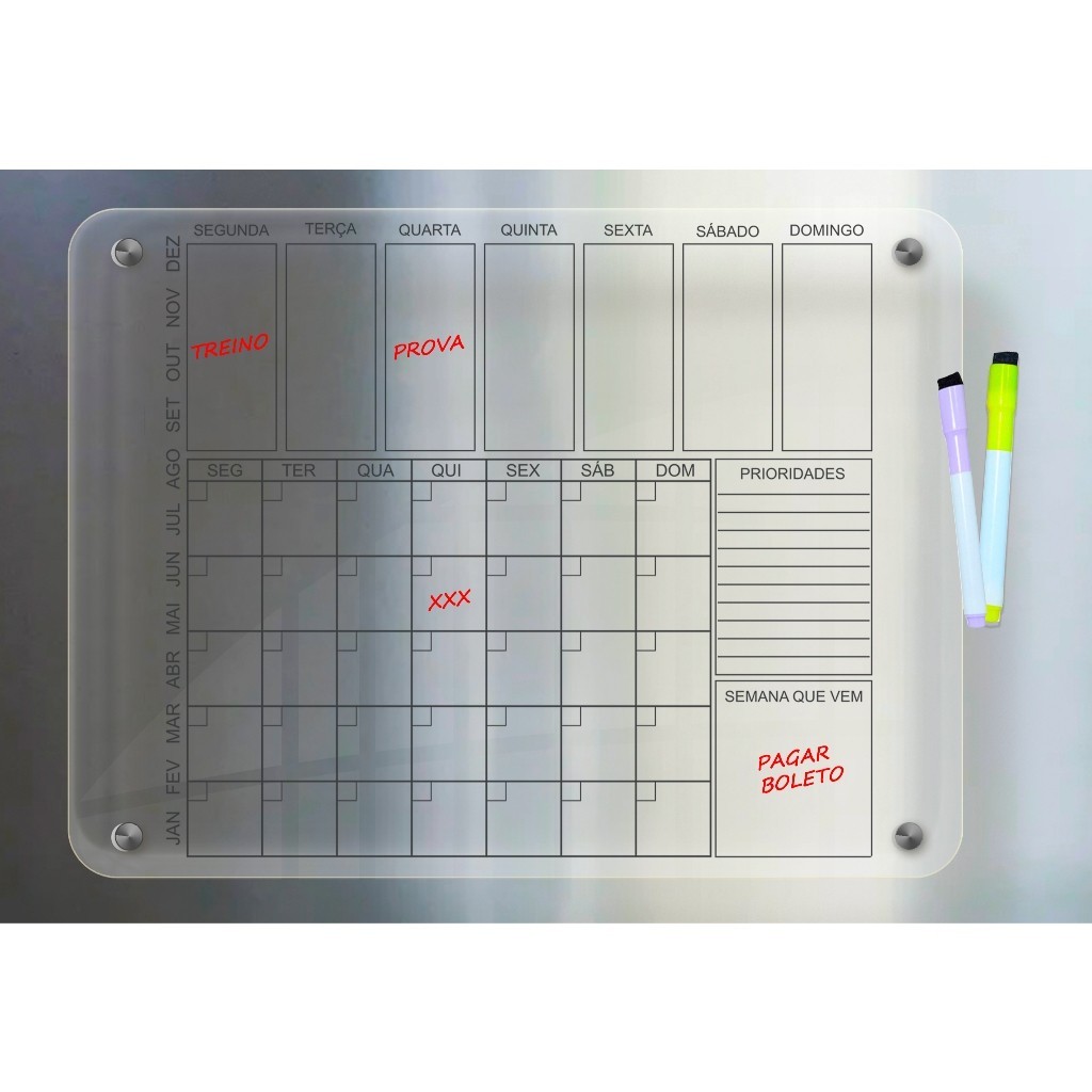 Ímã de Geladeira Lousa Planner Semanal e Mensal com Canetas e Apagador