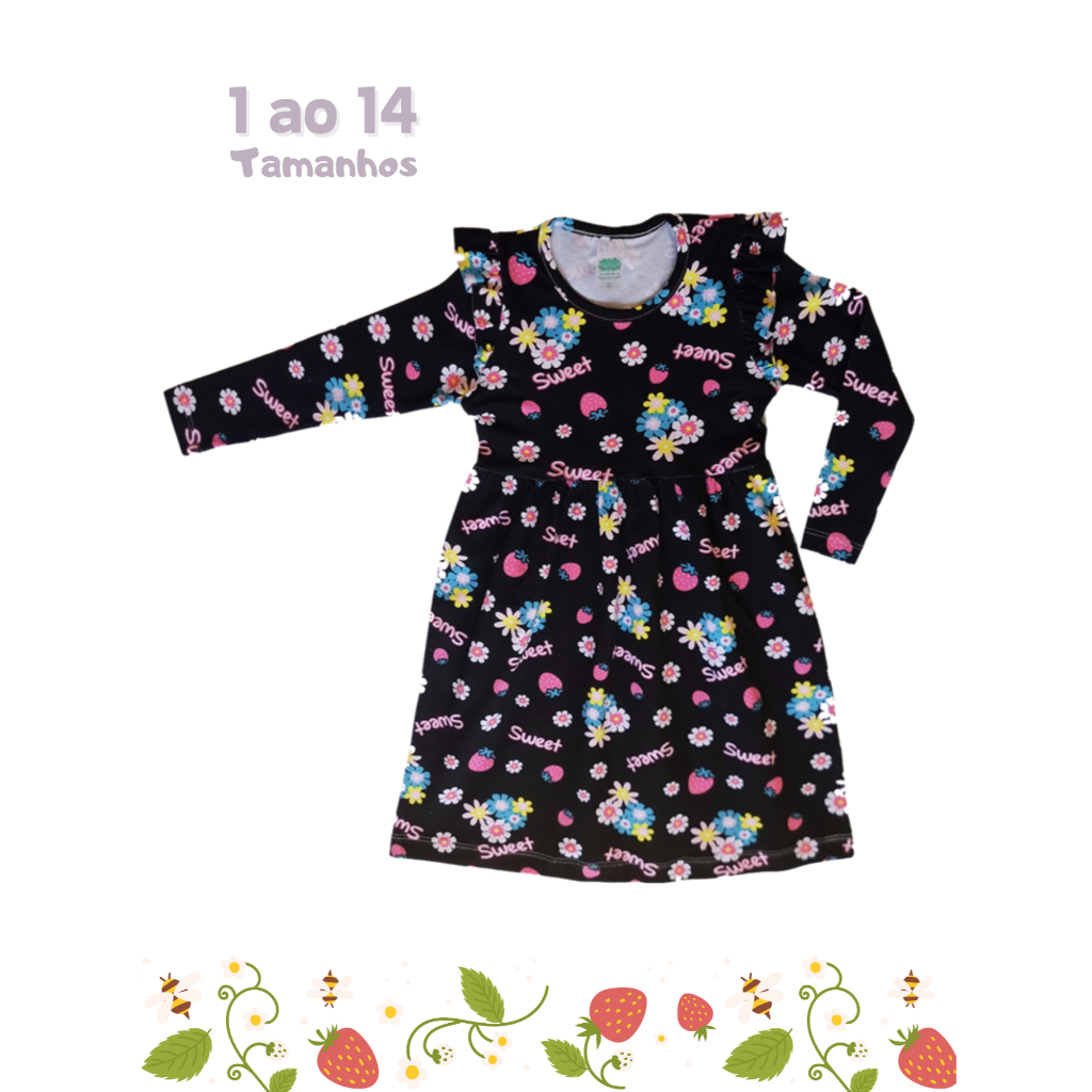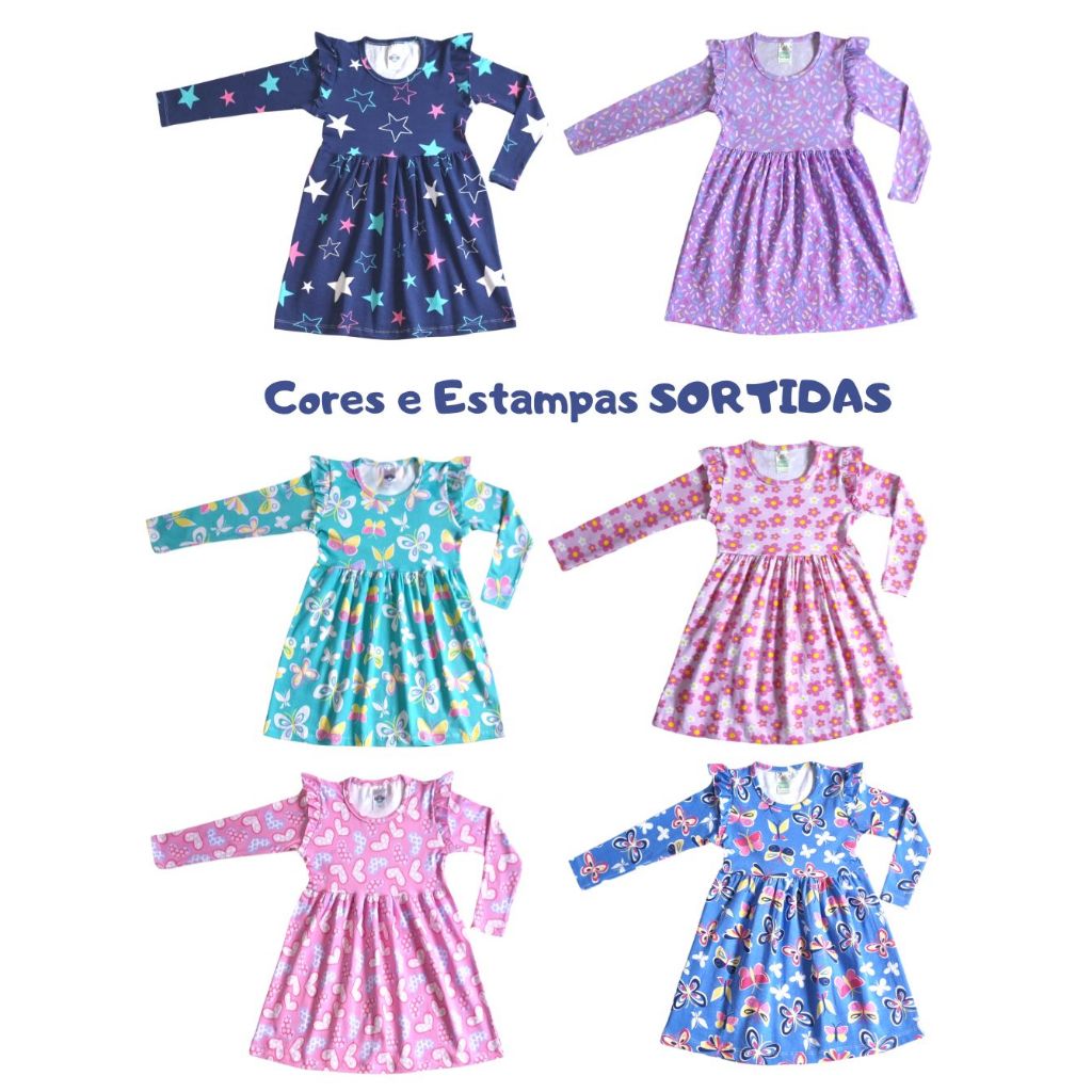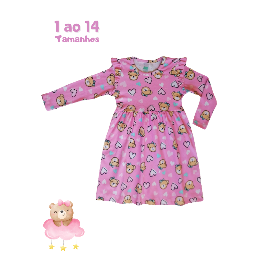 Vestido Princesa Meia Estação infantil 1 ao 14 Manga Longa em Cotom Estampado