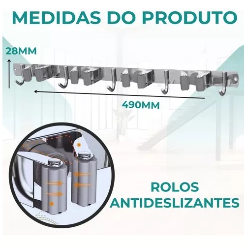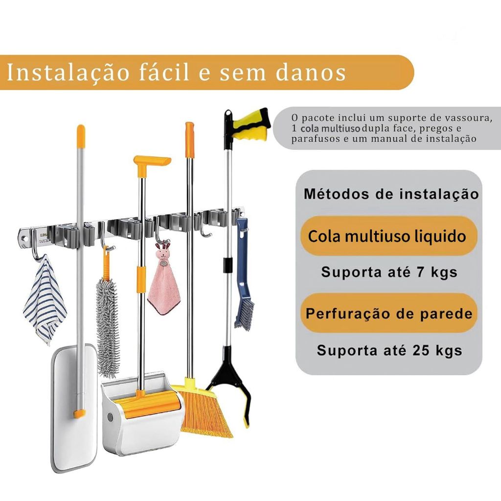 Suporte Vassoura Inox 4 suporte 5 Gancho grande Porta Vassoureiro OU 3 suporte 4 gancho