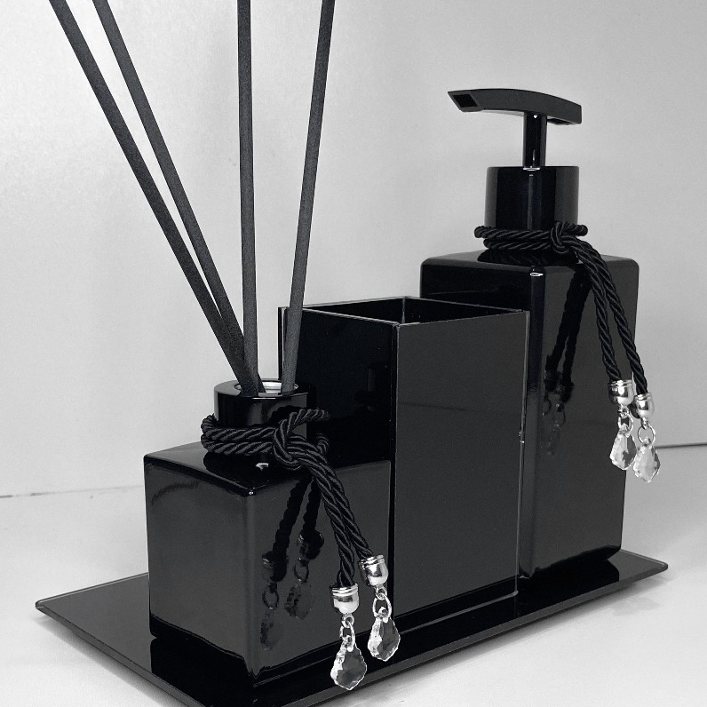 Kit Lavabo Preto Luxo e Moderno Porta Escova Sabonete Aromatizador C/ Bandeja