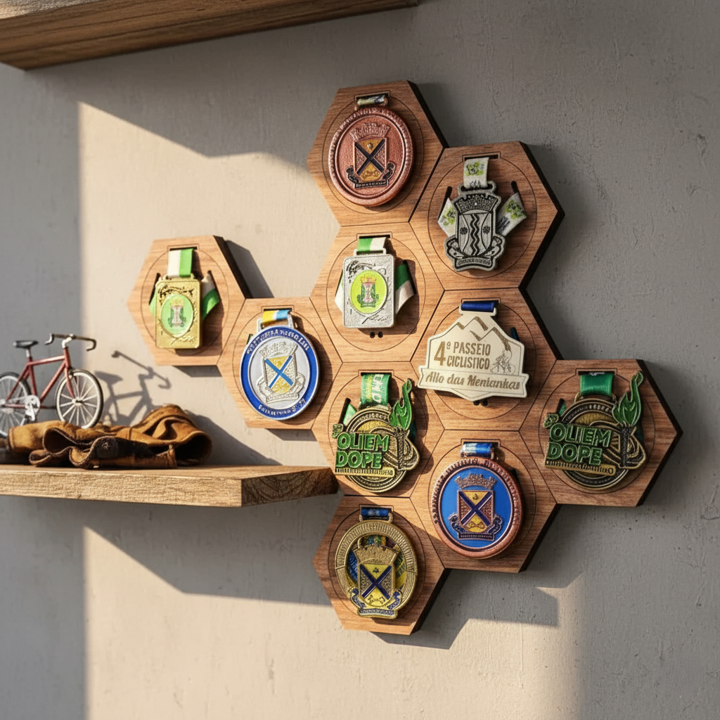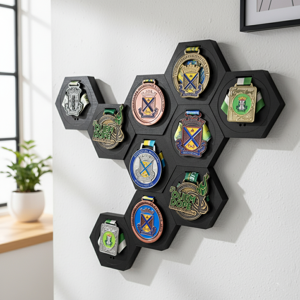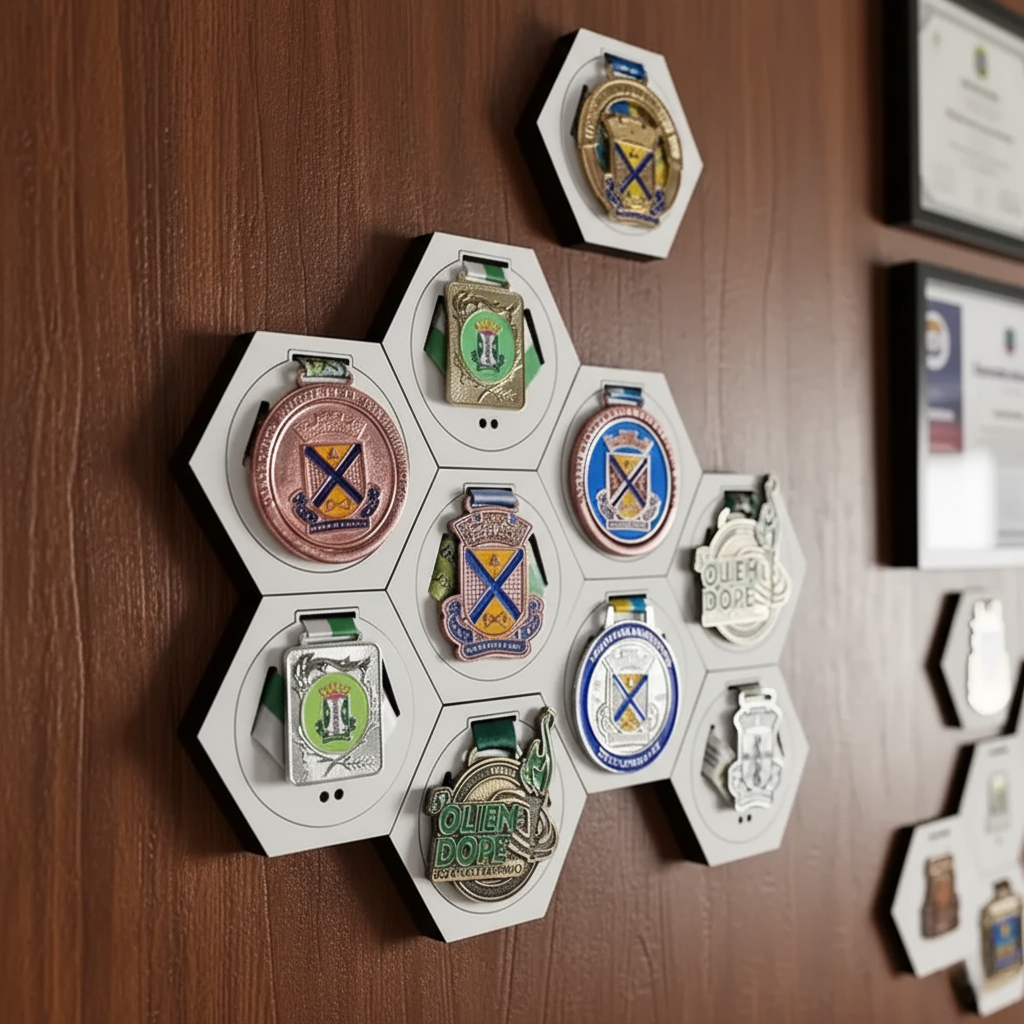 Porta Medalhas Hexagonal de MDF para Decoração de Parede Kit com 10 e 3 unidades de Porta Medalha