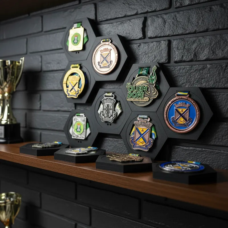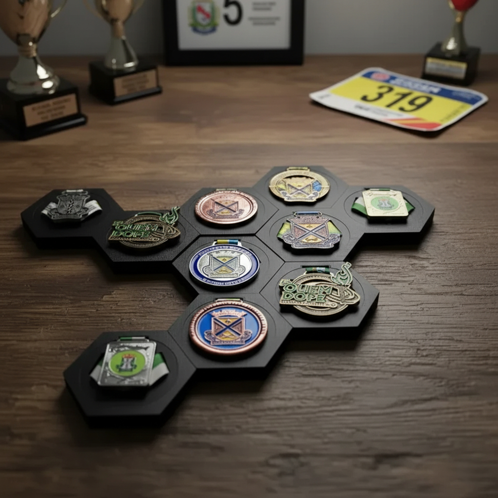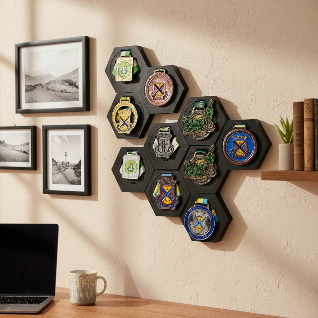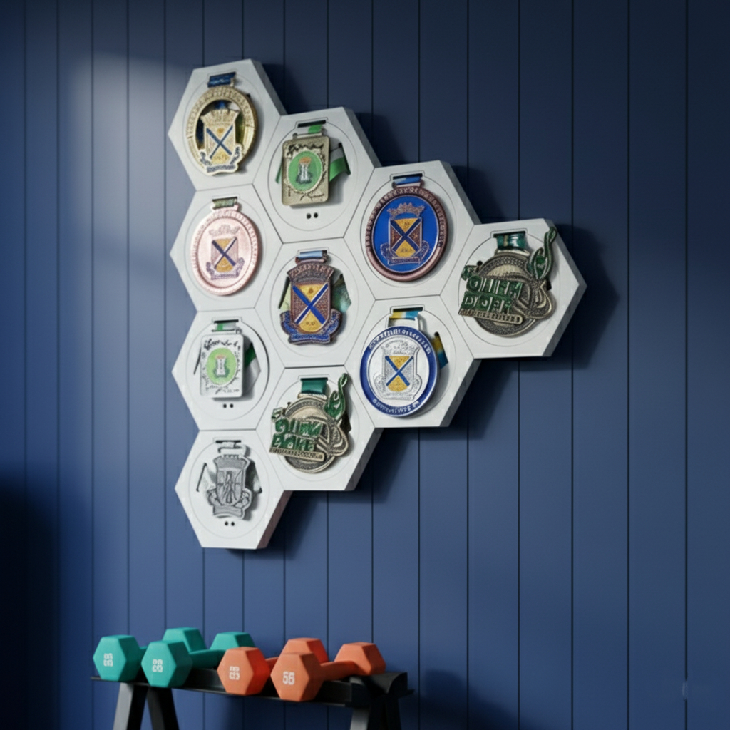 Porta Medalhas Hexagonal de MDF para Decoração de Parede Kit com 10 e 3 unidades de Porta Medalha