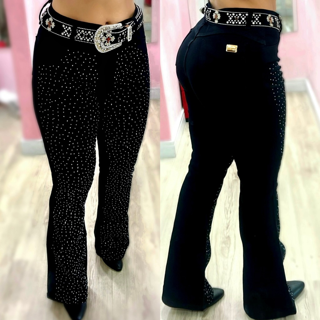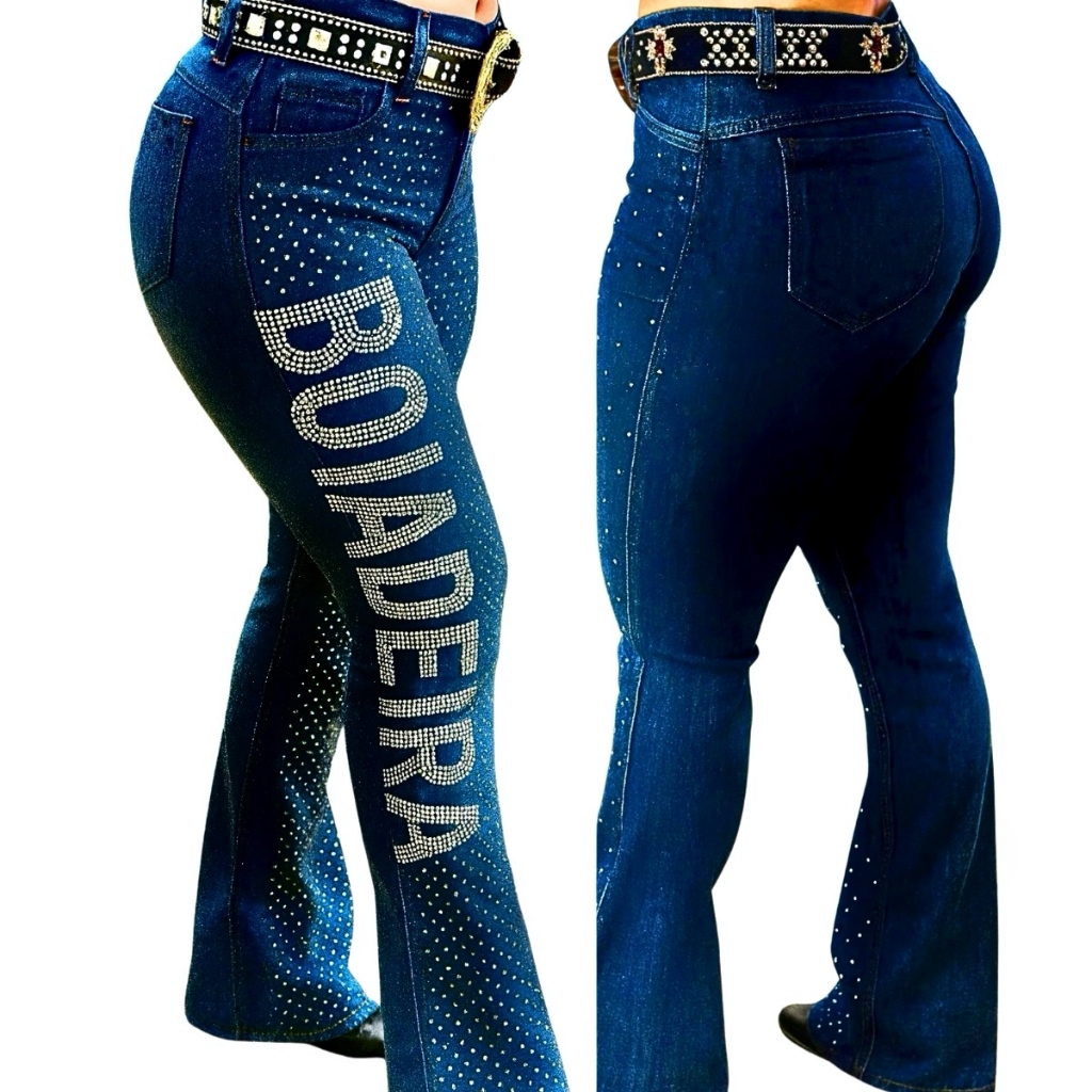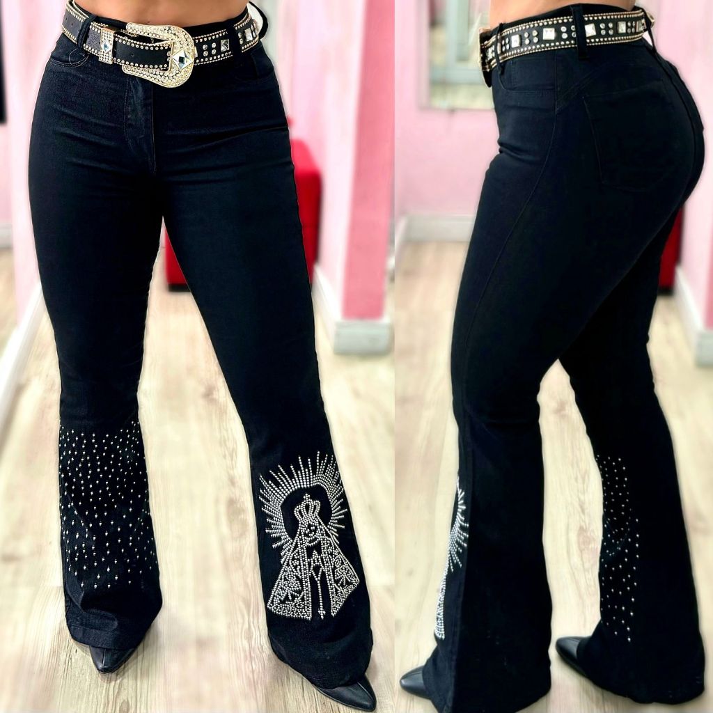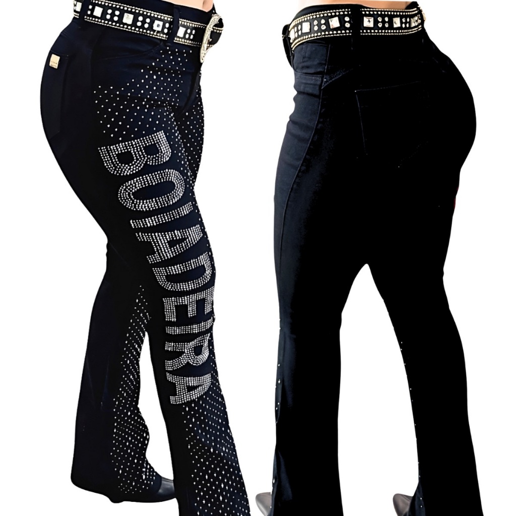 Calça Flare Jeans Feminina Country Rodeio de Luxo Cintura Alta com Strass
