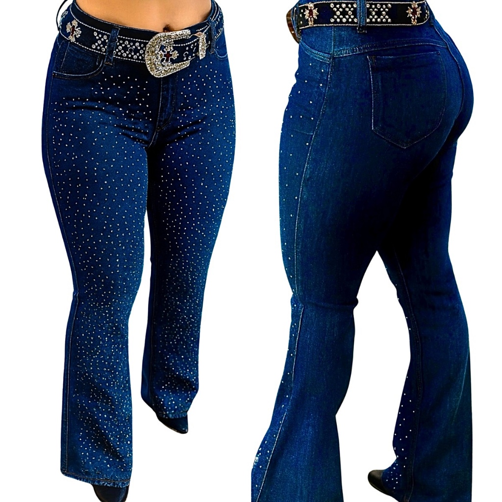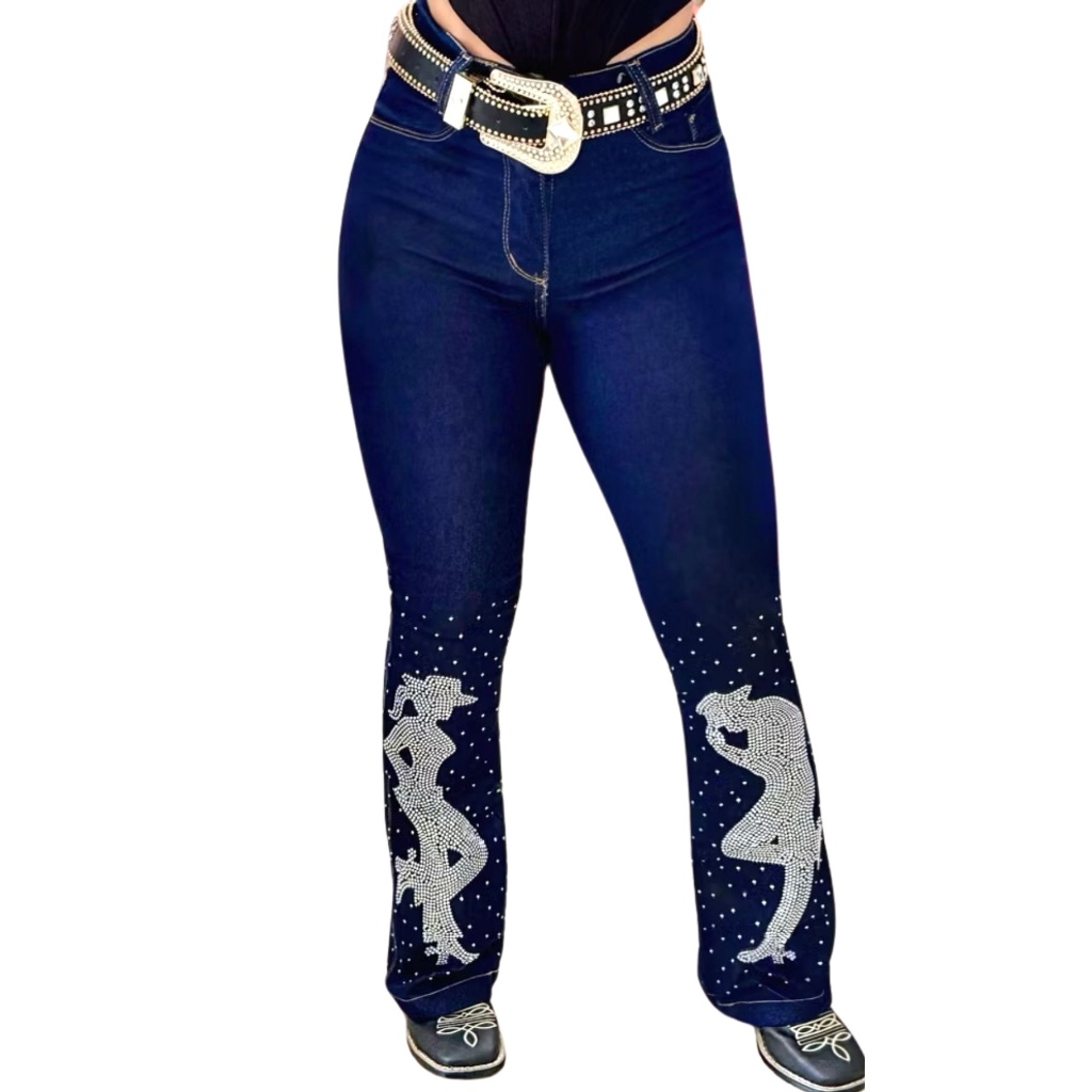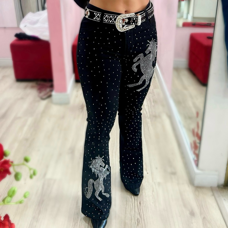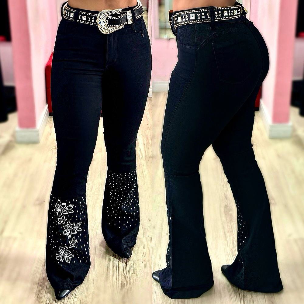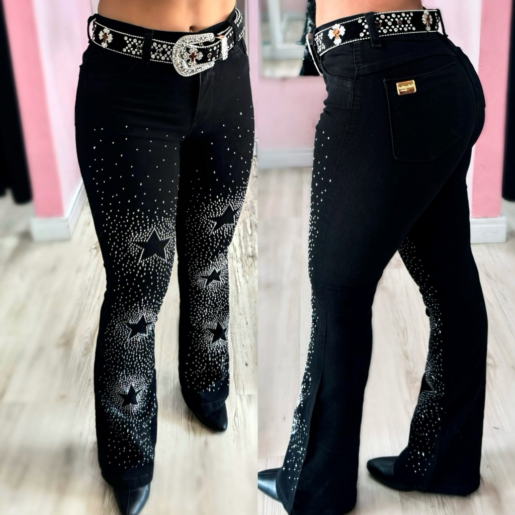 Calça Flare Jeans Feminina Country Rodeio de Luxo Cintura Alta com Strass
