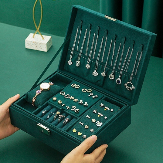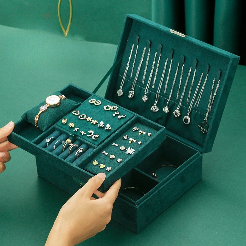 Porta joias veludo armazenamento 2 camadas de alta qualidade, caixa de joias de relógio requintado-CX7099