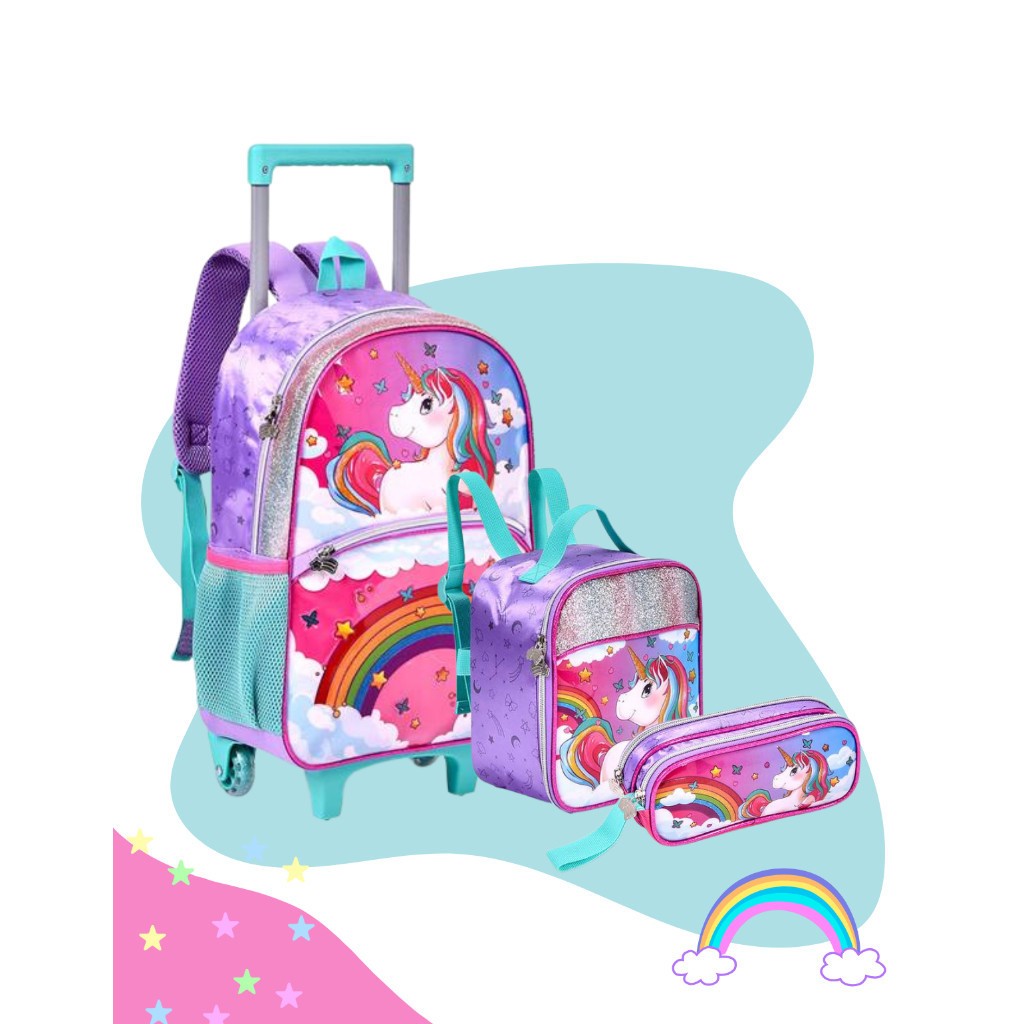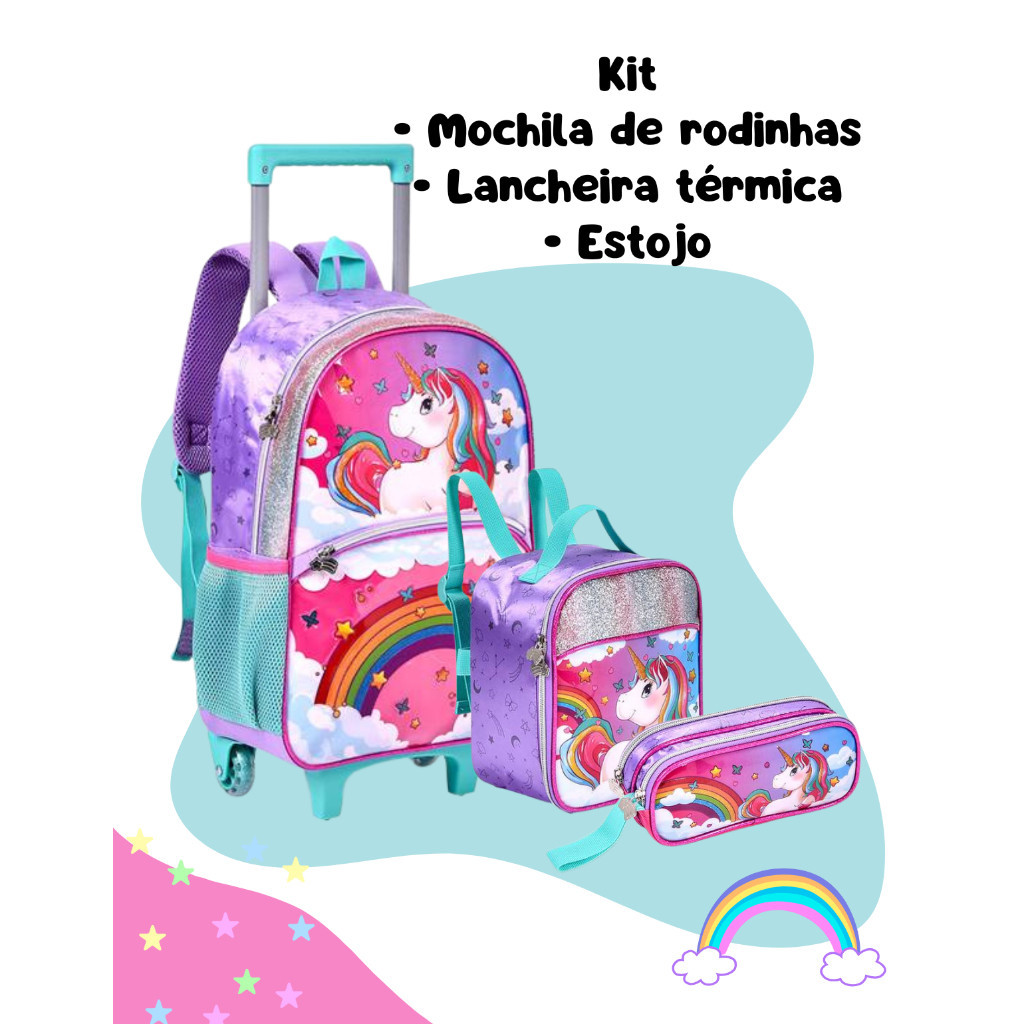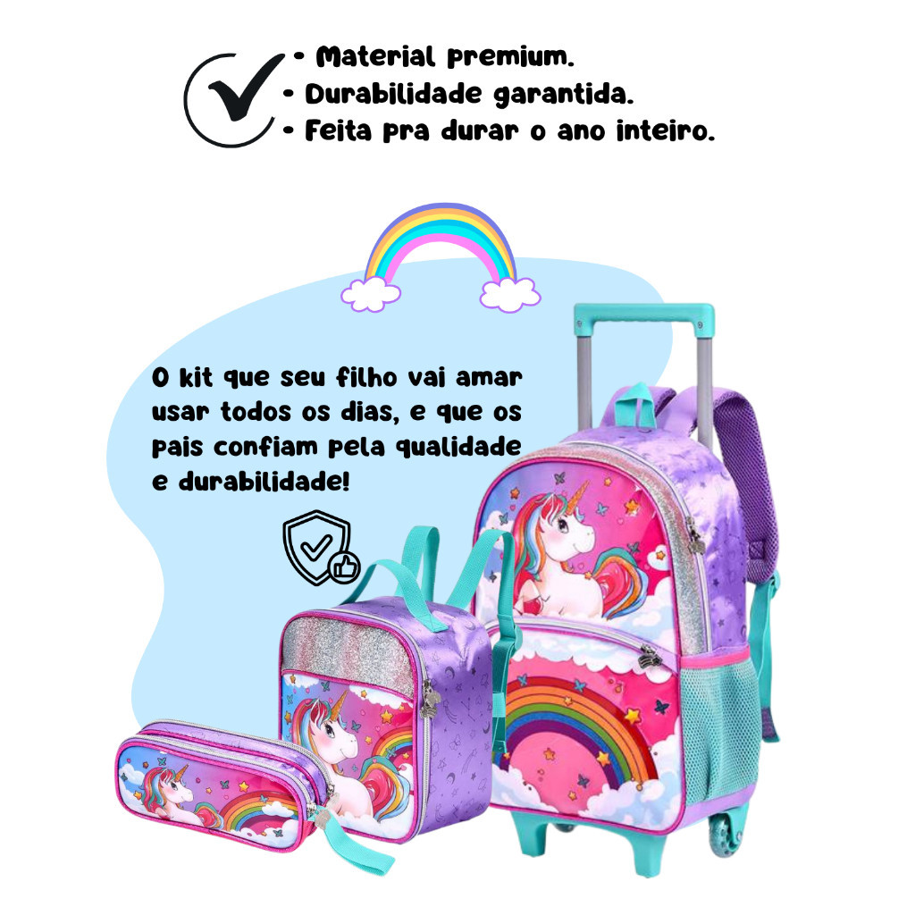 Kit Mochila Escolar Infantil de Rodinhas Menina Bolsa Resistente Impermeável Com Lancheira e Estojo Unicórnio Oficial