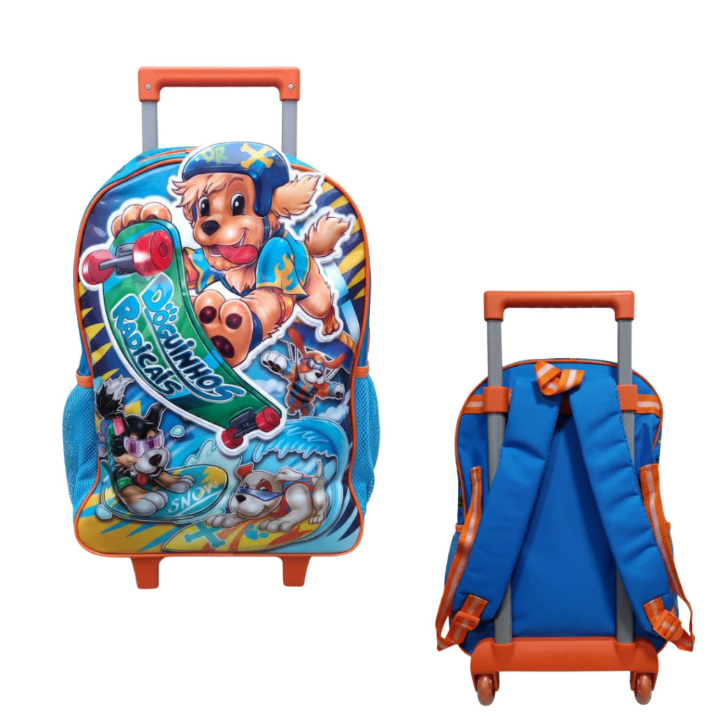 Mochila de Rodinhas Doguinhos Radicais | 3D | Infantil | Azul e Laranja – Clio Style