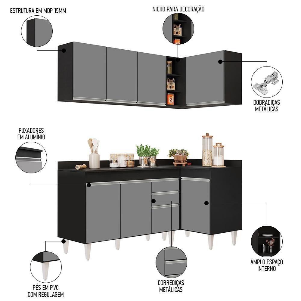 Armário de Cozinha Modulado de Canto Esquerdo 4 Peças CP47 Balcão com Tampo Preto/Cinza - Lumil
