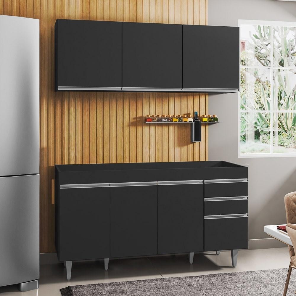 Armário Aéreo Argélia e Balcão Gabinete Para Pia 150cm sem Tampo Marrocos Preto - Lumil Móveis