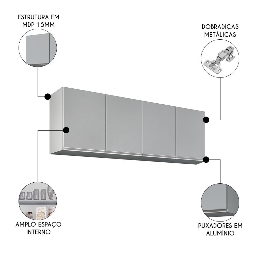 Armário de Cozinha Aéreo 160cm 4 Portas Nevada Cinza Claro - Lumil