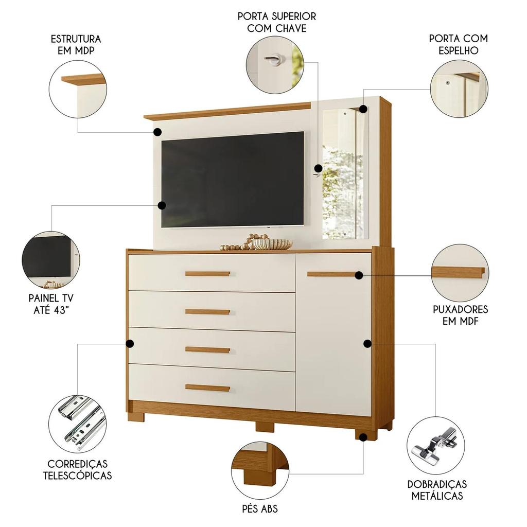 Cômoda Para Quarto com Painel TV 43 Pol Azaleia A02 Off/Cinamomo - Mpozenato