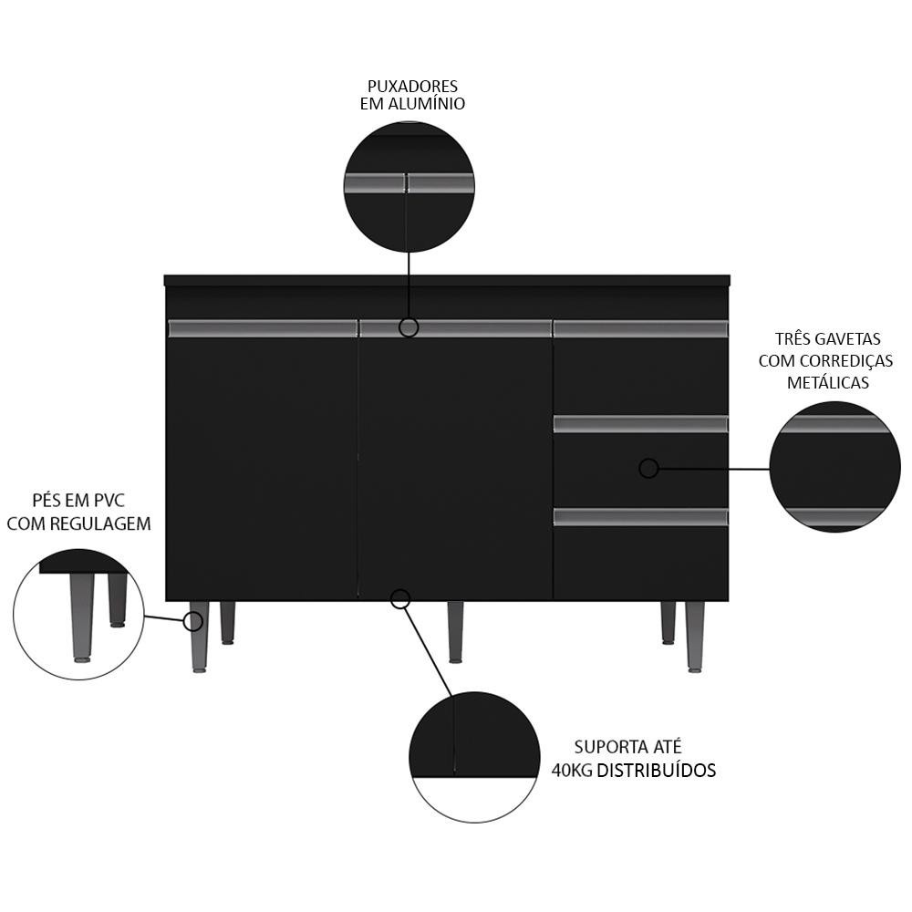 Balcão Gabinete com Pia Inox 120cm 2 Portas 3 Gavetas Andréia Preto Total - AJL Móveis
