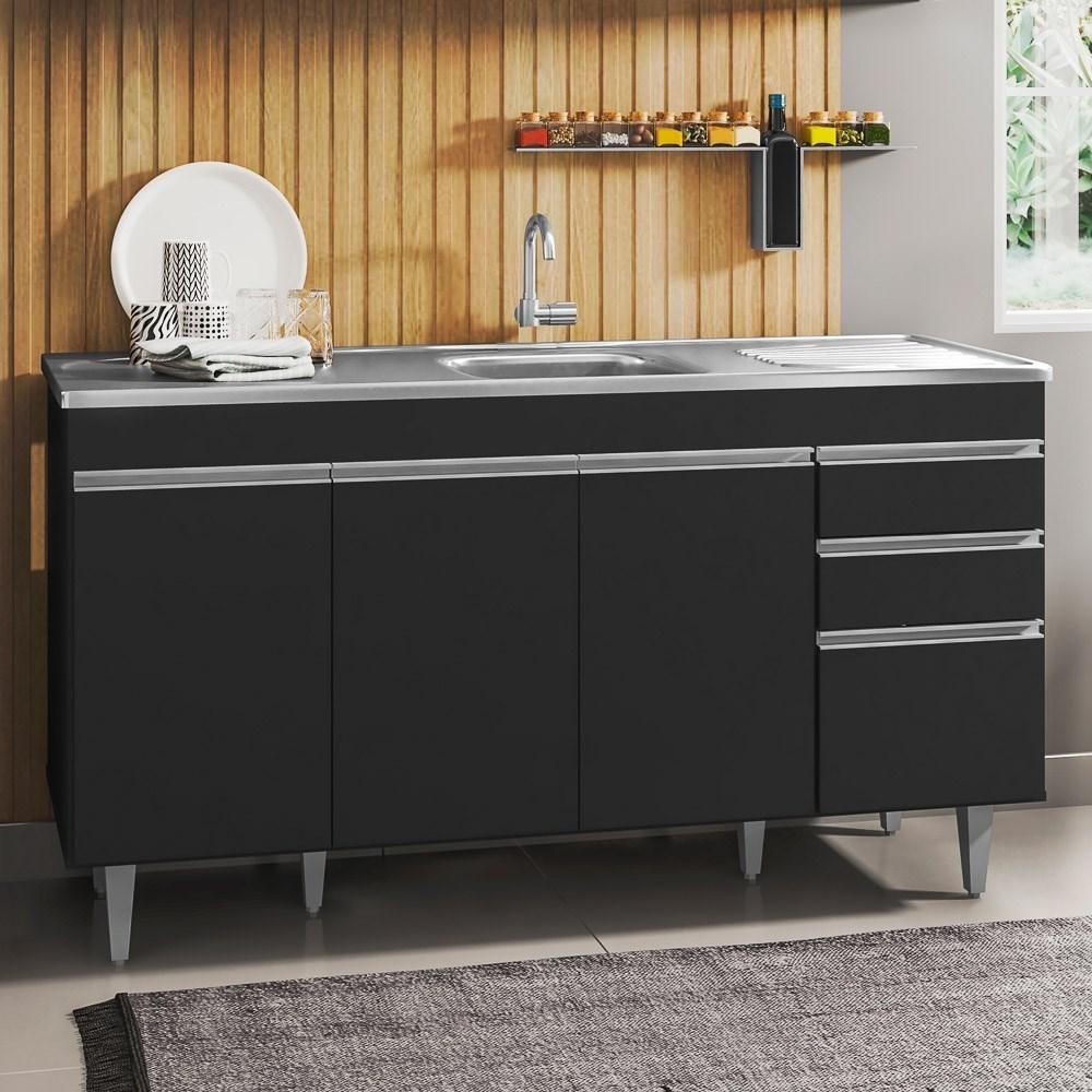 Balcão Gabinete com Pia Inox 150cm 4 Portas 2 Gavetas Marrocos Preto - Lumil
