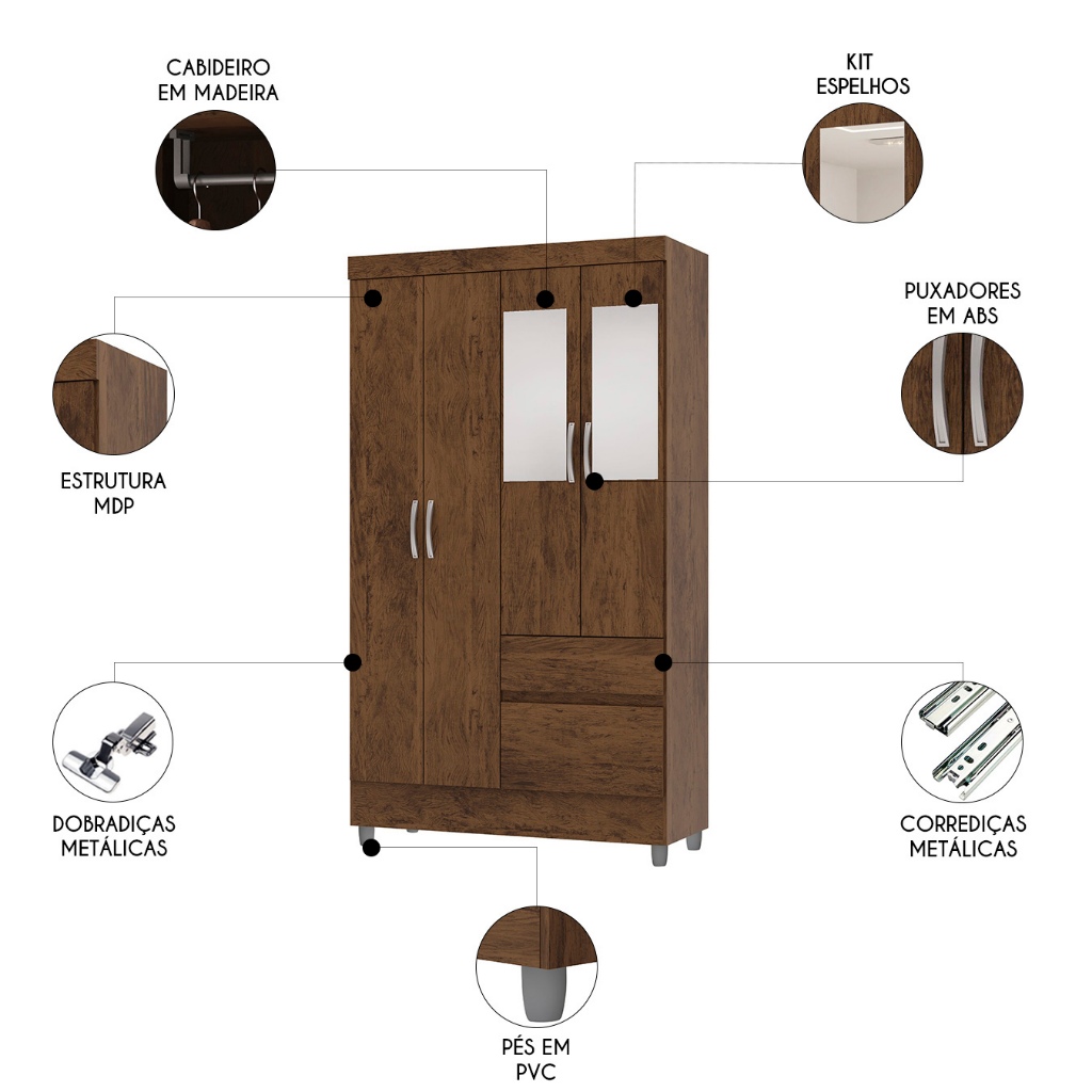 Guarda Roupa Solteiro 103cm Com Espelho Mayra Imbuia Rústico V02 - Mpozenato