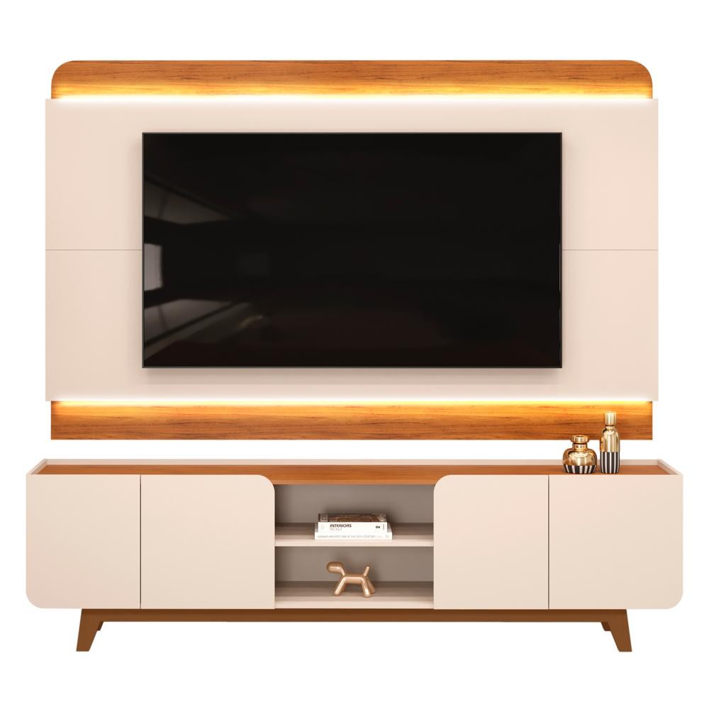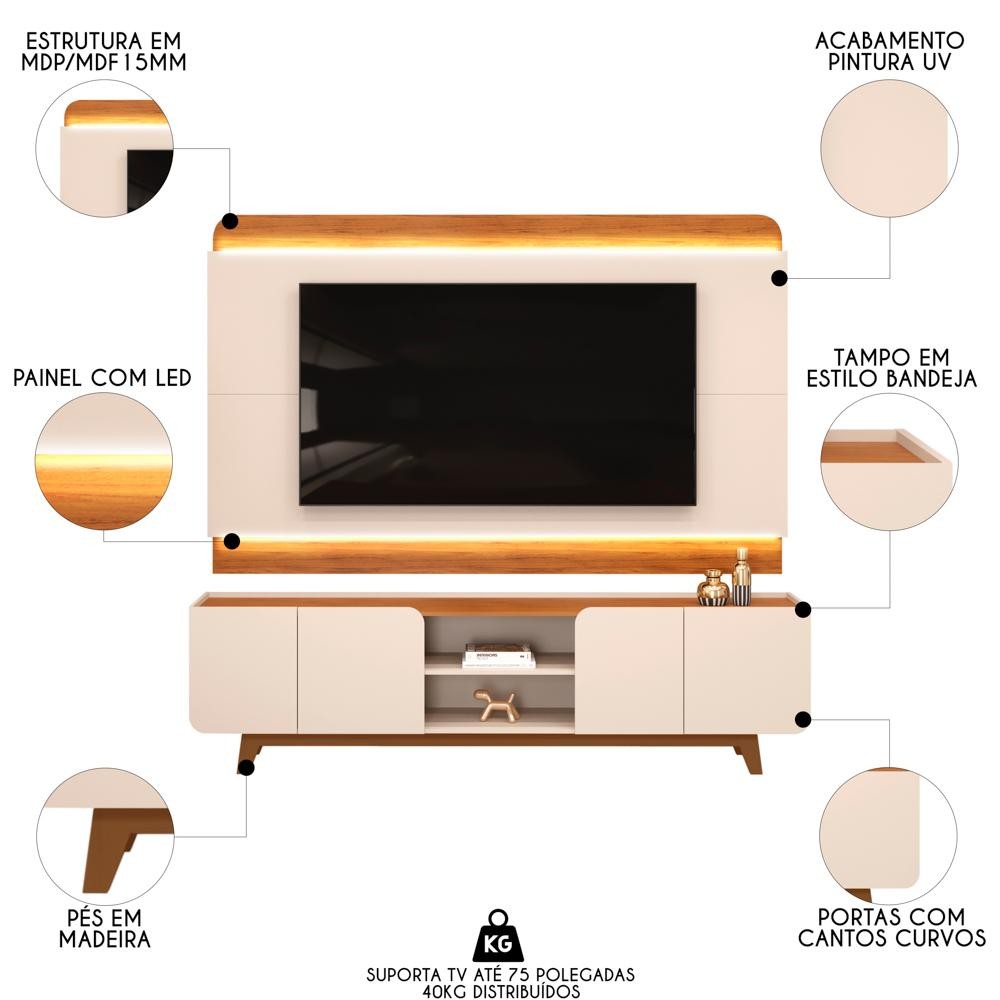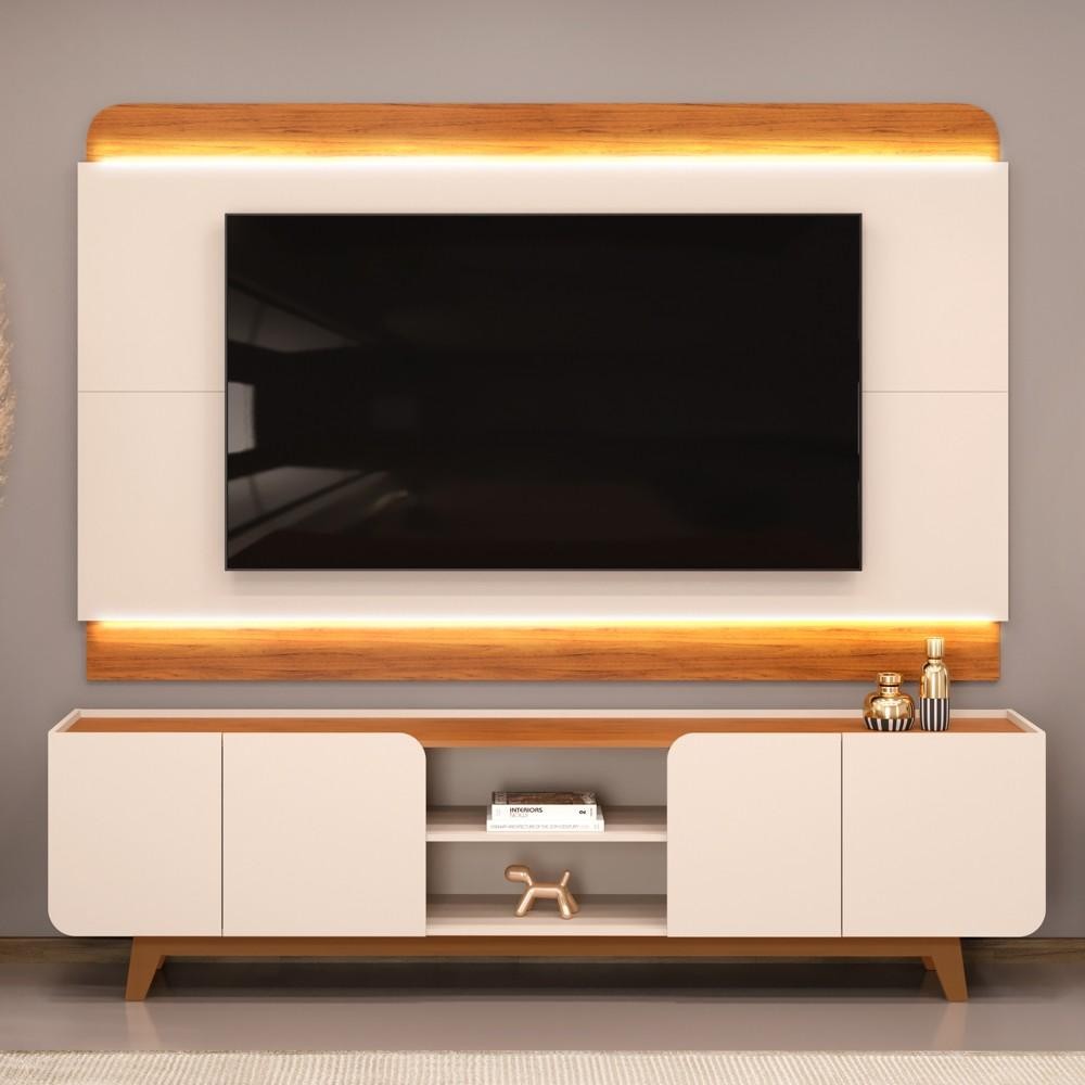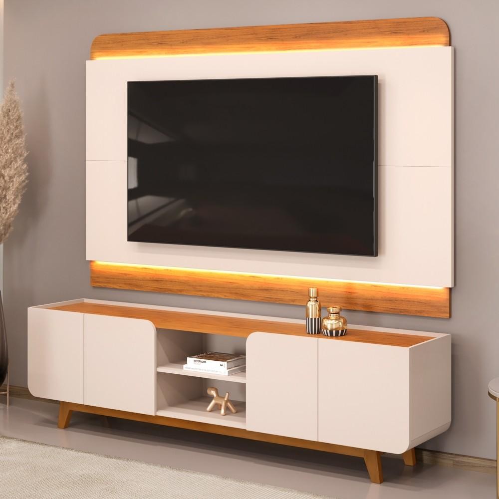 Painel Para TV 75 Pol e Rack Bancada Com LED 220cm Collie D04 Off White/Freijó - Mpozenato