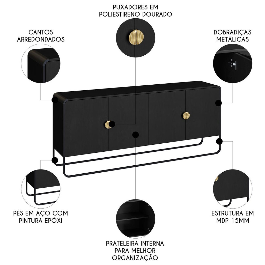 Buffet Aparador Sala 180cm 4 Portas Mario Preto/Nero A10 - Mpozenato
