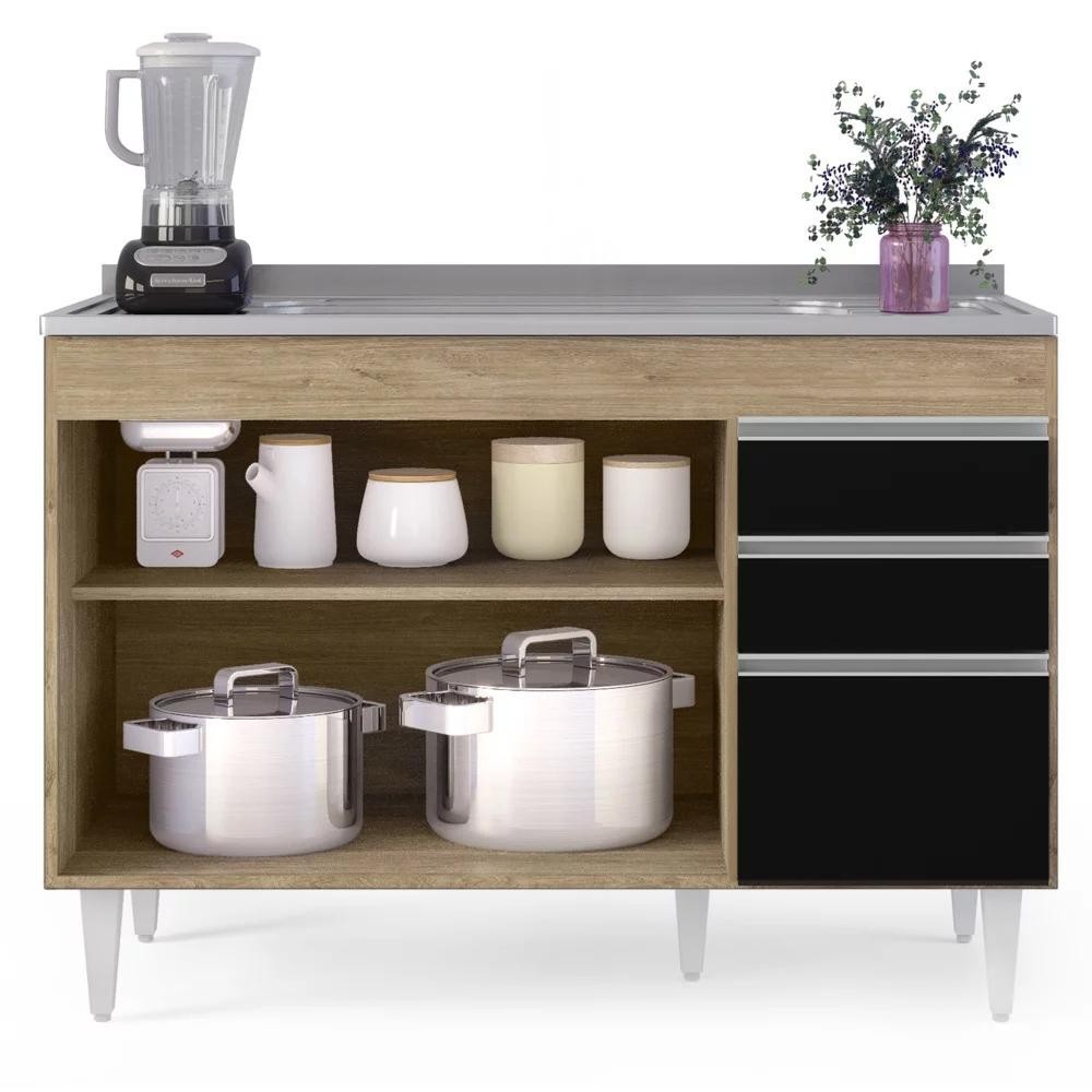 Armário de Cozinha Modulado de Canto 6 Peças CP30 com Pia Inox Castanho/Preto - Lumil