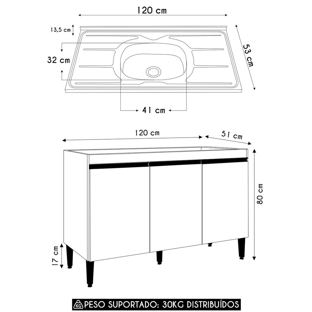 Balcão de Cozinha com Pia Inox 120cm Manu Amêndoa/Branco - AJL Móveis