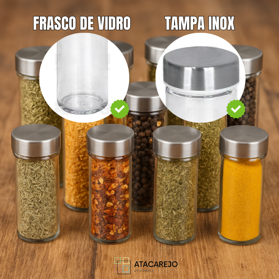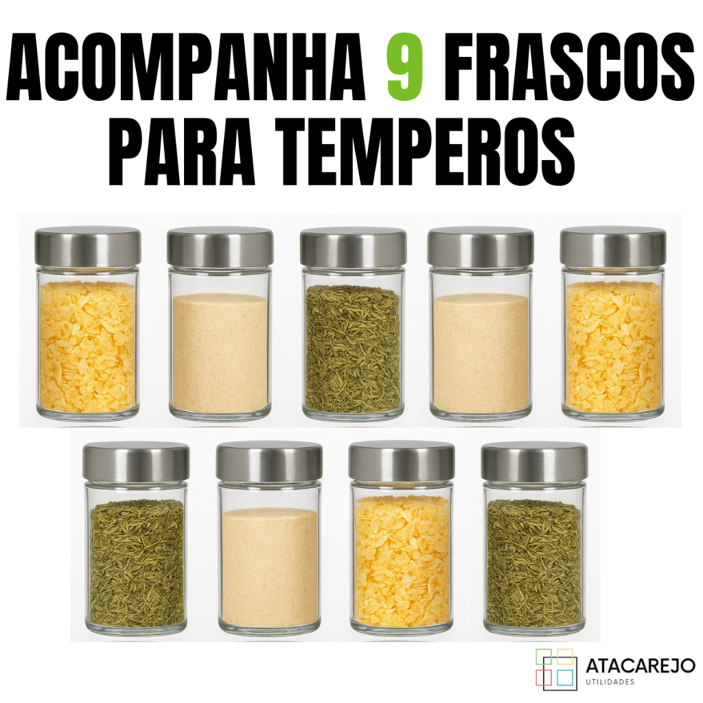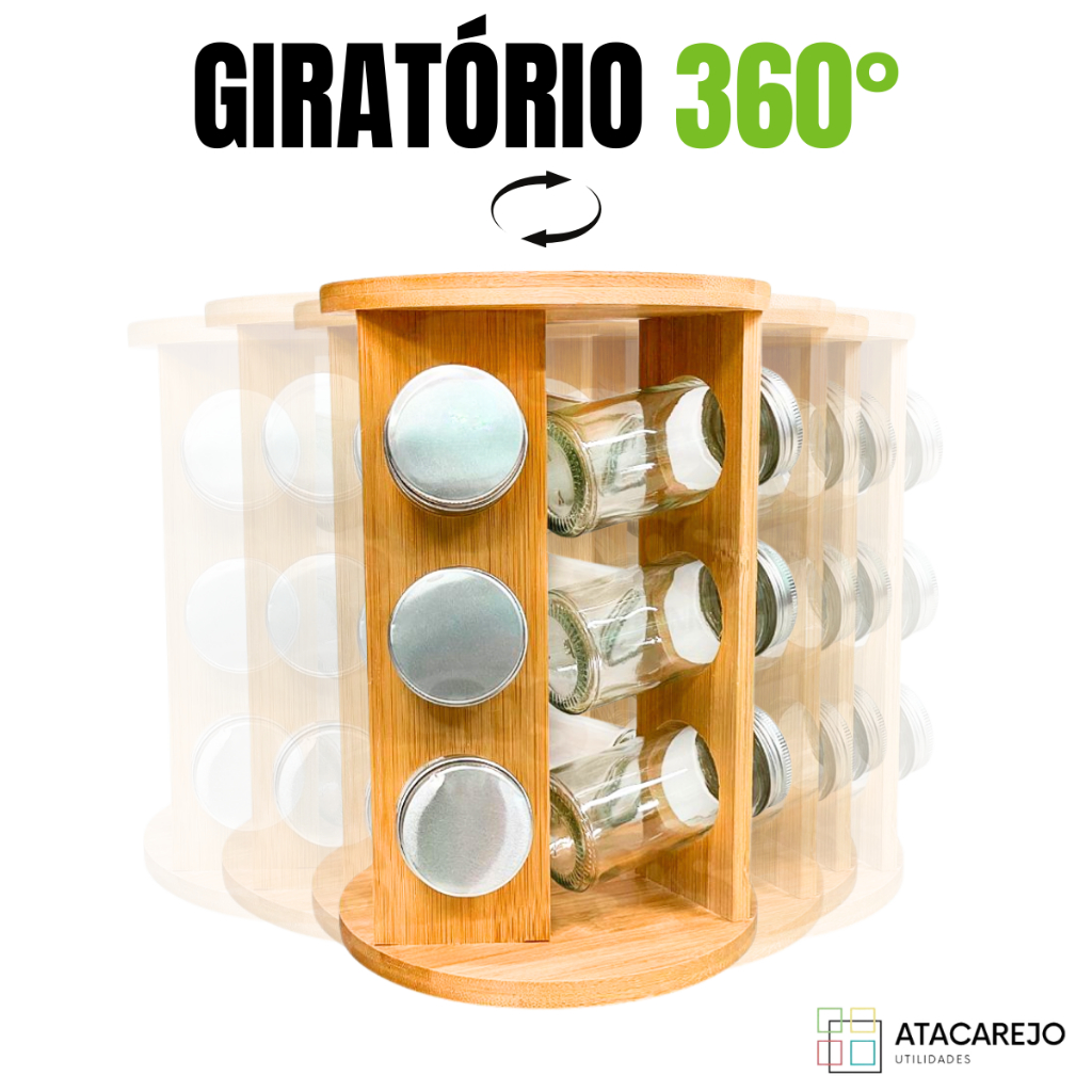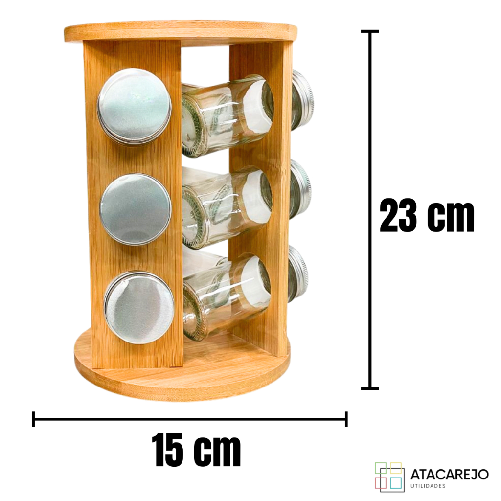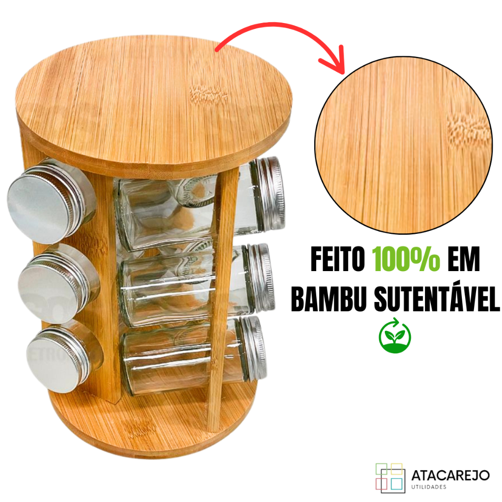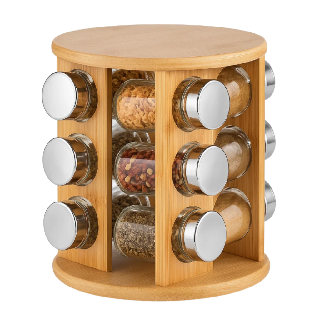 Porta Temperos Giratório em Bambu com 9 Potes de Vidro – Organizador de Cozinha