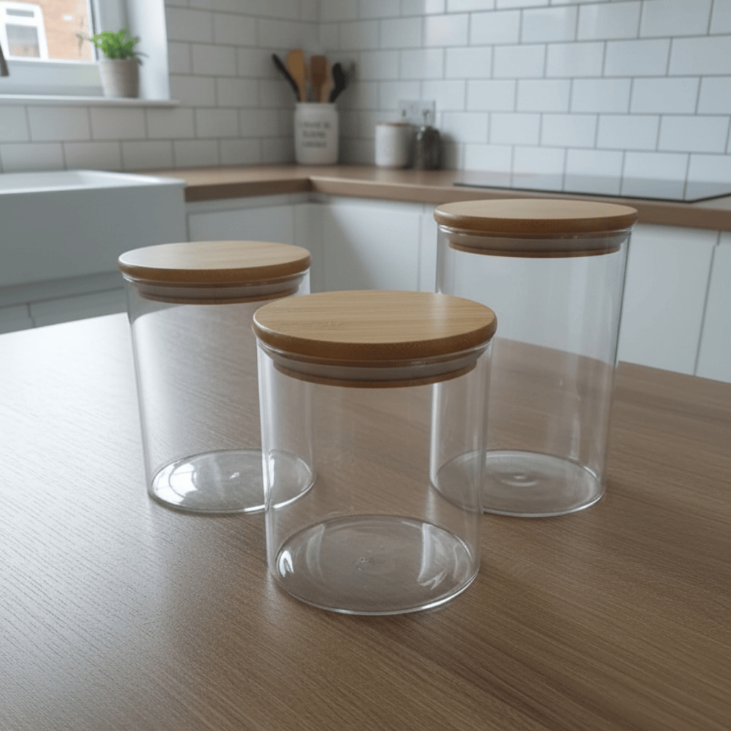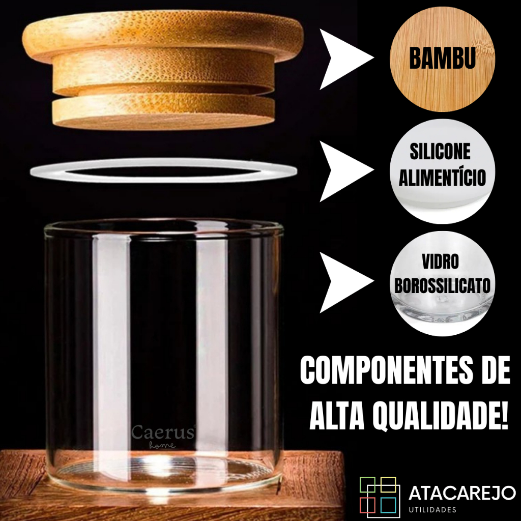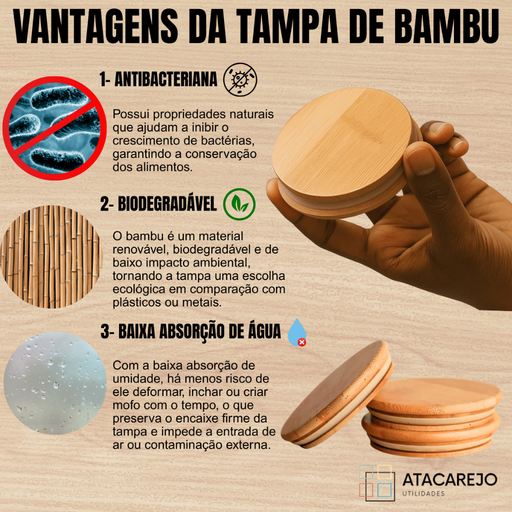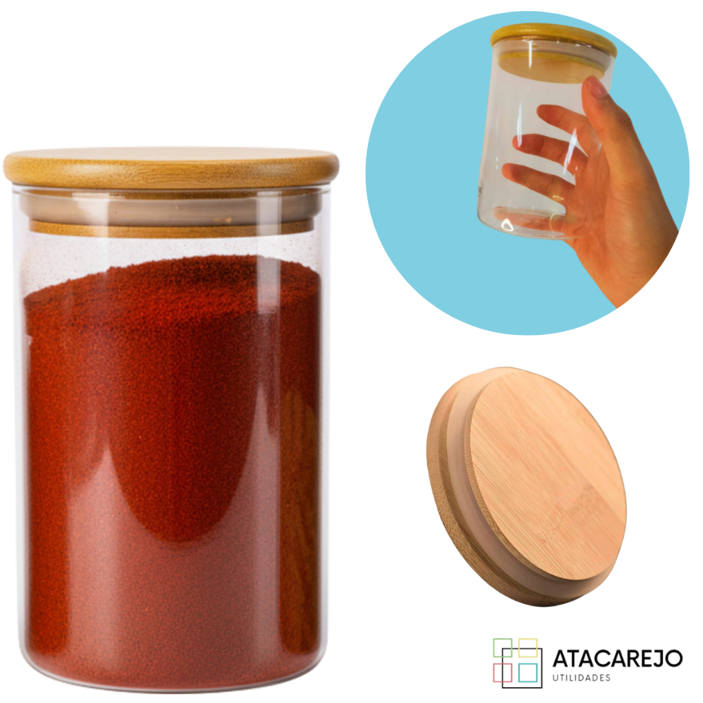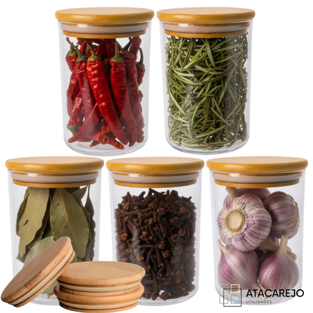 Kit de 10 Potes Hermético Vidro Redondo Tampa De Bambu 500ml