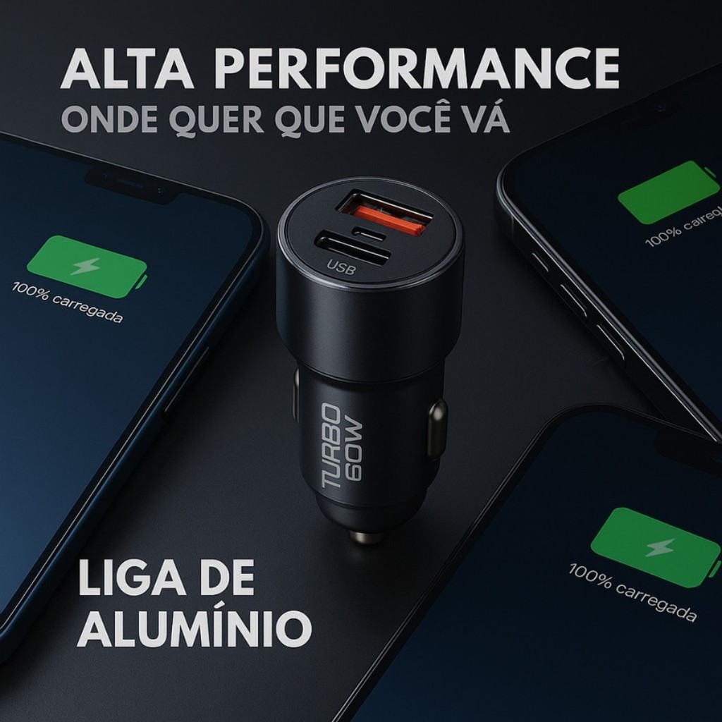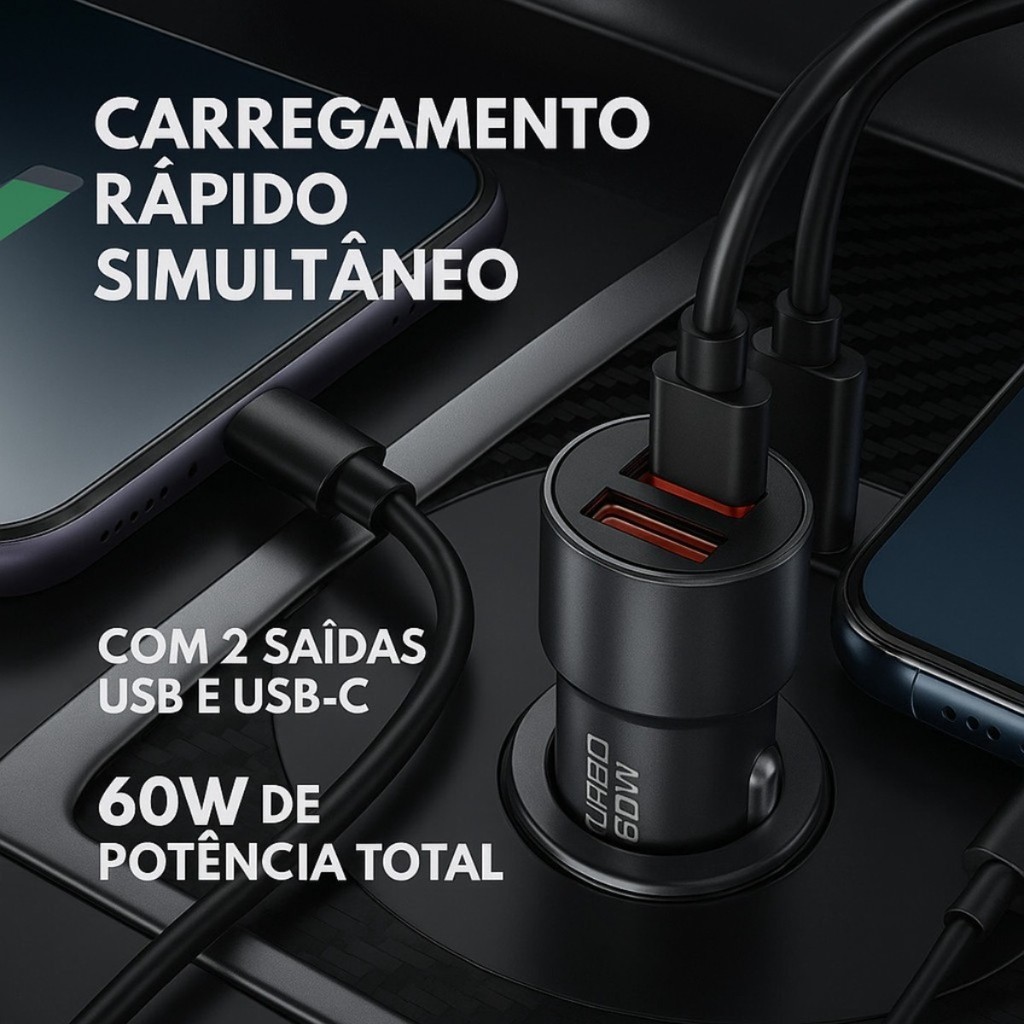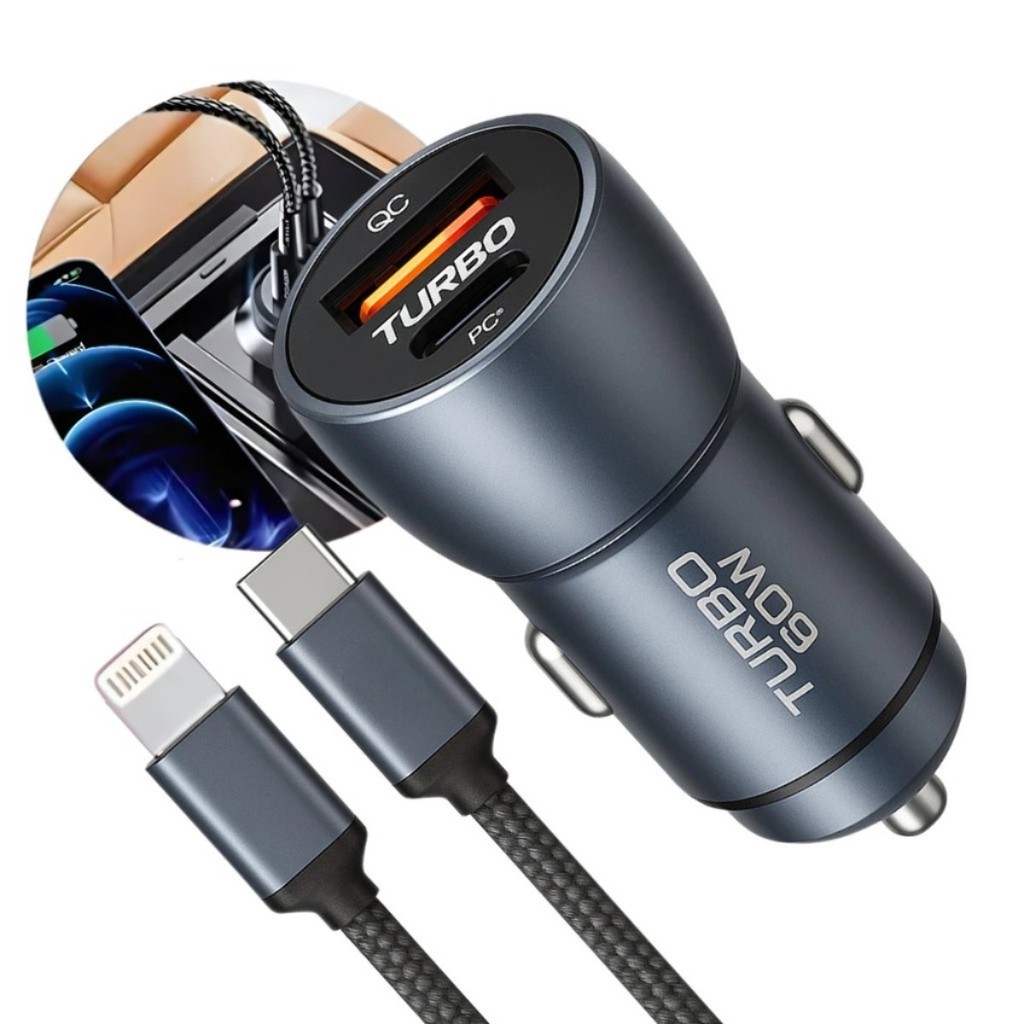 Carregador de Carro Rápido 60W USB-C + QC 4.0 com Cabo Lightning para iPhone