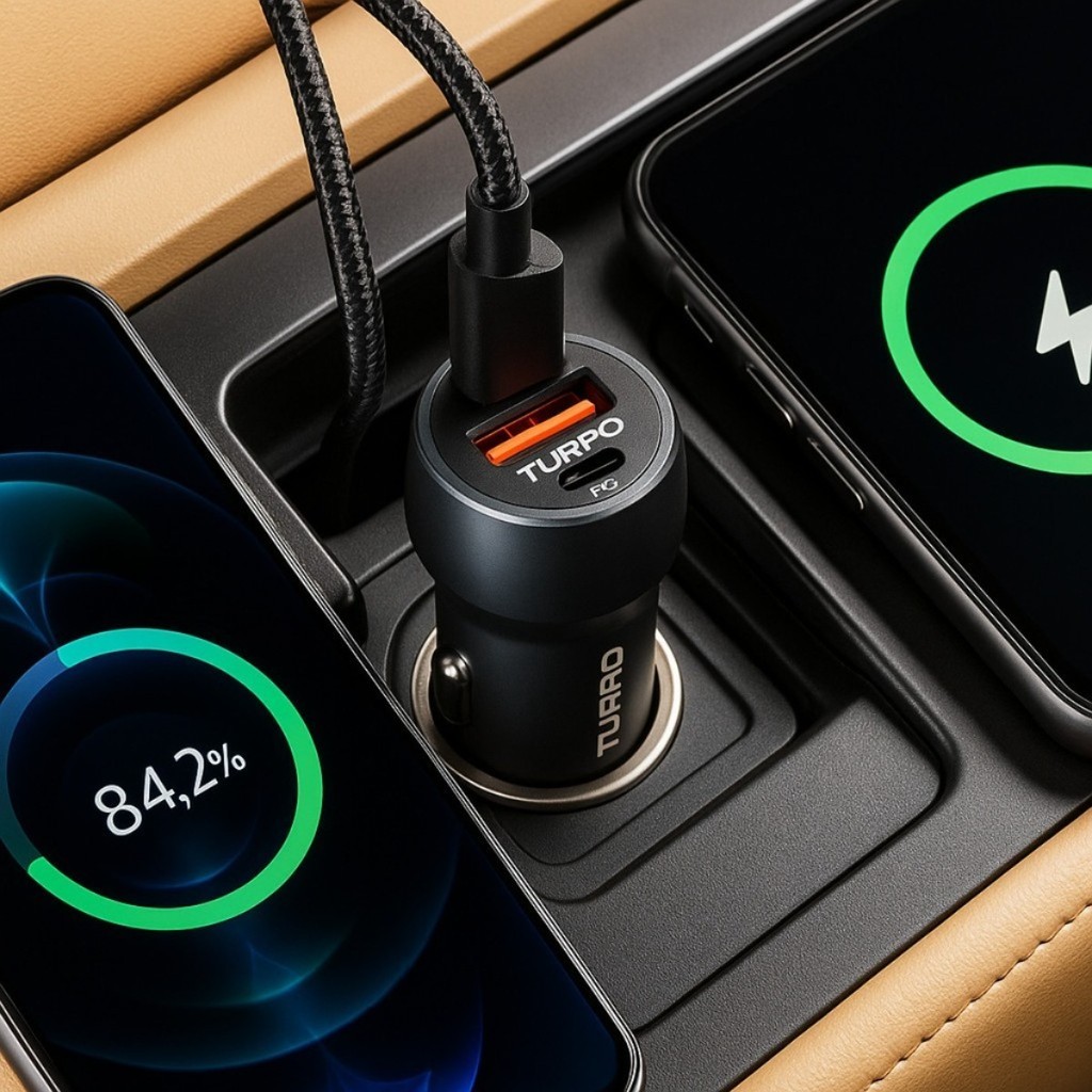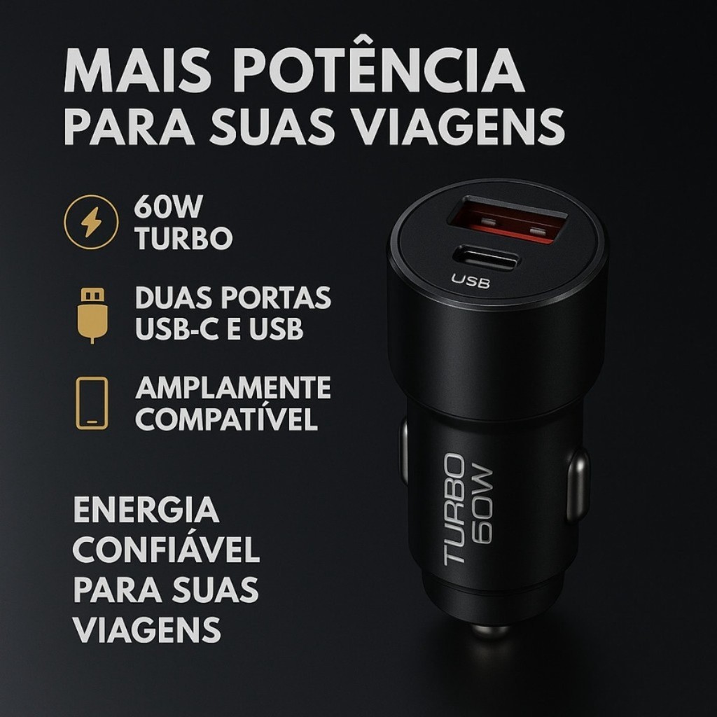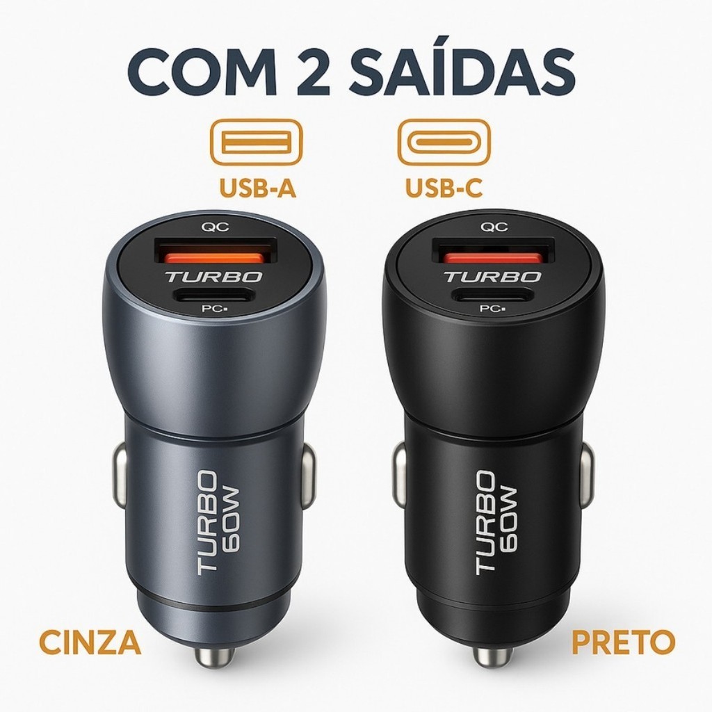 Carregador de Carro Rápido 60W USB-C + QC 4.0 com Cabo Lightning para iPhone