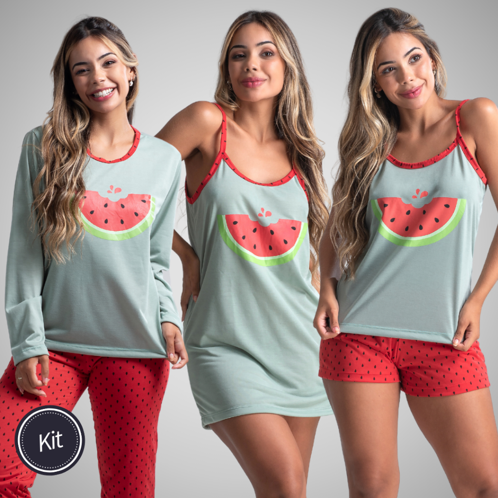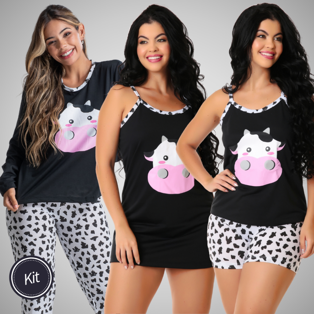 Kit Linha Noite Estampado Short Doll Alcinha Camisola Curta Modal Pijama Longo Inverno Moda Feminina 369