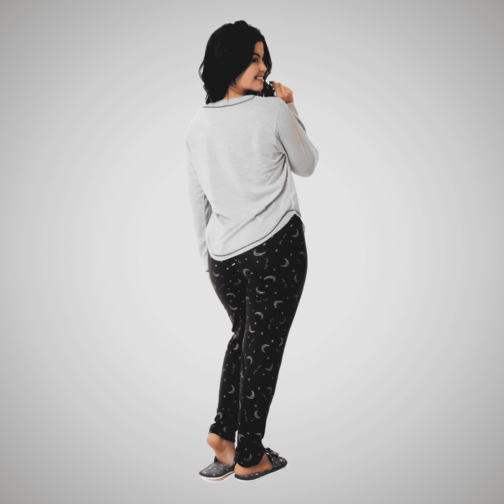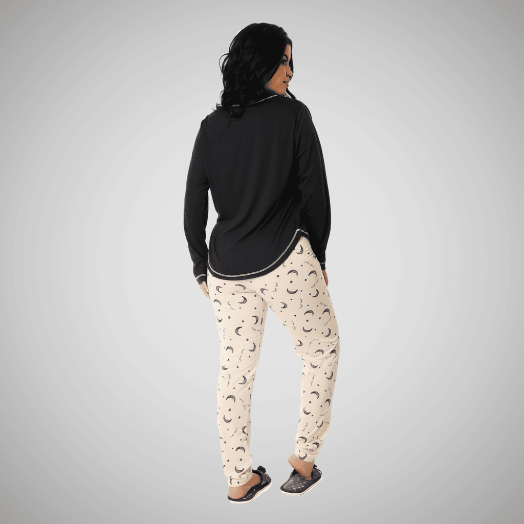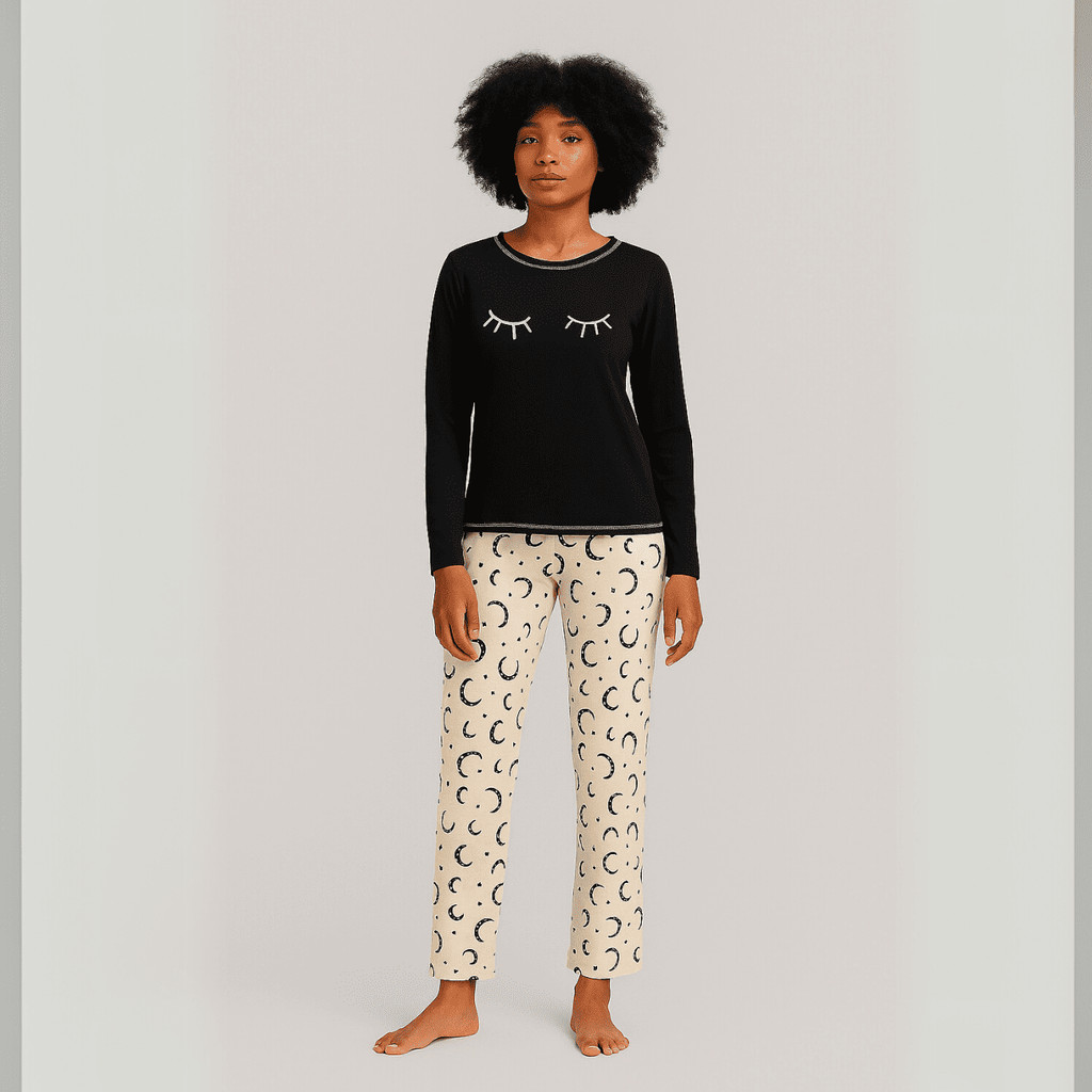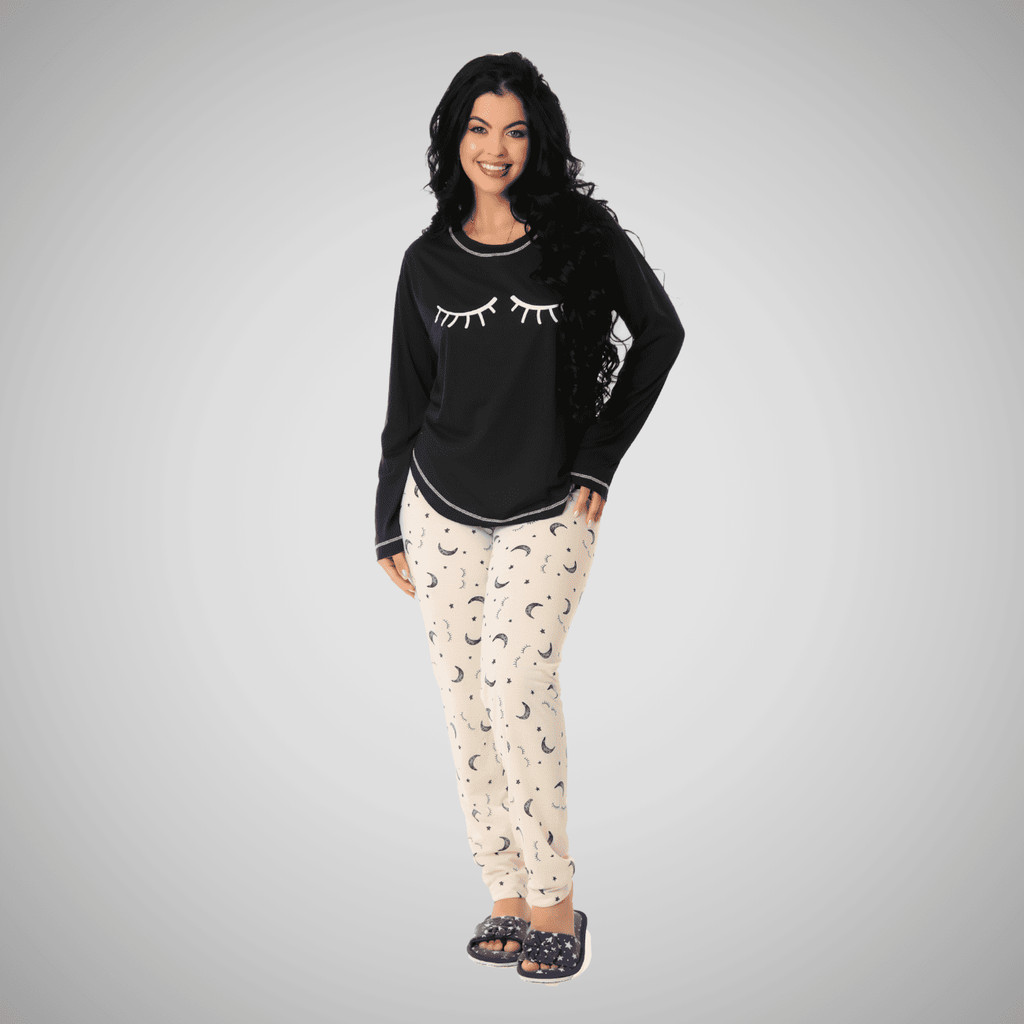 Pijama Longo Feminino Malha Adulto Manga Comprida Cílos Lua