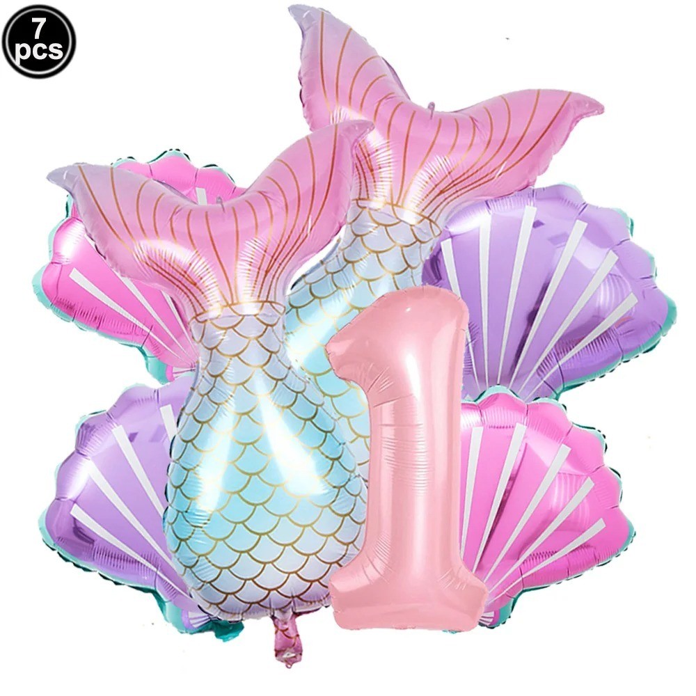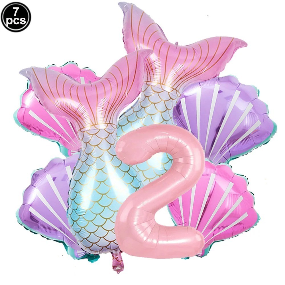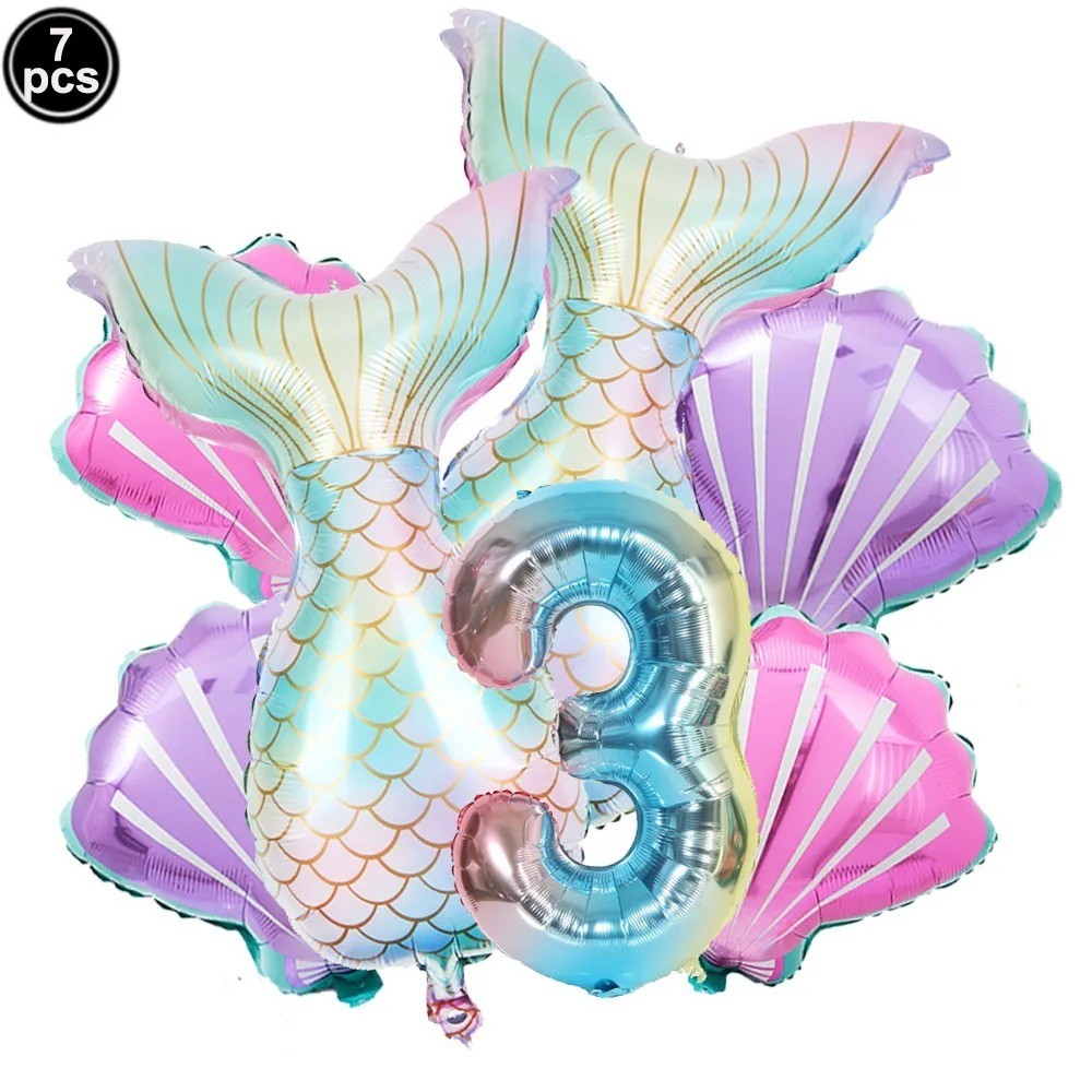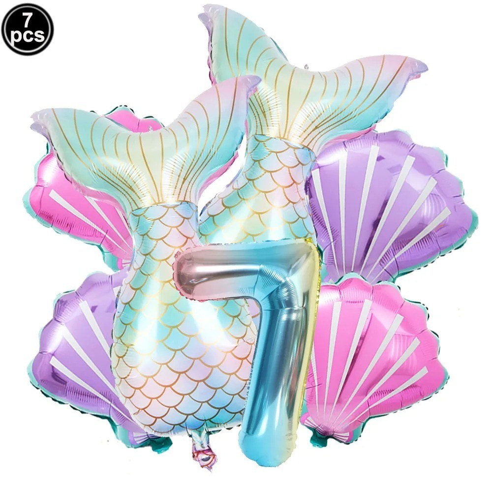 Balão Sereia + Número Kit com 7 Balões Metalizados Fundo do Mar Festa Aniversário Decoração Cauda Sereia Conchas Rabo