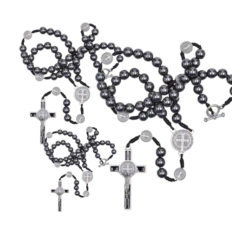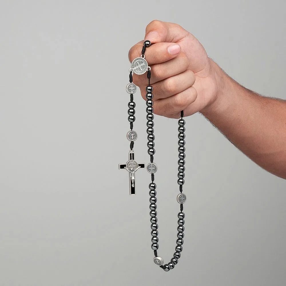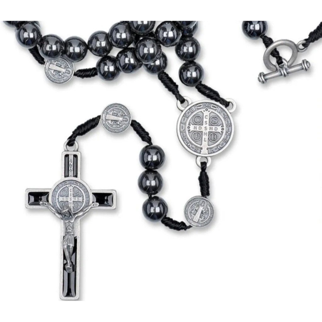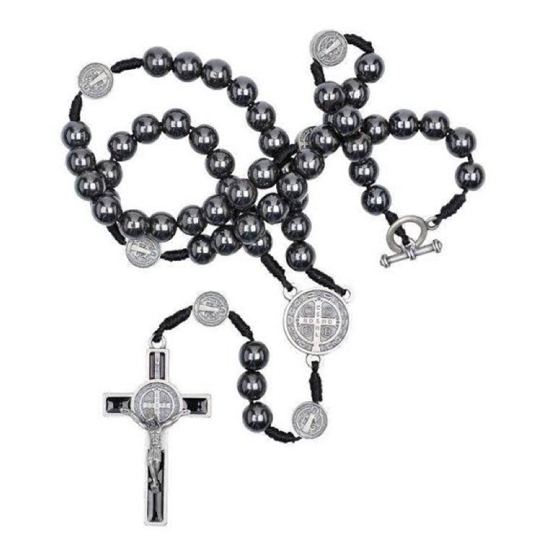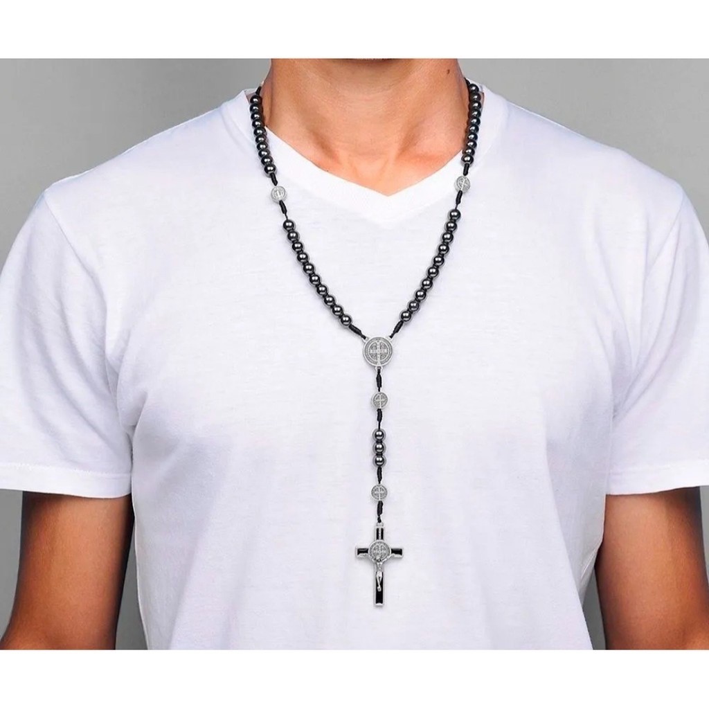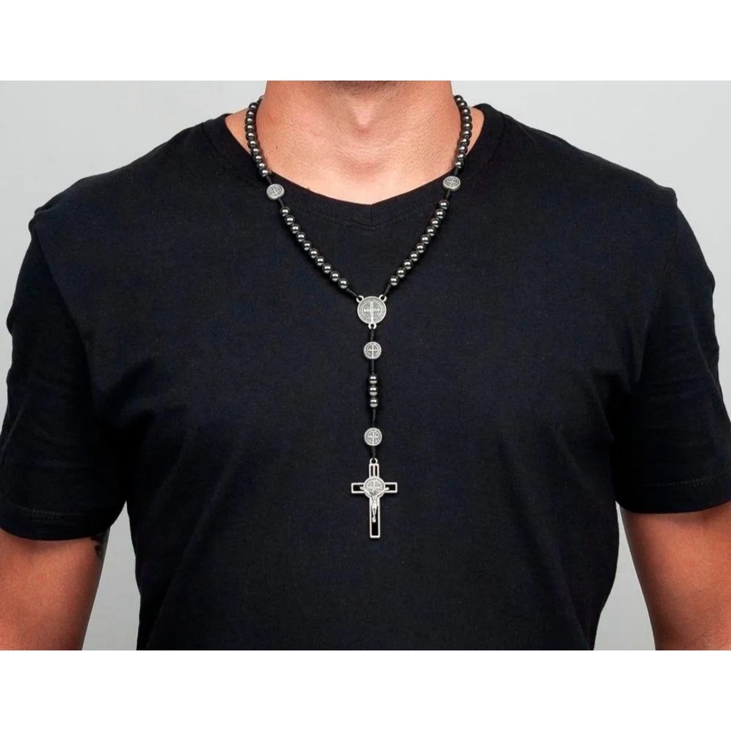 Colar Terço Para Pescoço São Bento em Pedra de Hematita com fecho