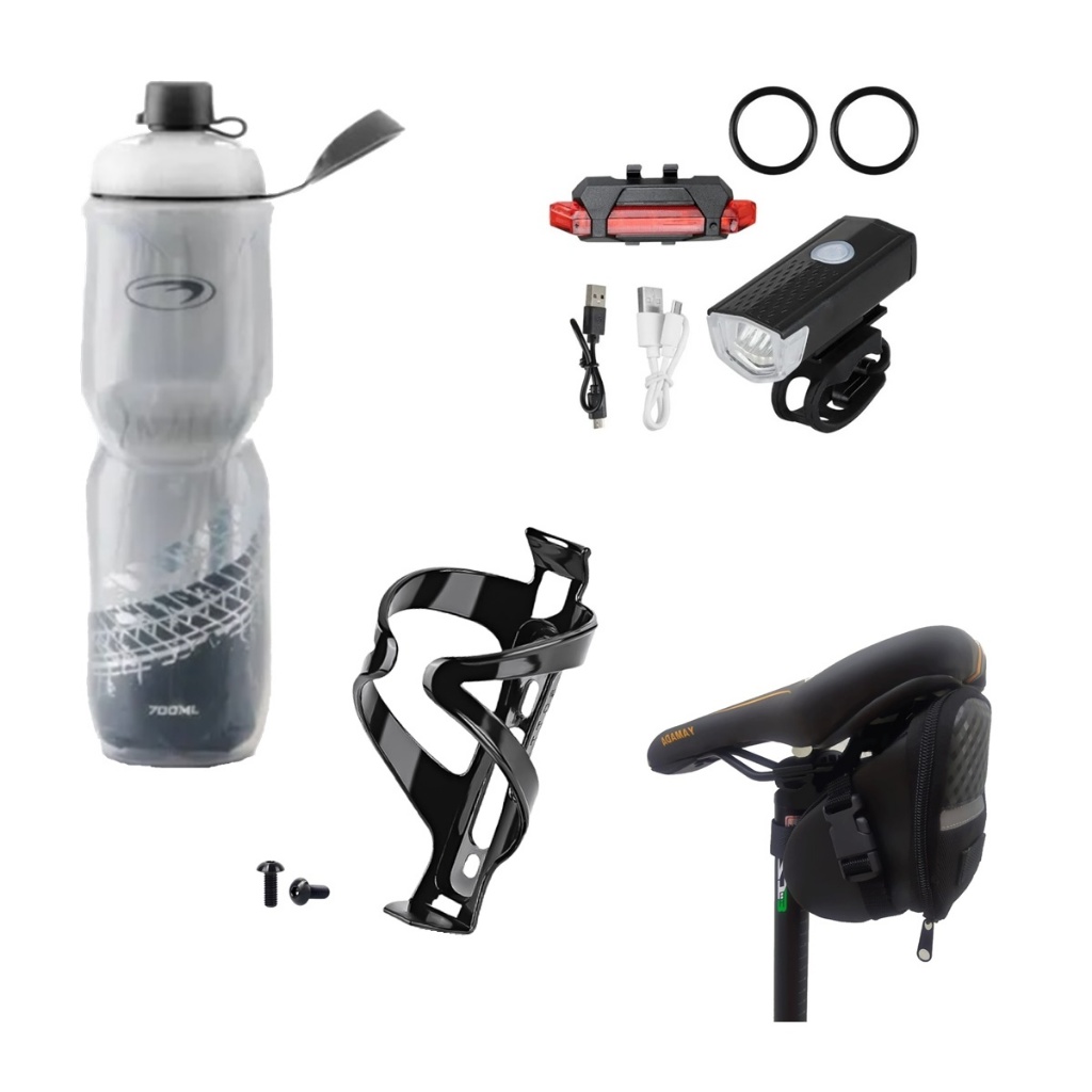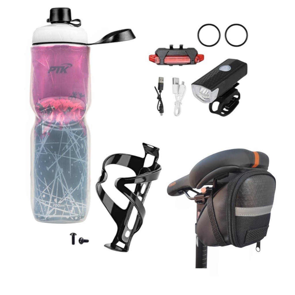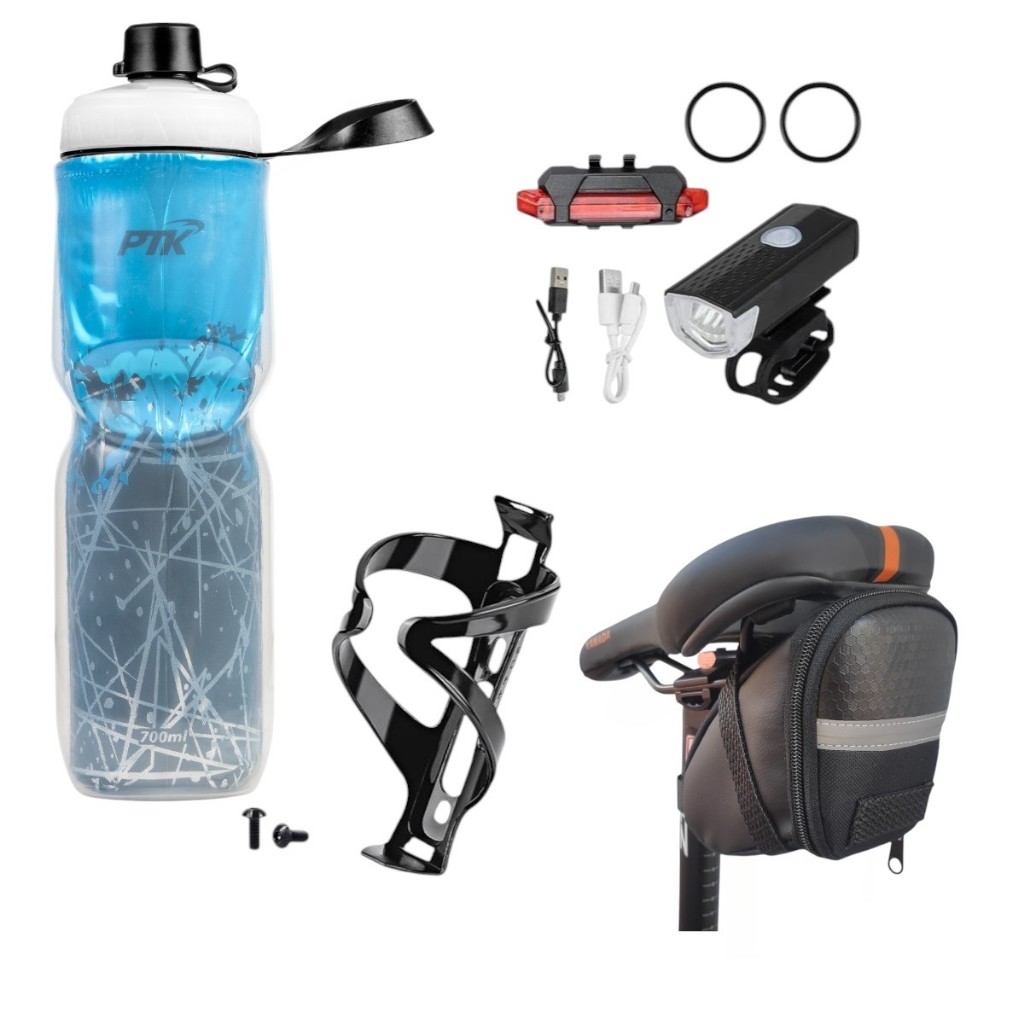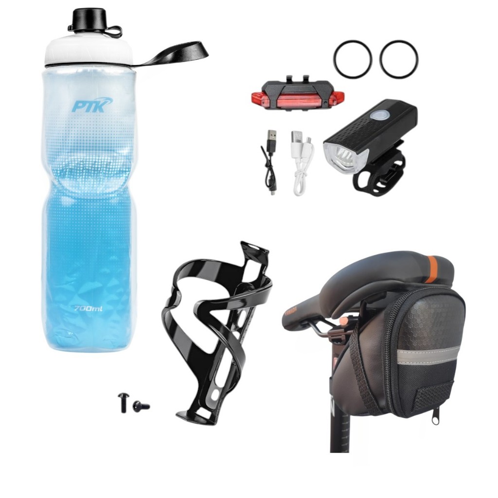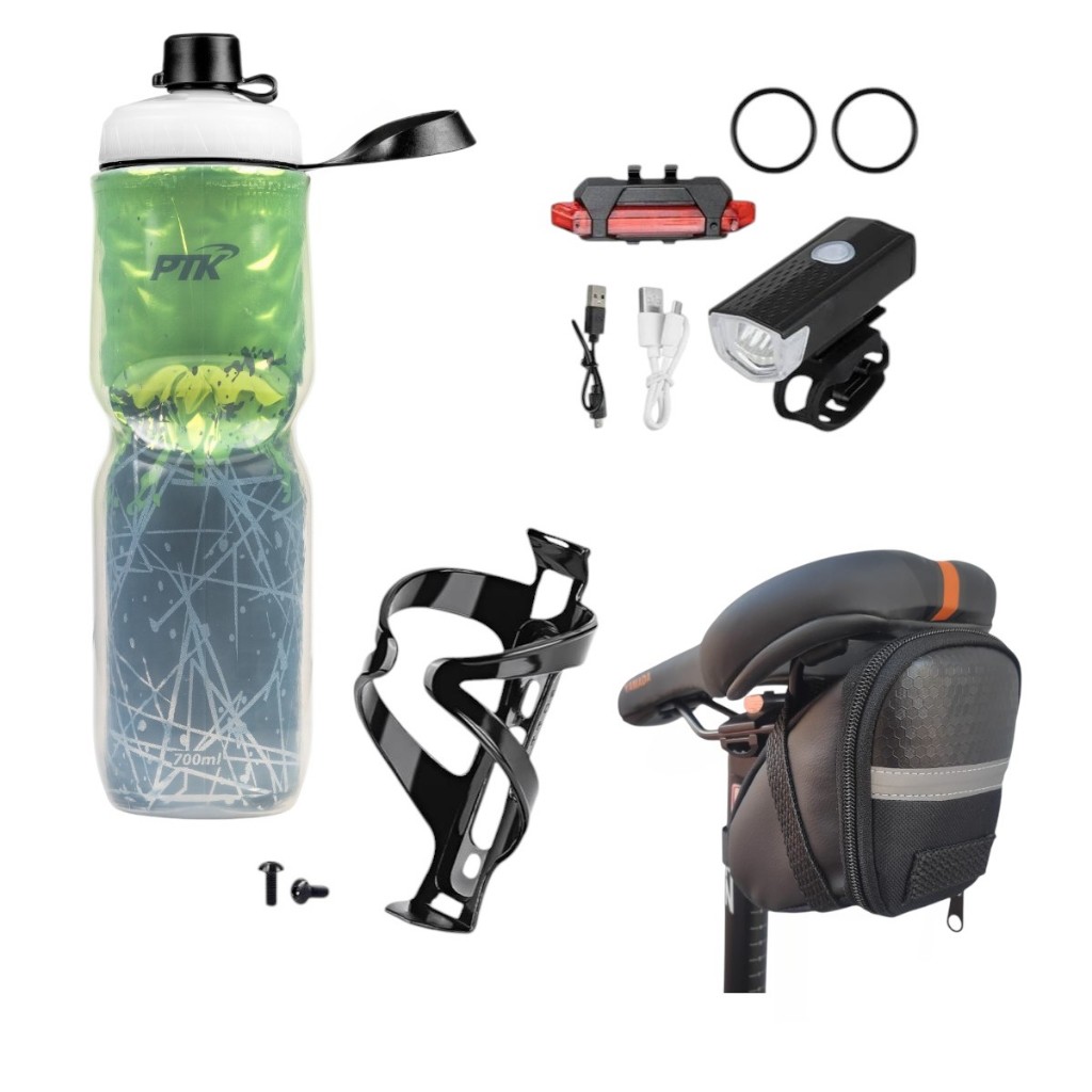 Squeeze Garrafa Caramanhola + suporte com parafosos + kit farol+bolsa de selin