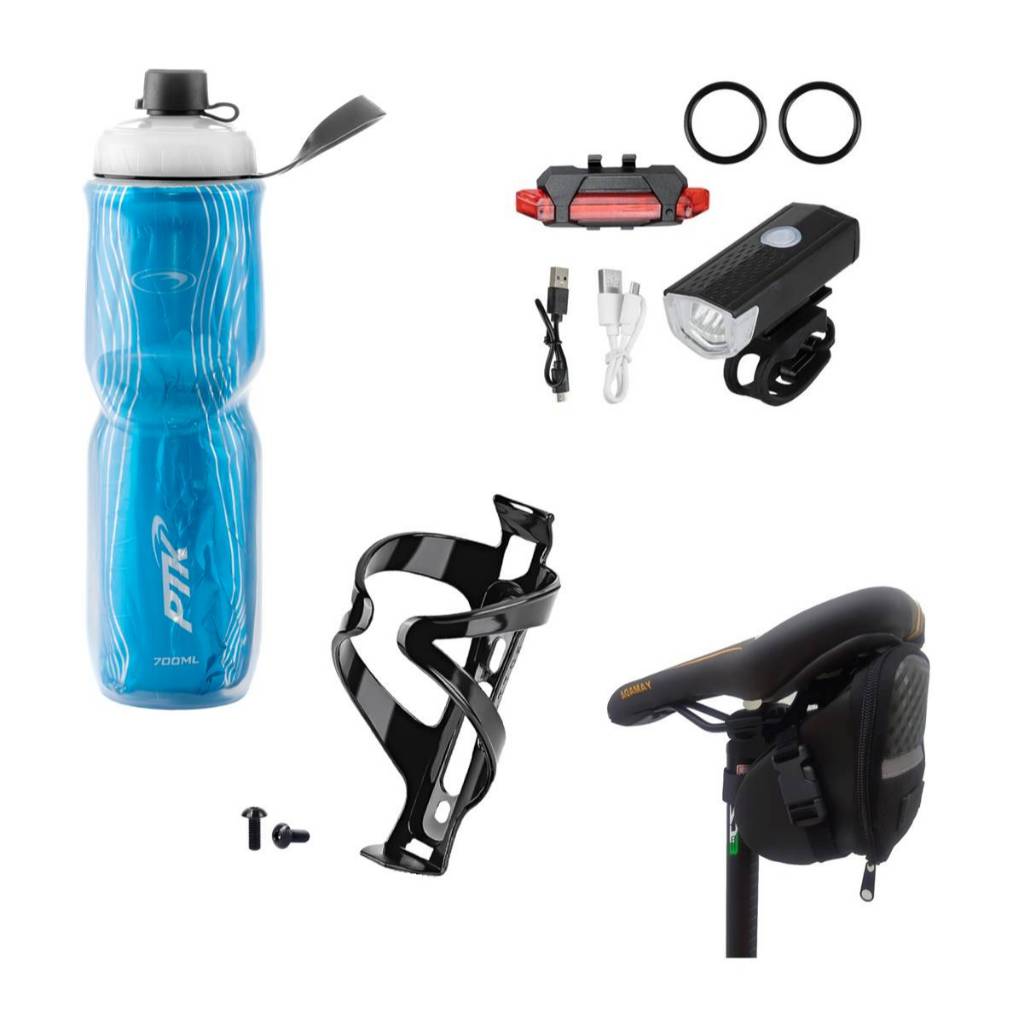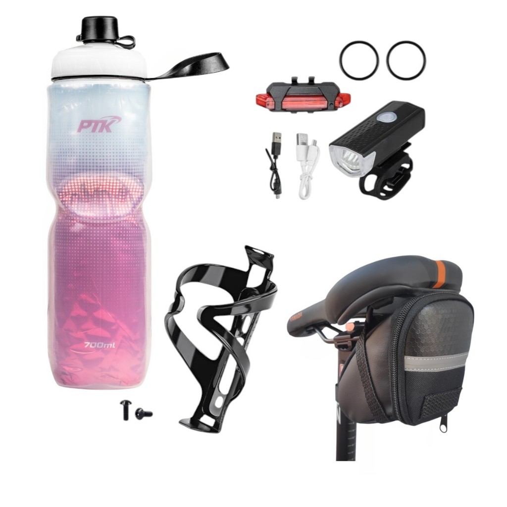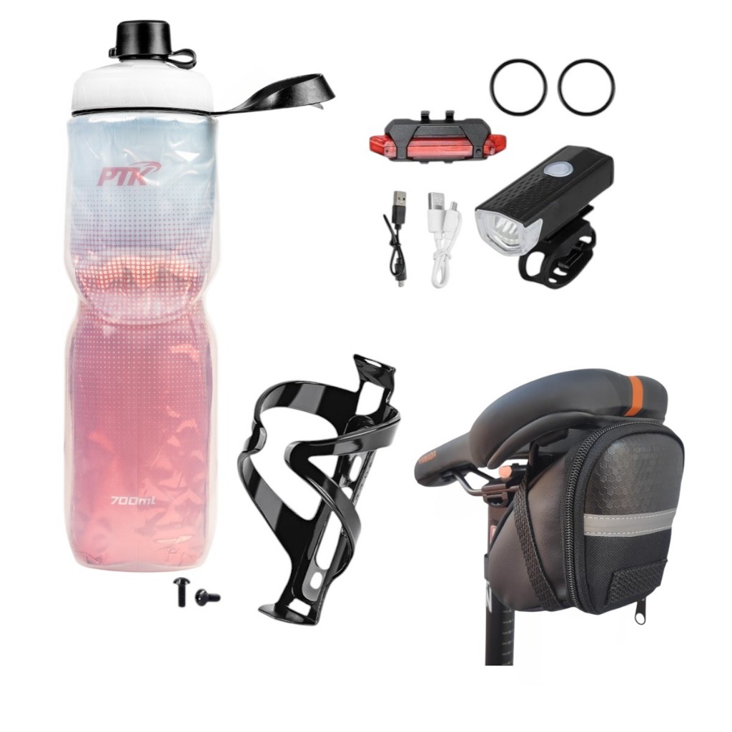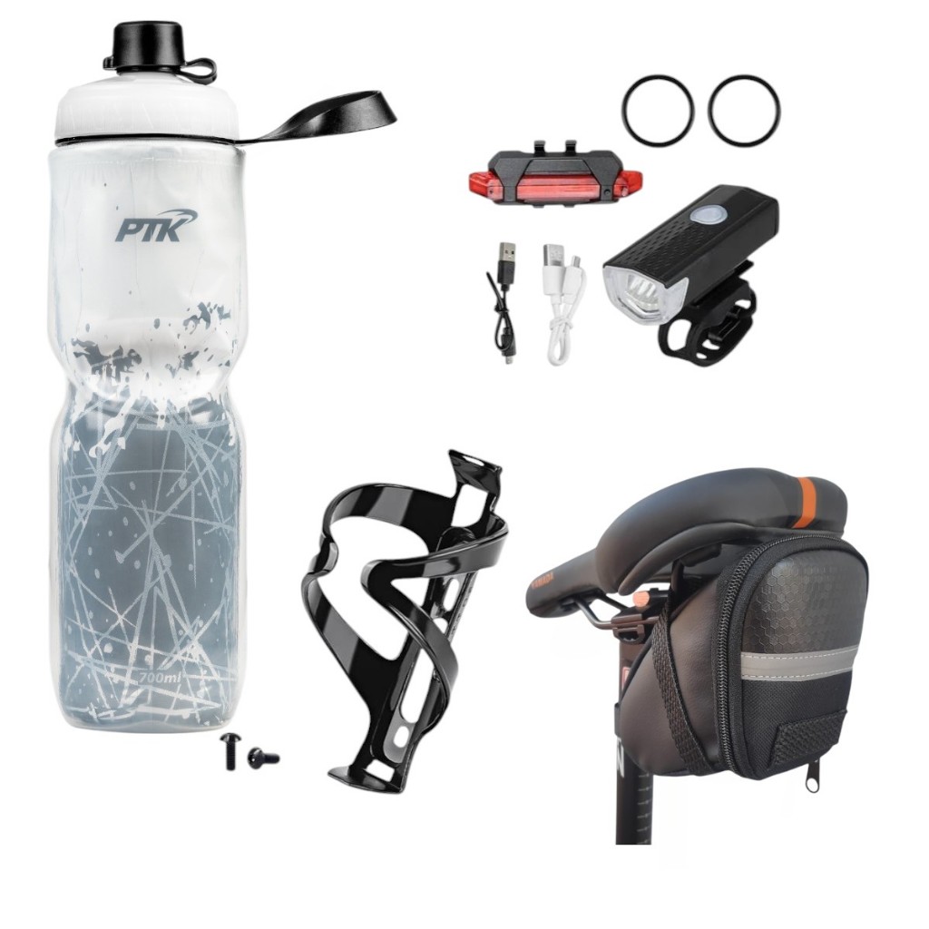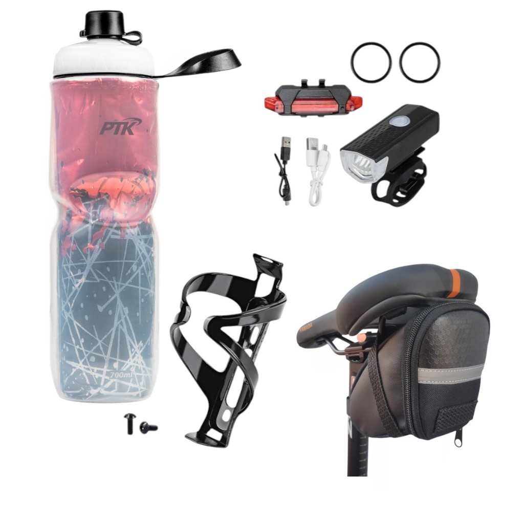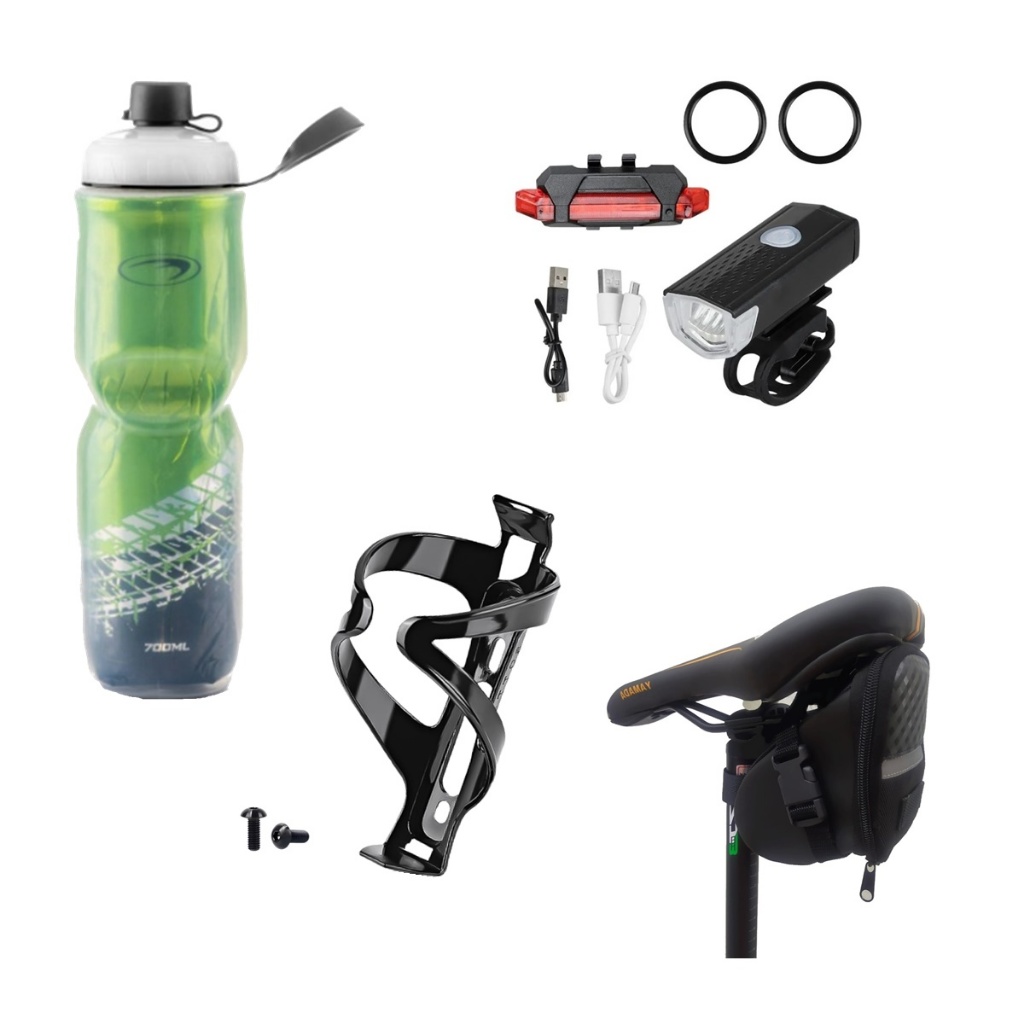 Squeeze Garrafa Caramanhola + suporte com parafosos + kit farol+bolsa de selin