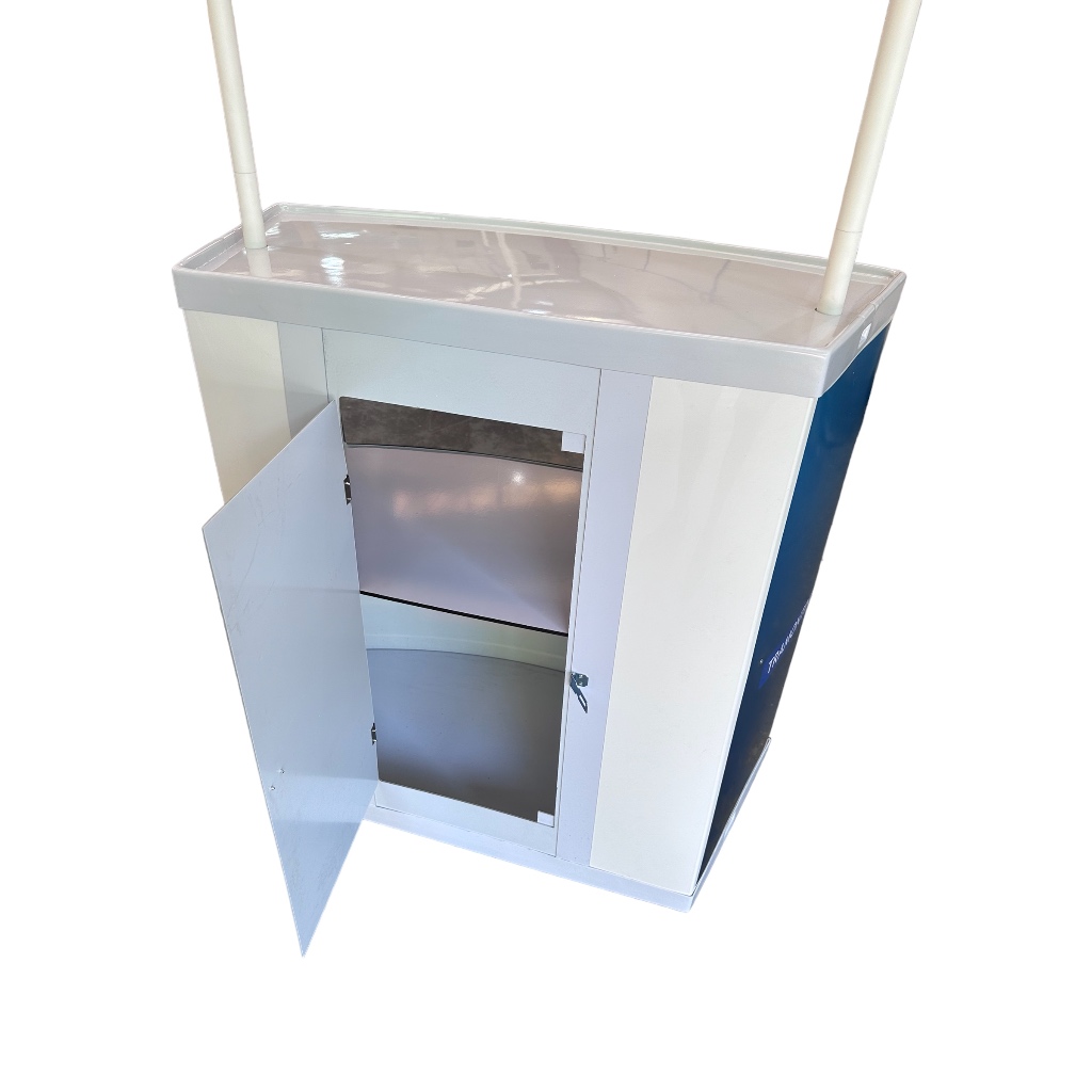 Balcão Promocional PDV com Vitrine + Rodas + Porta + Bolsa e Adesivado com sua Arte