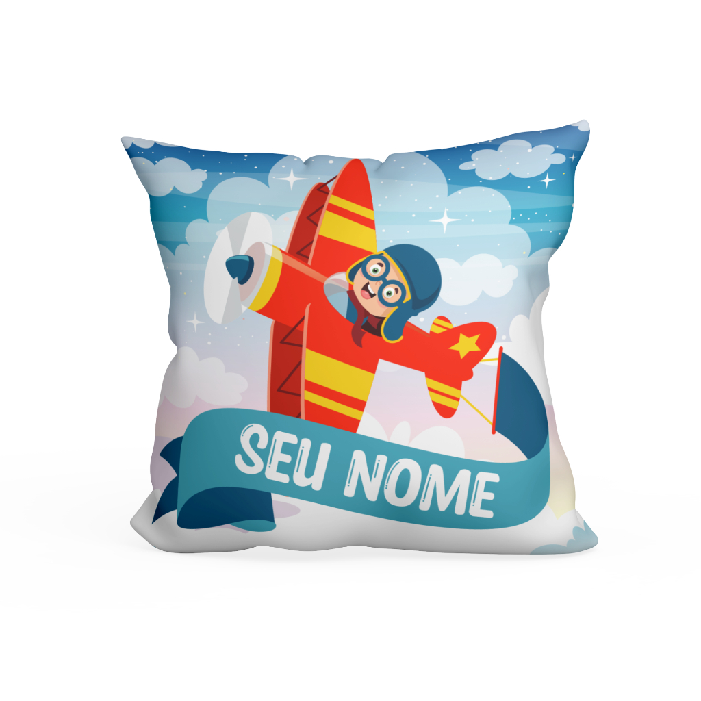 CAPA DE ALMOFADA COM NOME PERSONALIZADO, INFANTIL, AVIÃO, SEU NOME AQUI - TAM 30X30, 40X40, 45X45, 50X50