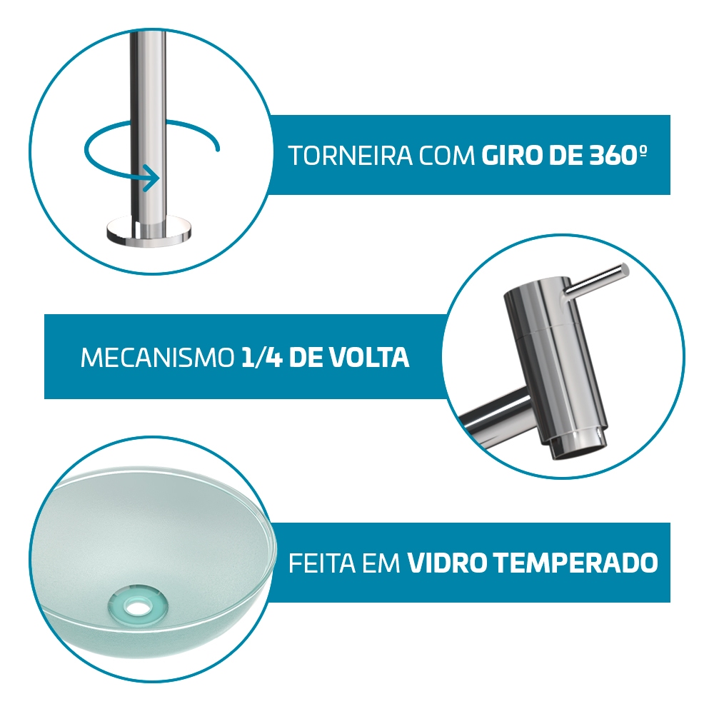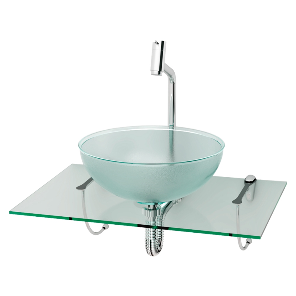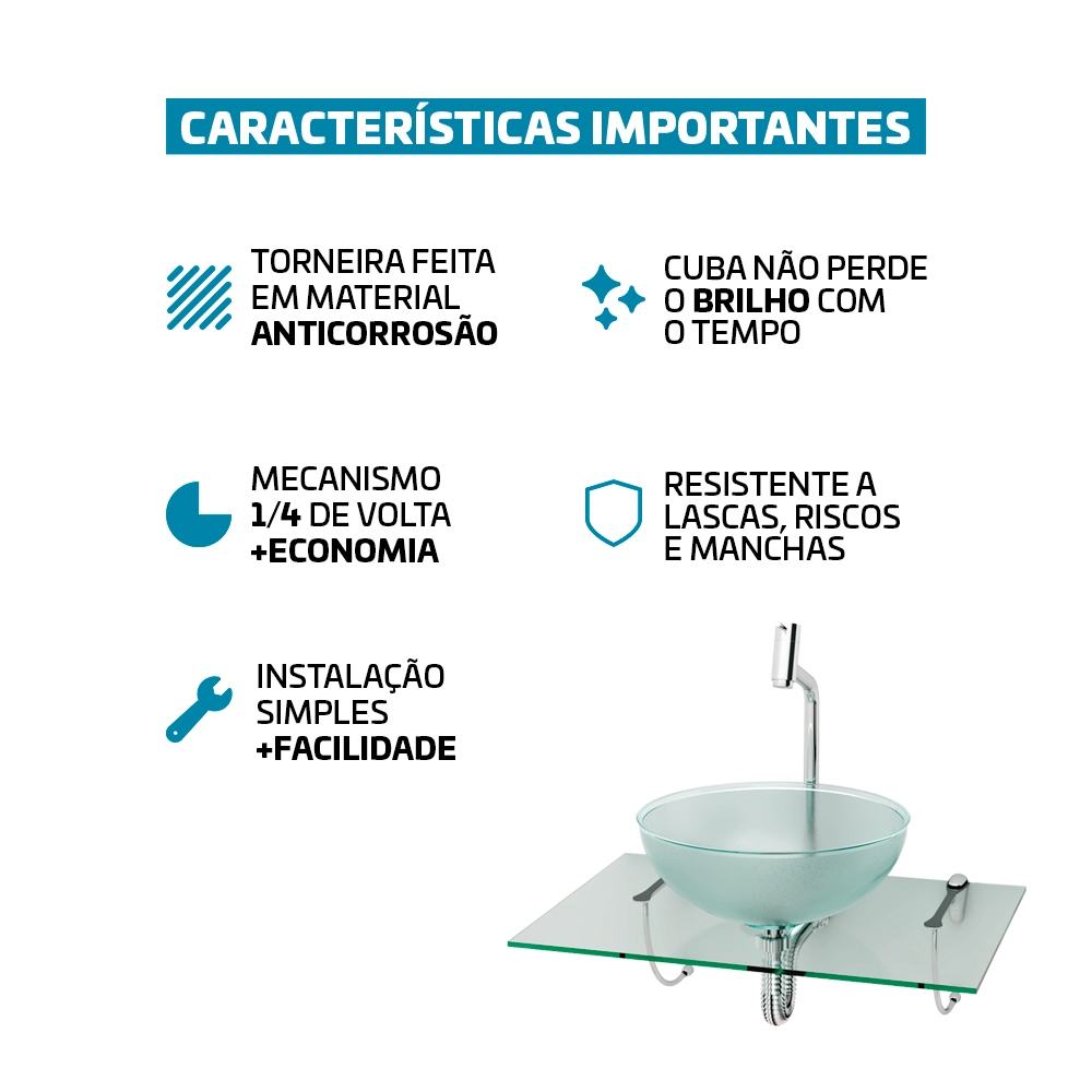 Kit Lavatório Cuba E Tampo De Vidro + Suporte + Torneira Link Bica Alta + Válvula 7/8 + Sifão + Engate Beltempo