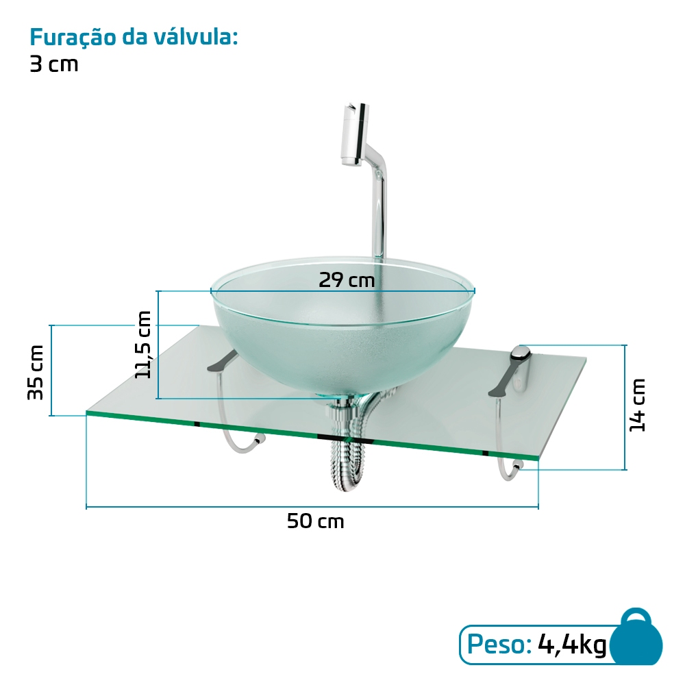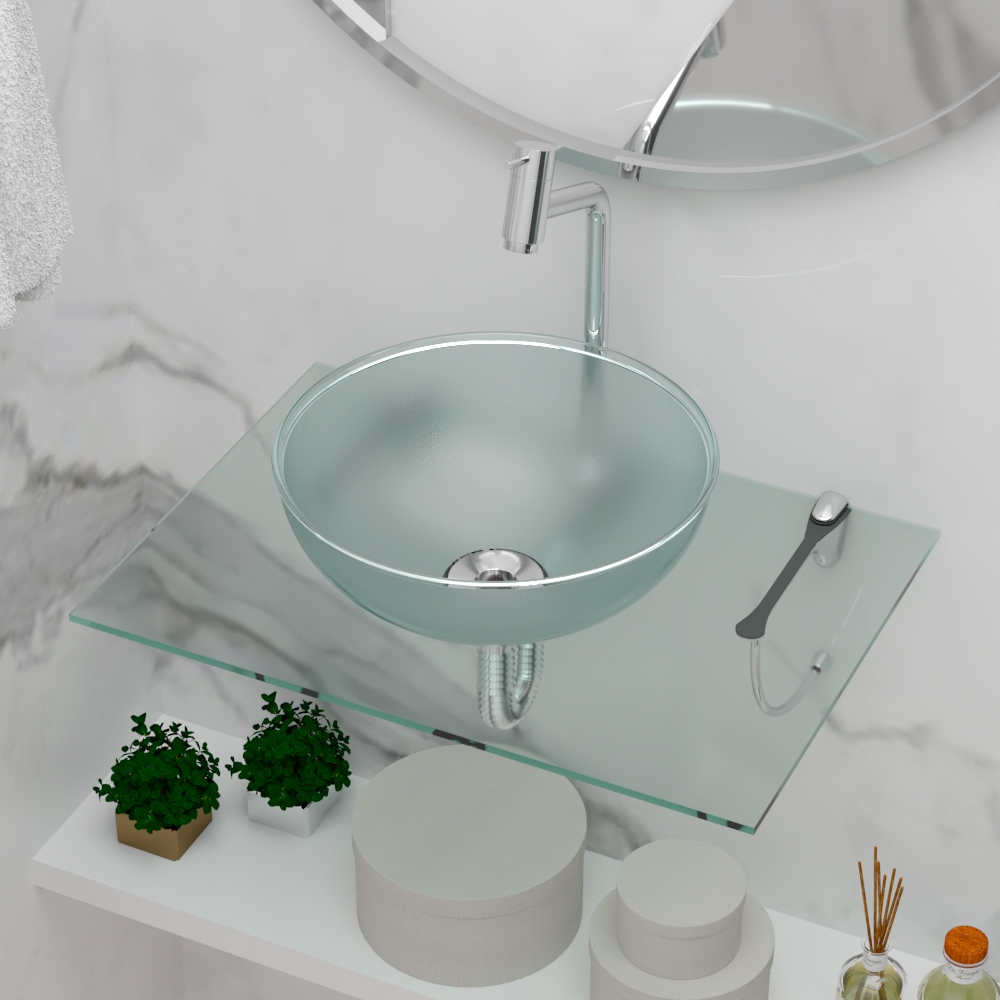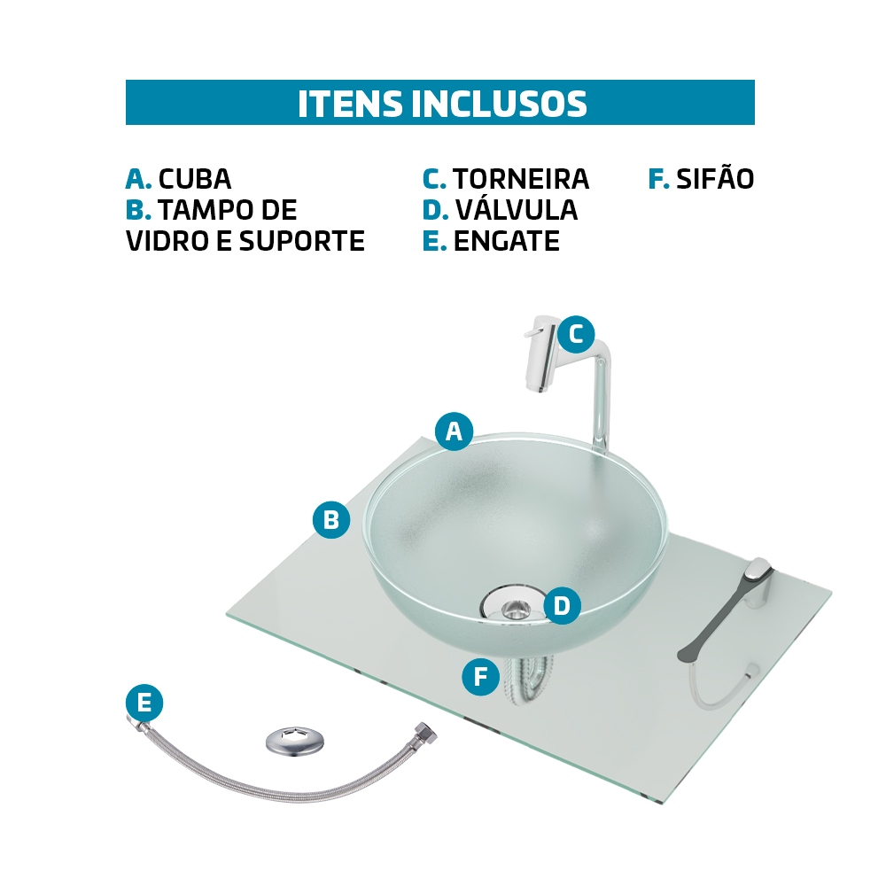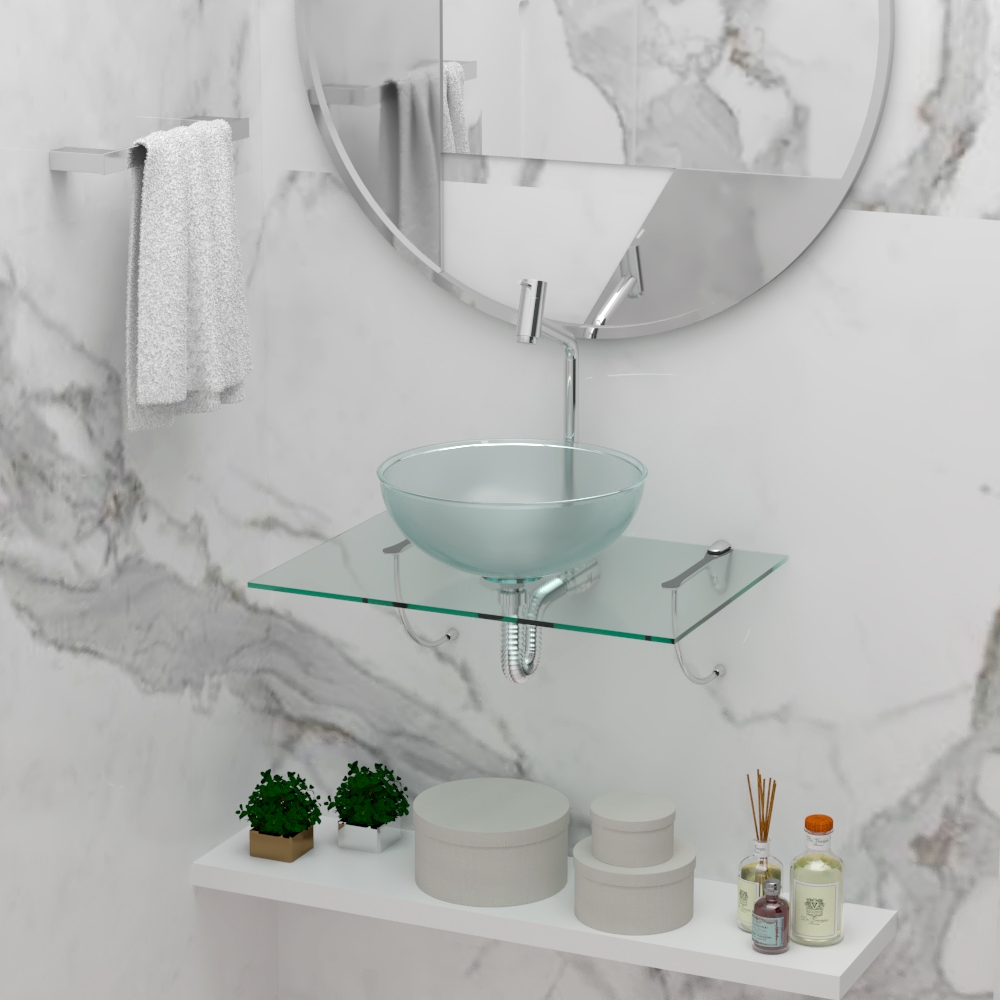 Kit Lavatório Cuba E Tampo De Vidro + Suporte + Torneira Link Bica Alta + Válvula 7/8 + Sifão + Engate Beltempo