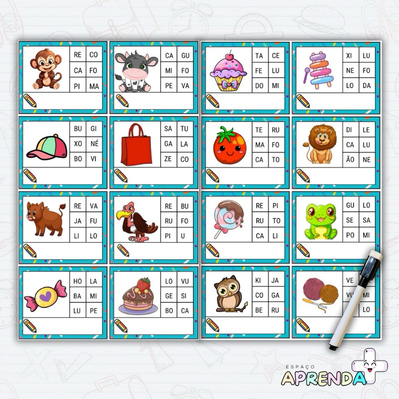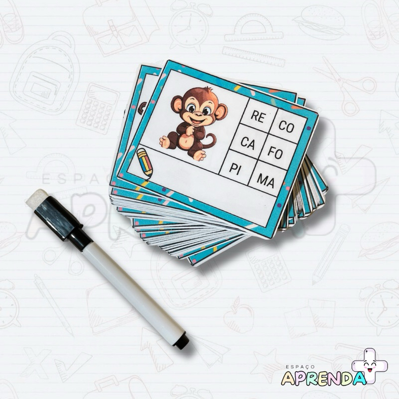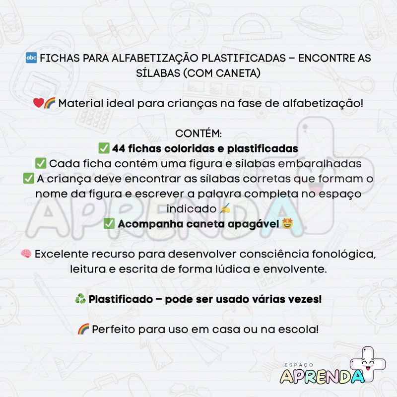 FICHAS PARA ALFABETIZAÇÃO PLASTIFICADAS – ENCONTRE AS SÍLABAS (COM CANETA)