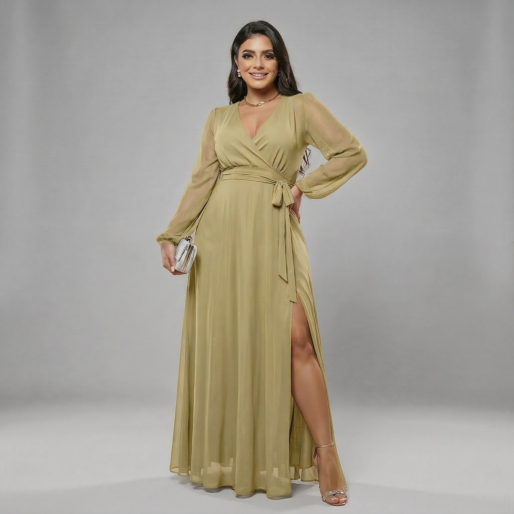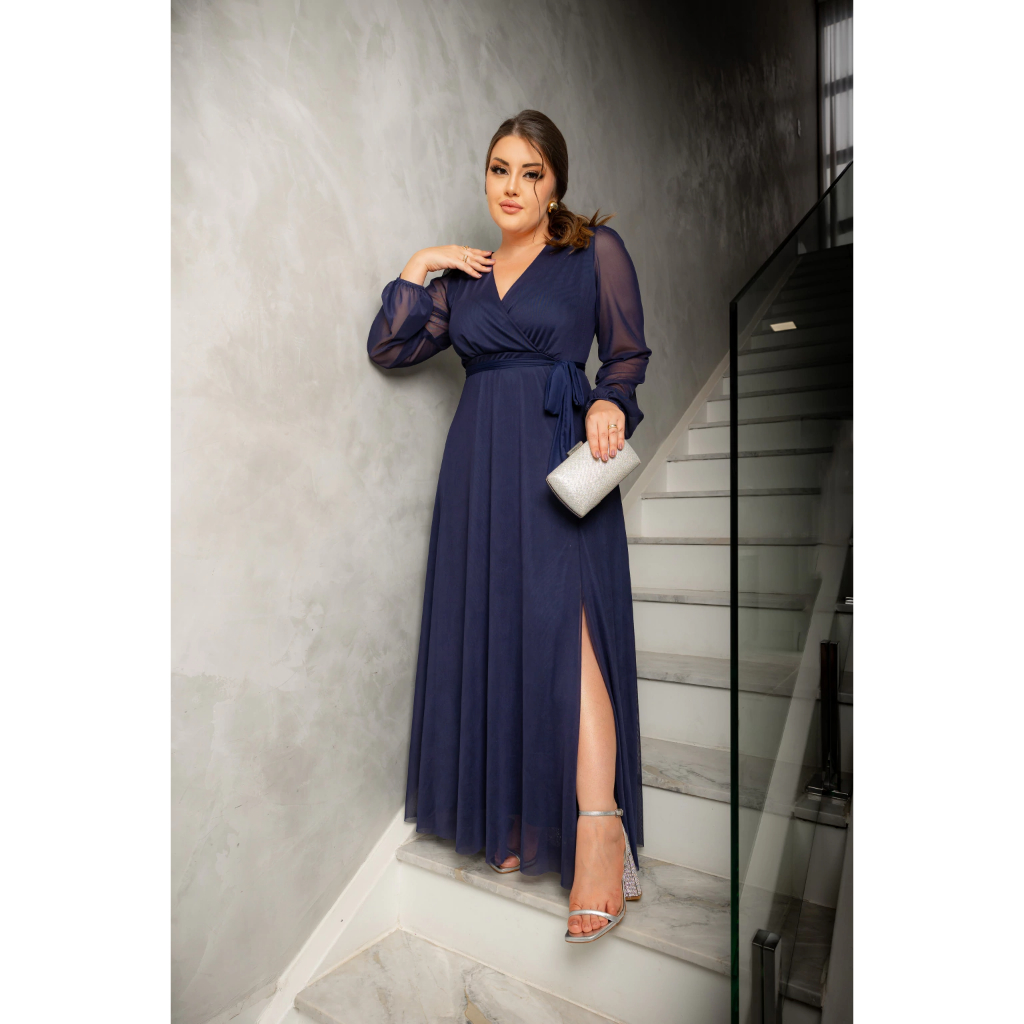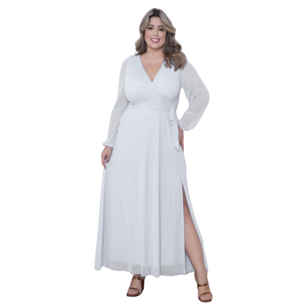 Vestido Longo Tule Com Fenda Elegante Plus Size