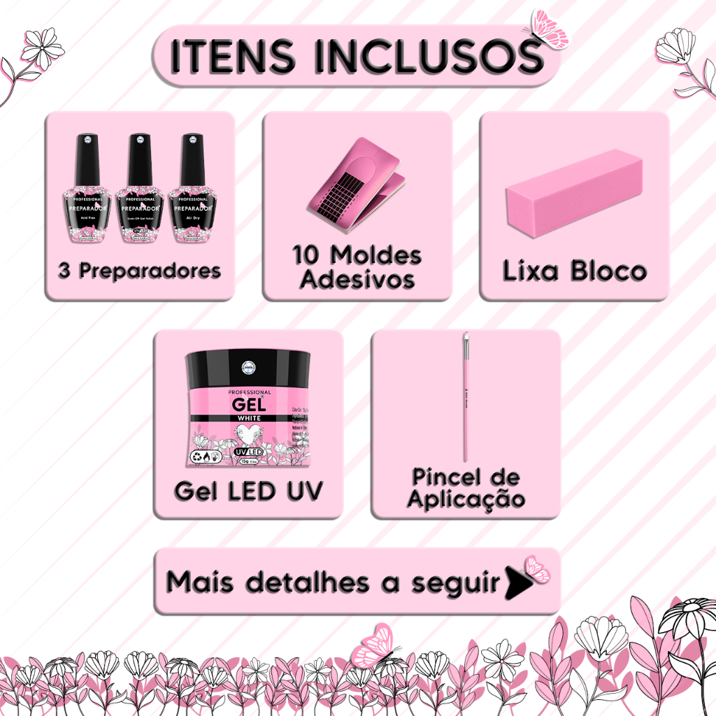 Kit Unha Gel Blindagem + Pincel + 10 Moldes adesivos + Lixa Bloco Fecha poros Polidora