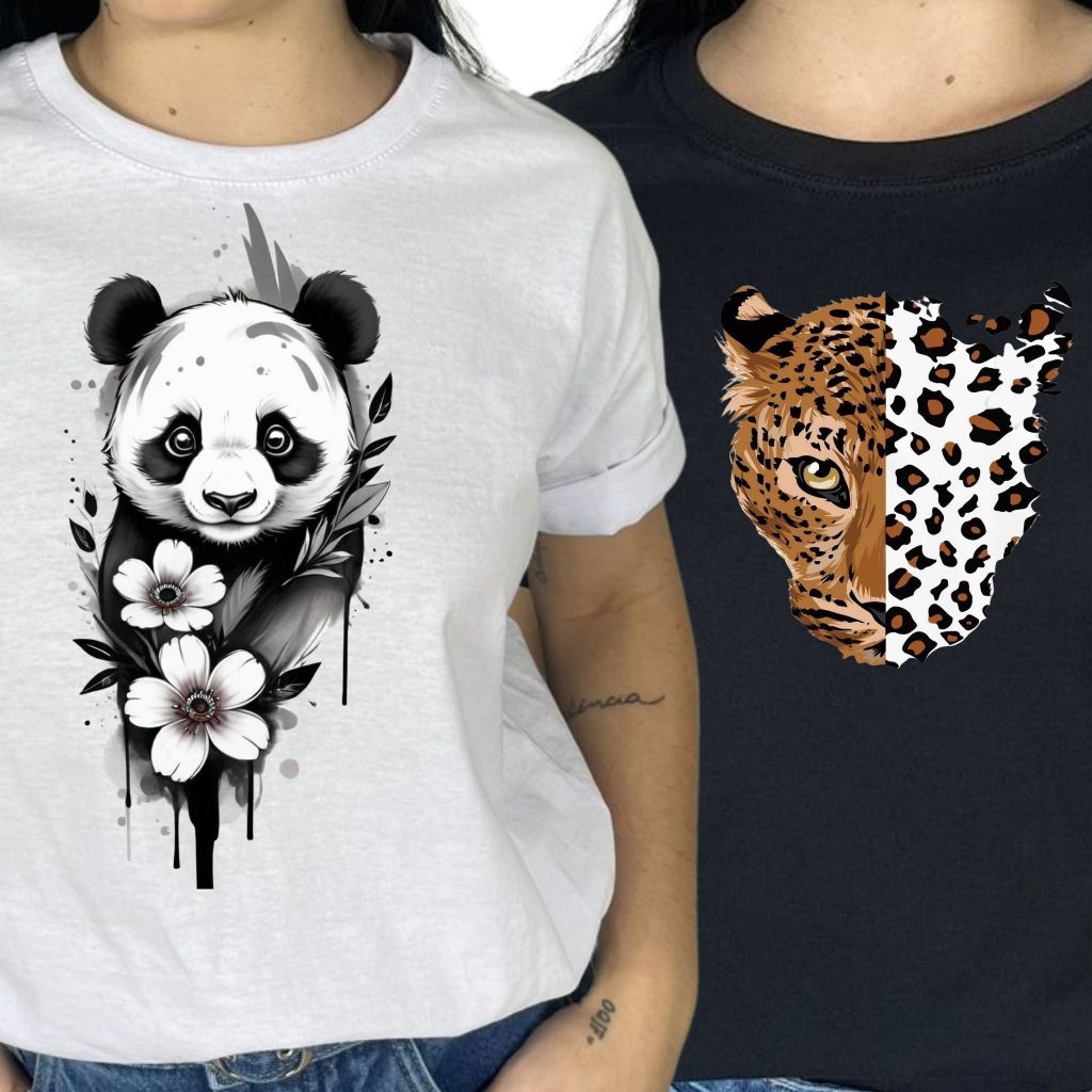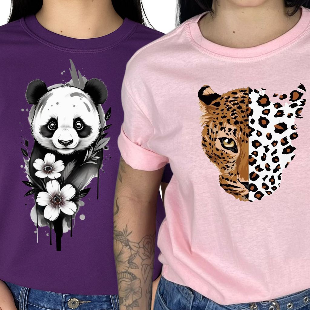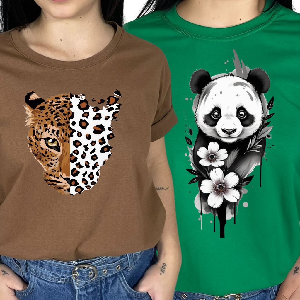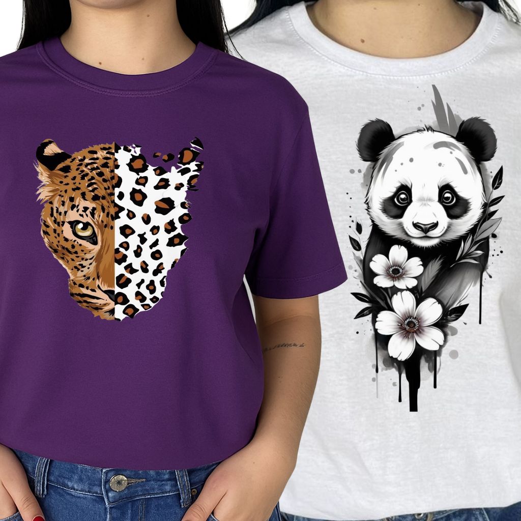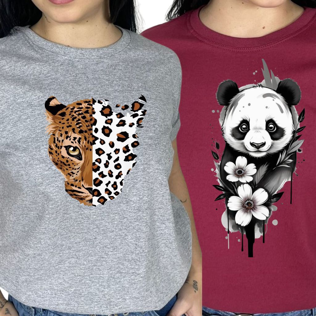 Kit 2 Camisetas Femininas Algodão Estampadas Animal Print T-shirt Tecido Leve Macio Coloridas