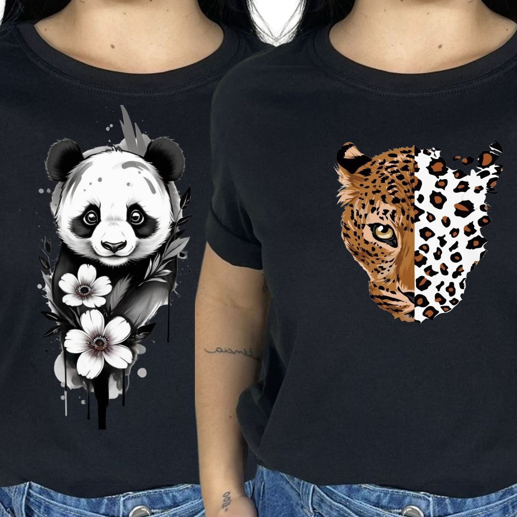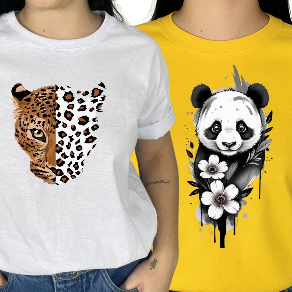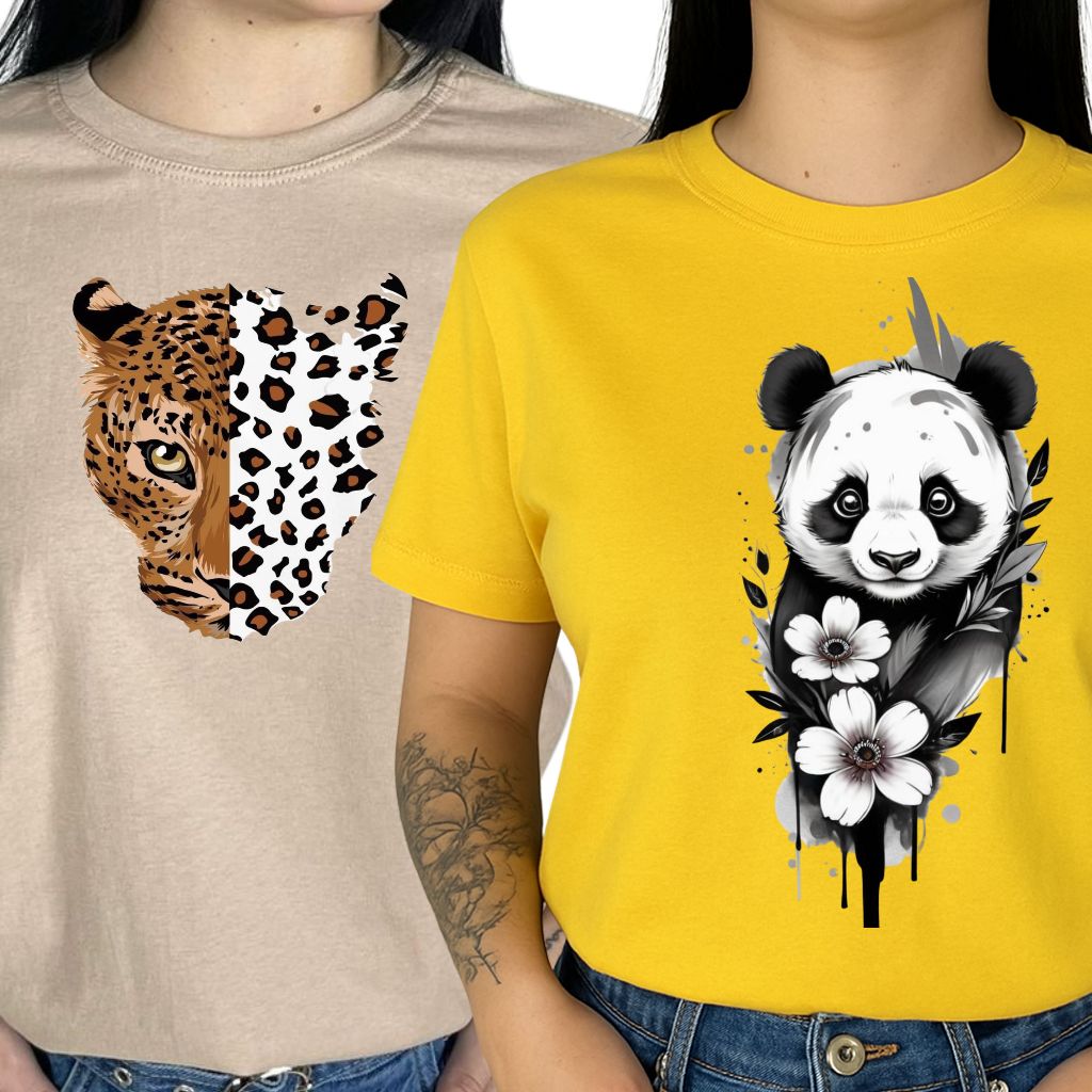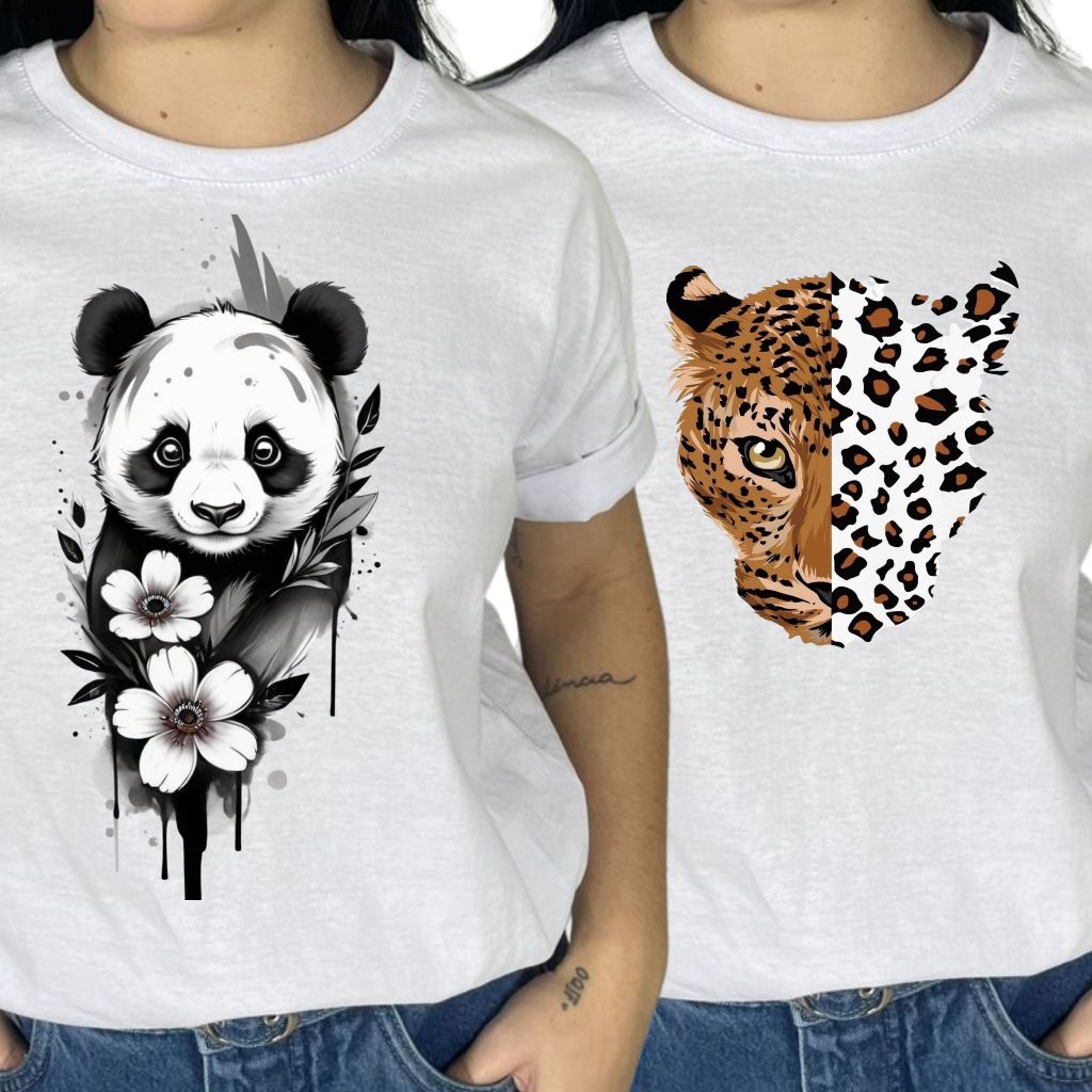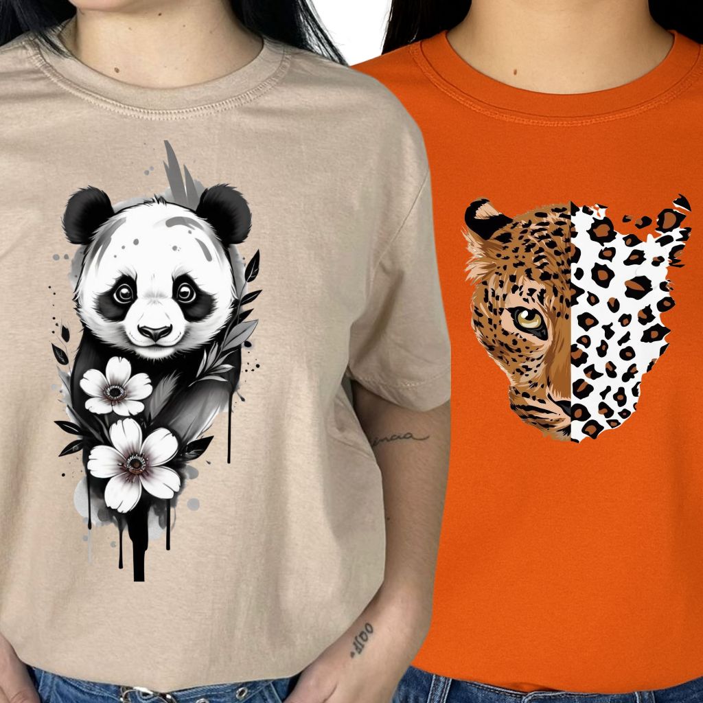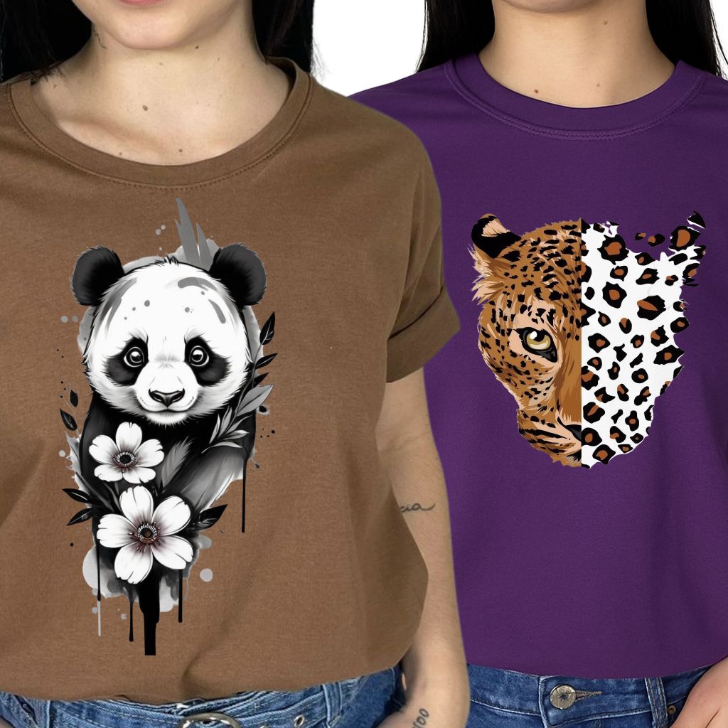 Kit 2 Camisetas Femininas Algodão Estampadas Animal Print T-shirt Tecido Leve Macio Coloridas