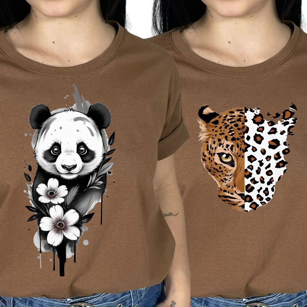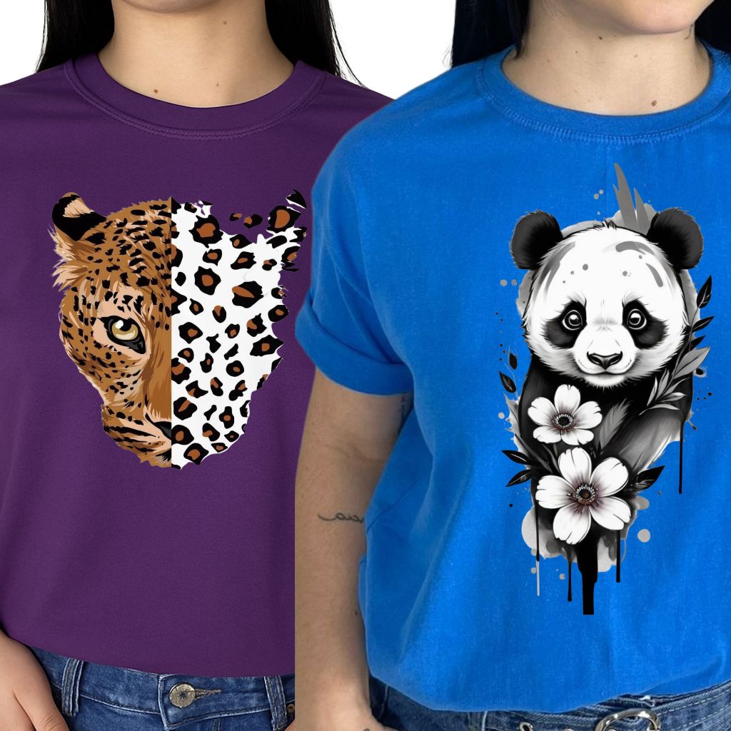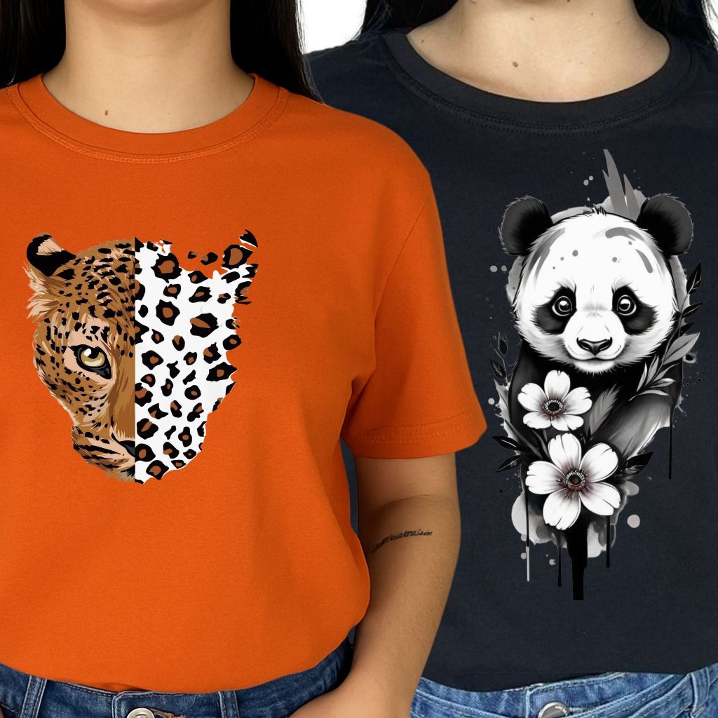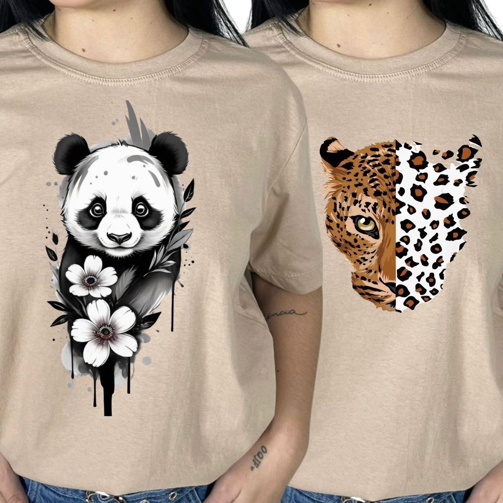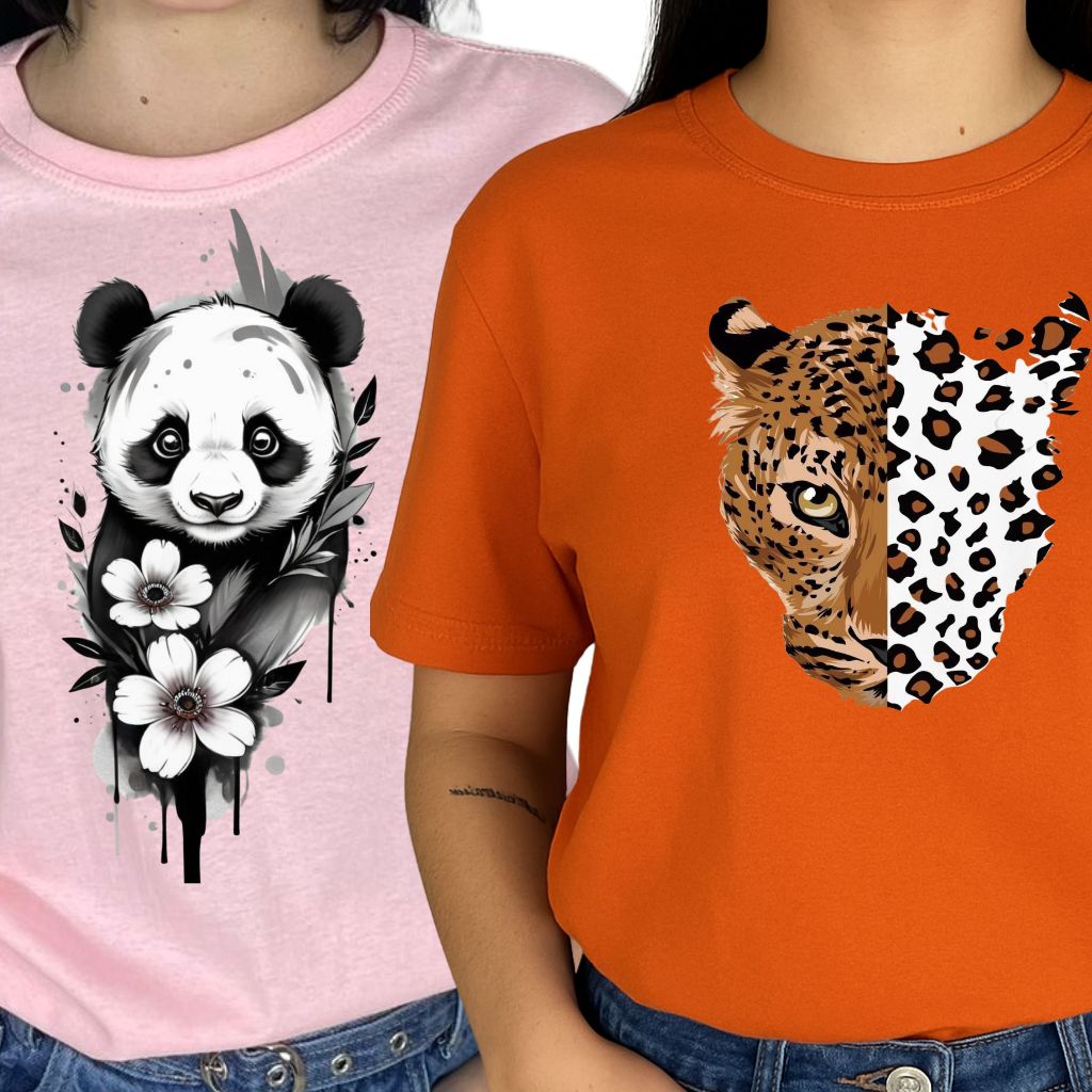 Kit 2 Camisetas Femininas Algodão Estampadas Animal Print T-shirt Tecido Leve Macio Coloridas