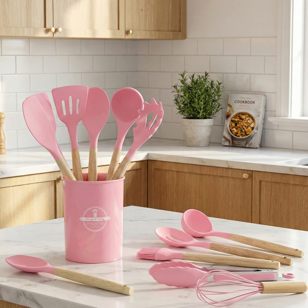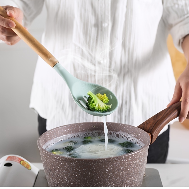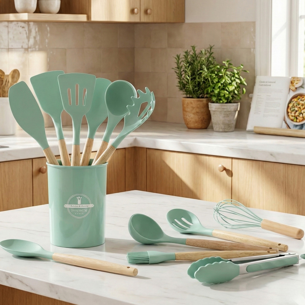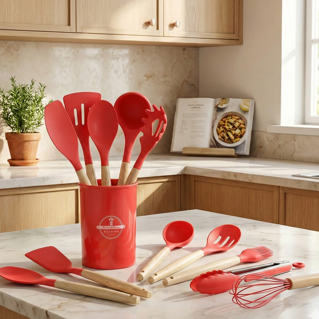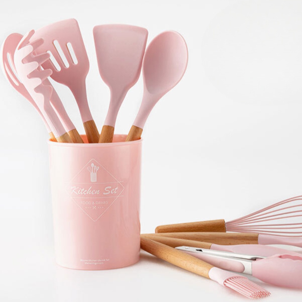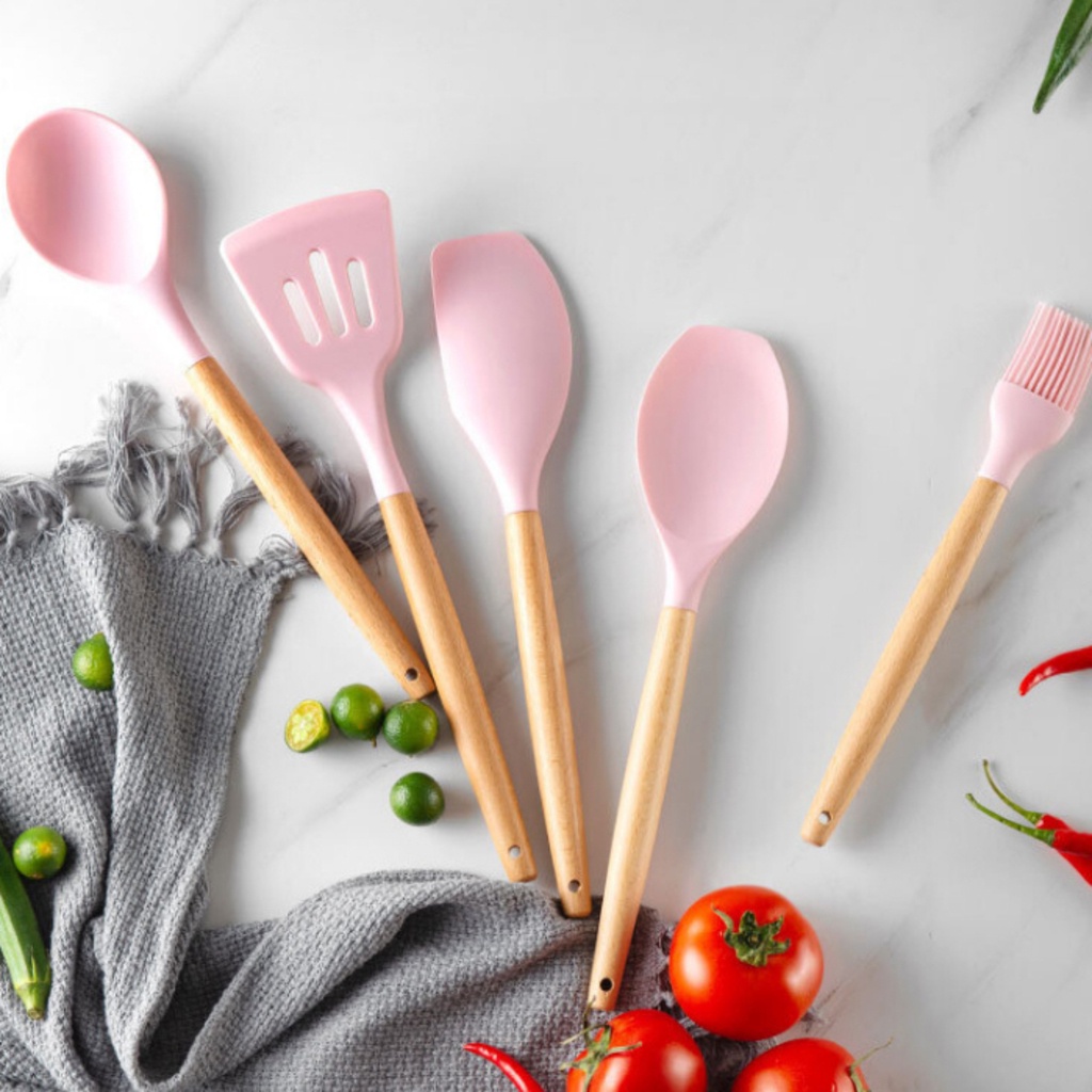 Kit 12 Peças Utensílios Cozinha Silicone Maciço Com Cabo De Madeira Colheres Super Praticas