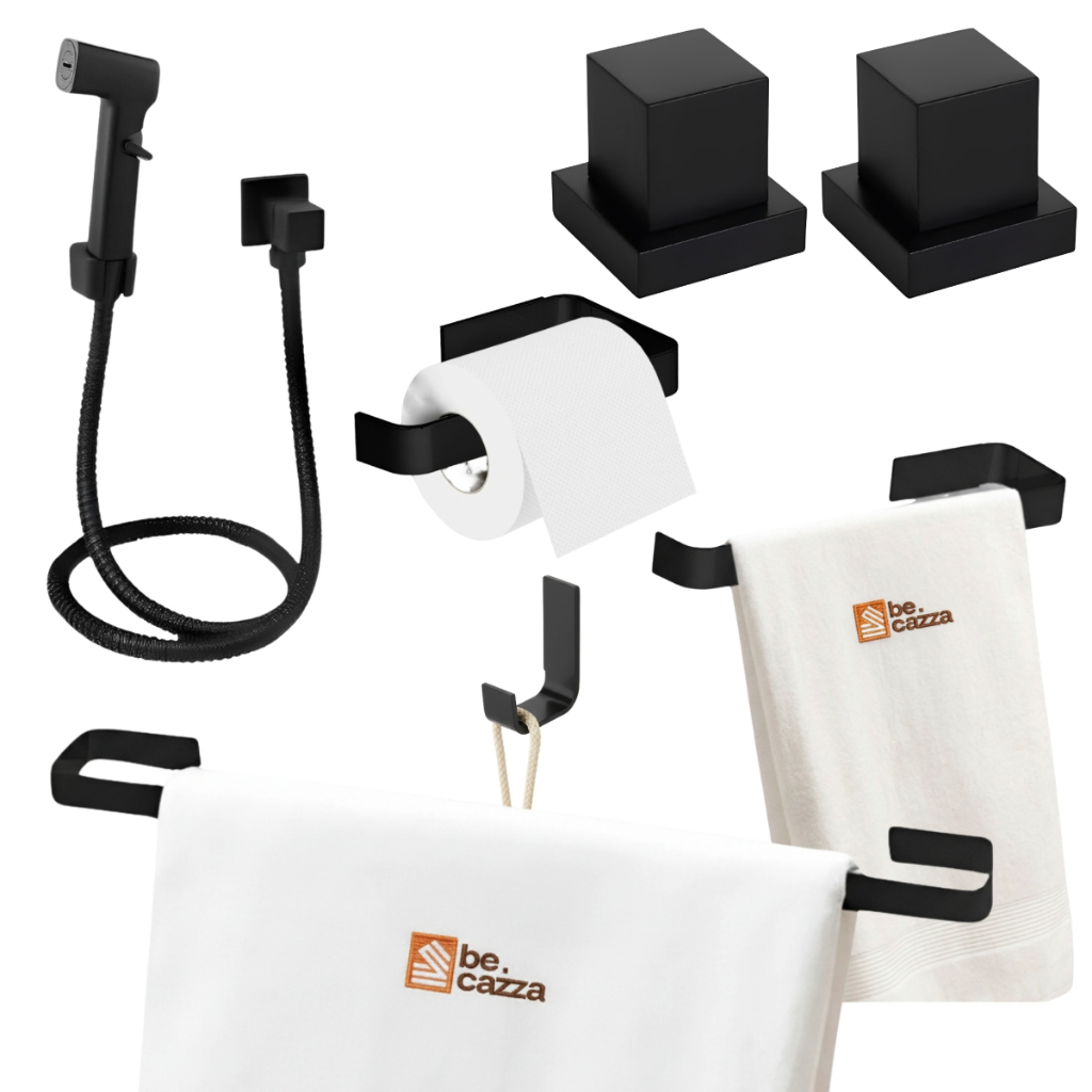 Jogo de Acessórios Para Banheiro Quadrado Preto Fosco + 1 Ducha Higiênica + 2 Acabamento Padrão Deca