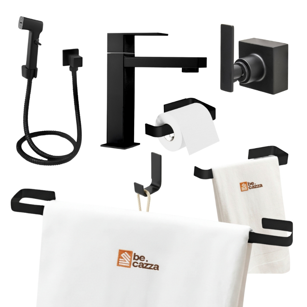 Kit Acessórios de Banheiro Preto Fosco + Acabamento Registro Deca + Ducha +Torneira Preto Metal Luxo