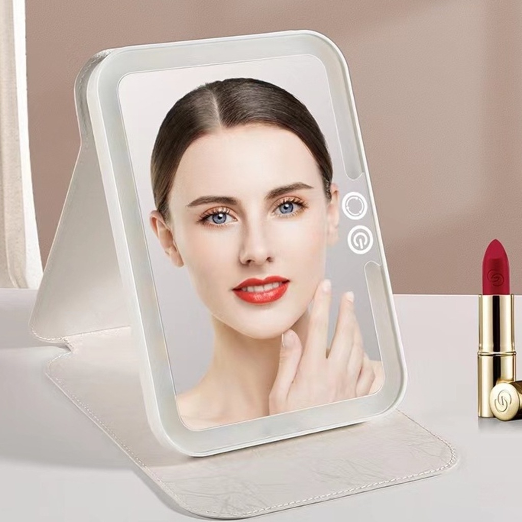 Espelho Decorativo Led Maquiagem Estética Recarregável Quadrado Capa De Couro Portátil Dobrável
