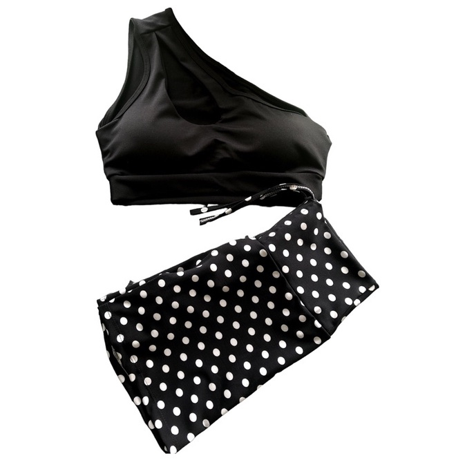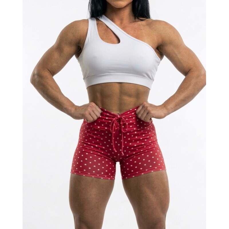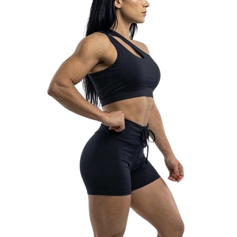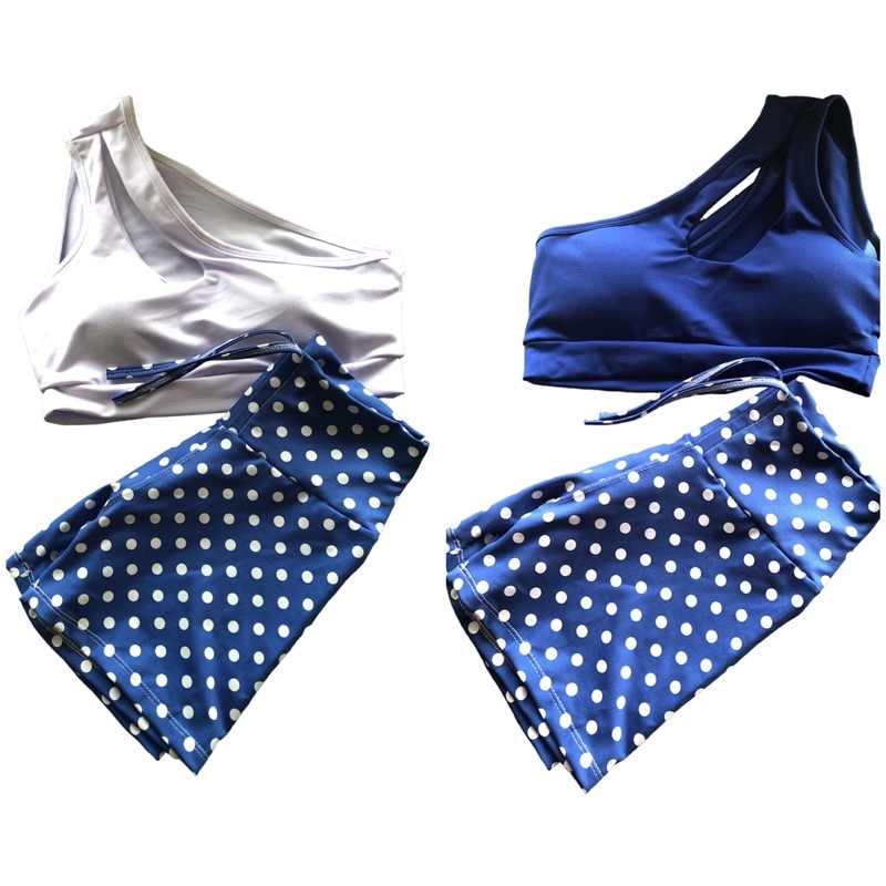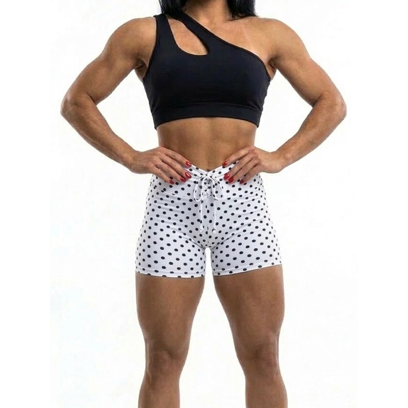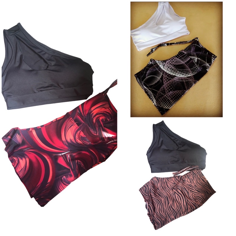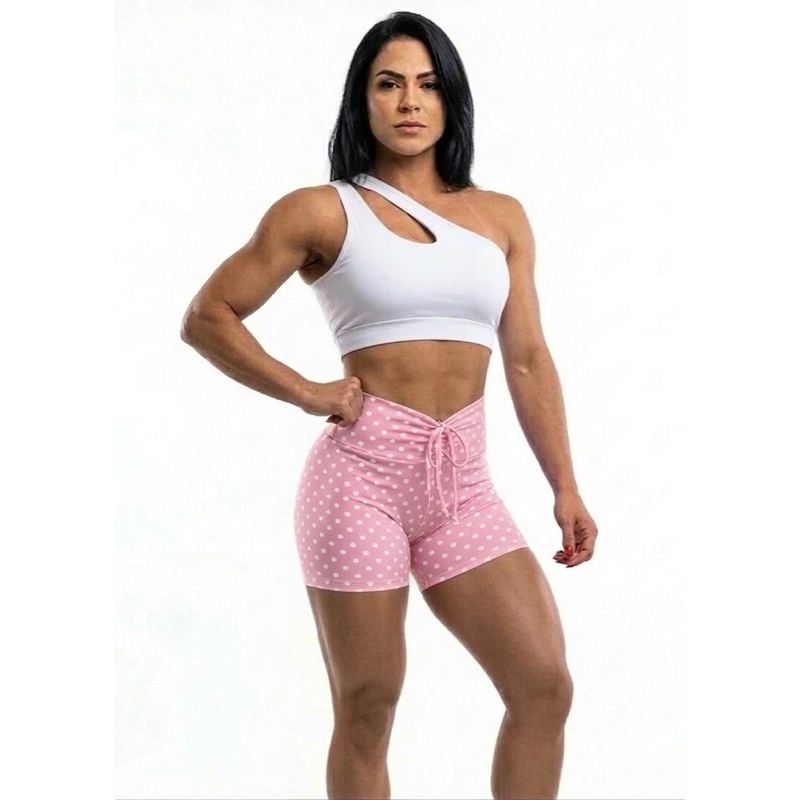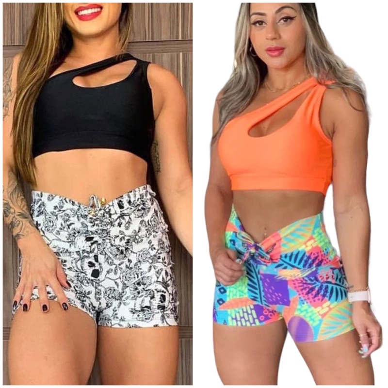 Conjunto roupa de malhar short cordão estampas e poa e top gota de um ombro so liso com bojo de academia tecido suplex