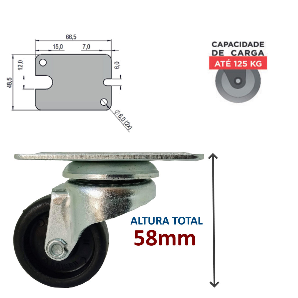 4 Rodizio Rodinha para Freezer Placa C Recorte Giratório Dupla Roda 41mm Nylon- Suporta até 110Kg