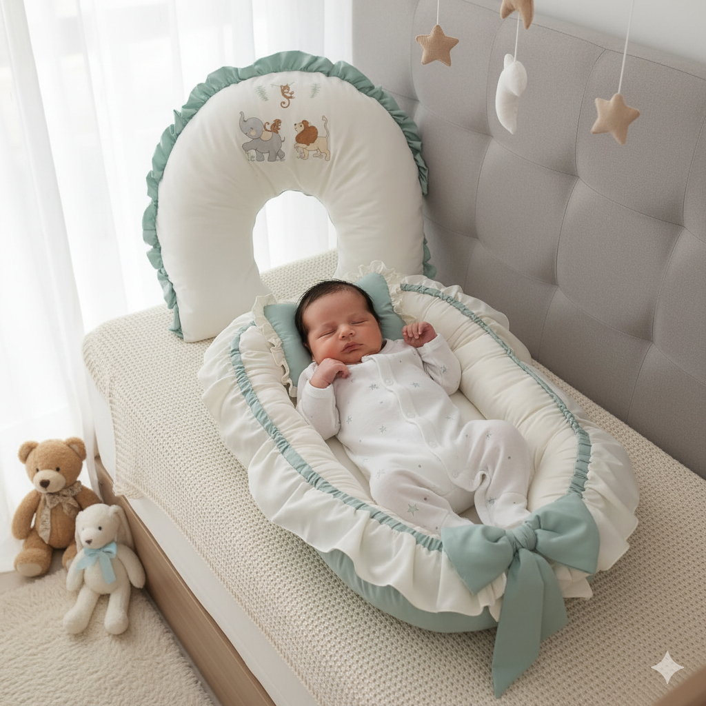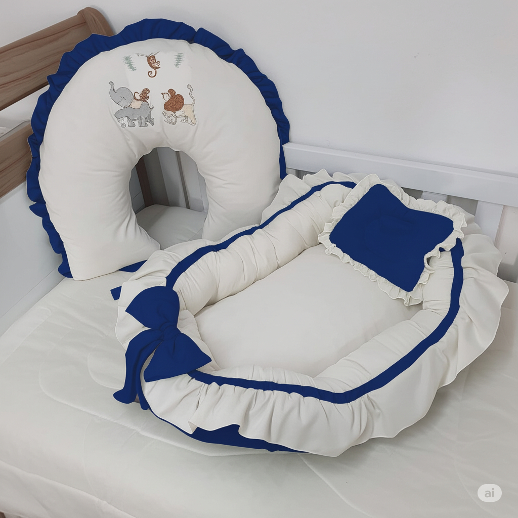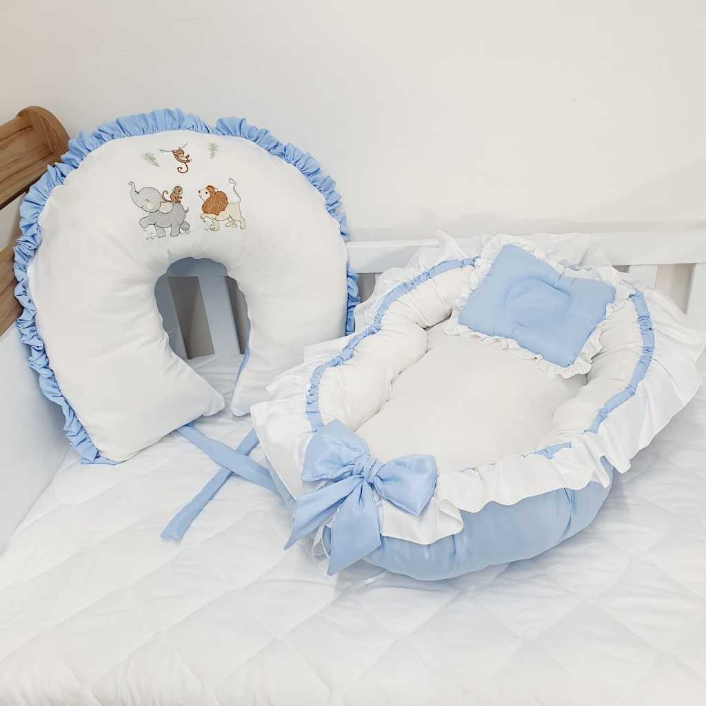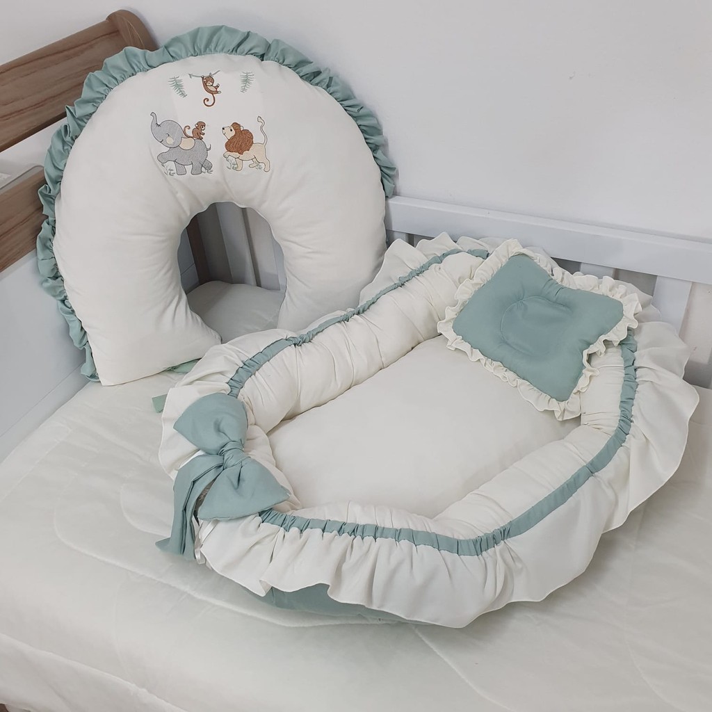 Ninho Redutor De Berço + Almofada de Amamentação com Babado e amarris Meninos meninas REINO ANIMAL