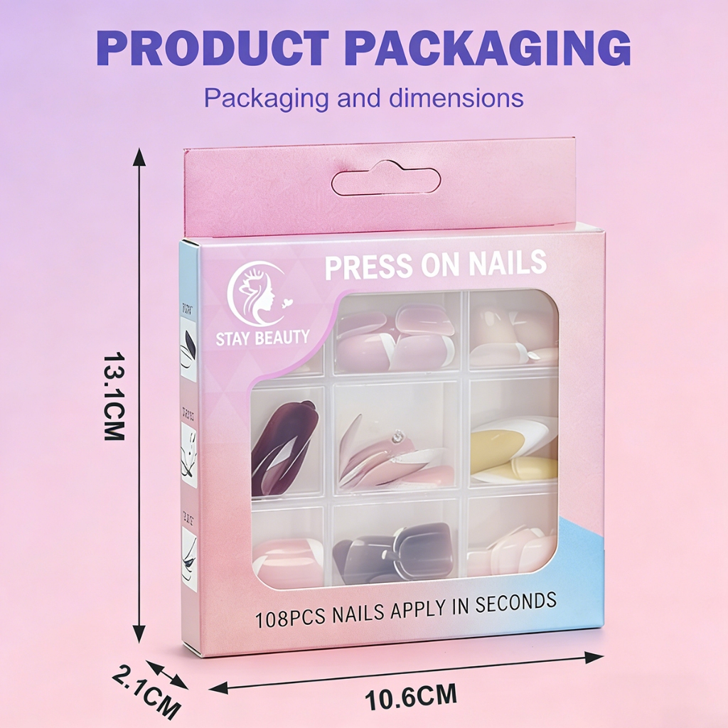 108 Pçs/Caixa Pontas De Unhas Completas Cobertura Completa Imprensa Em Falsas 9 Cores e 10 Tamanhos